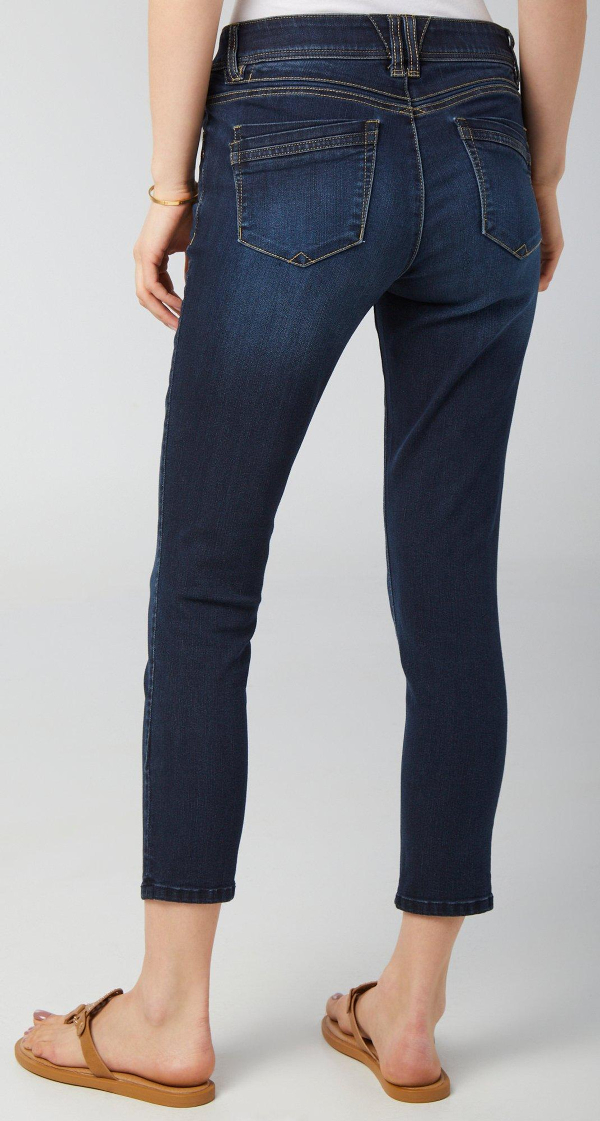 Step out in style with the Roll Cuff Crop Jeans. Featuring classic 5-pocket styling, these jeans offer both practicality and a timeless look. The roll cuff hem adds a trendy touch, making them perfect for any casual outing. Comfortable and versatile, these crop jeans are a must-have addition to your wardrobe. Inseam measures approximately 25 in. Fabrication is 54% cotton, 17% polyester, 27% rayon, 2% spandex.
