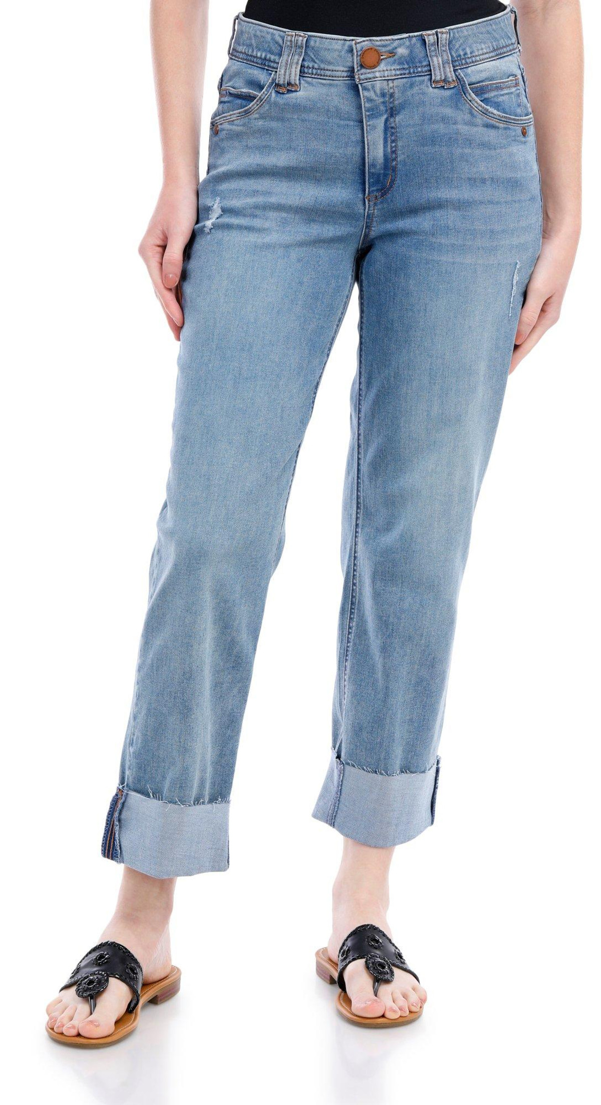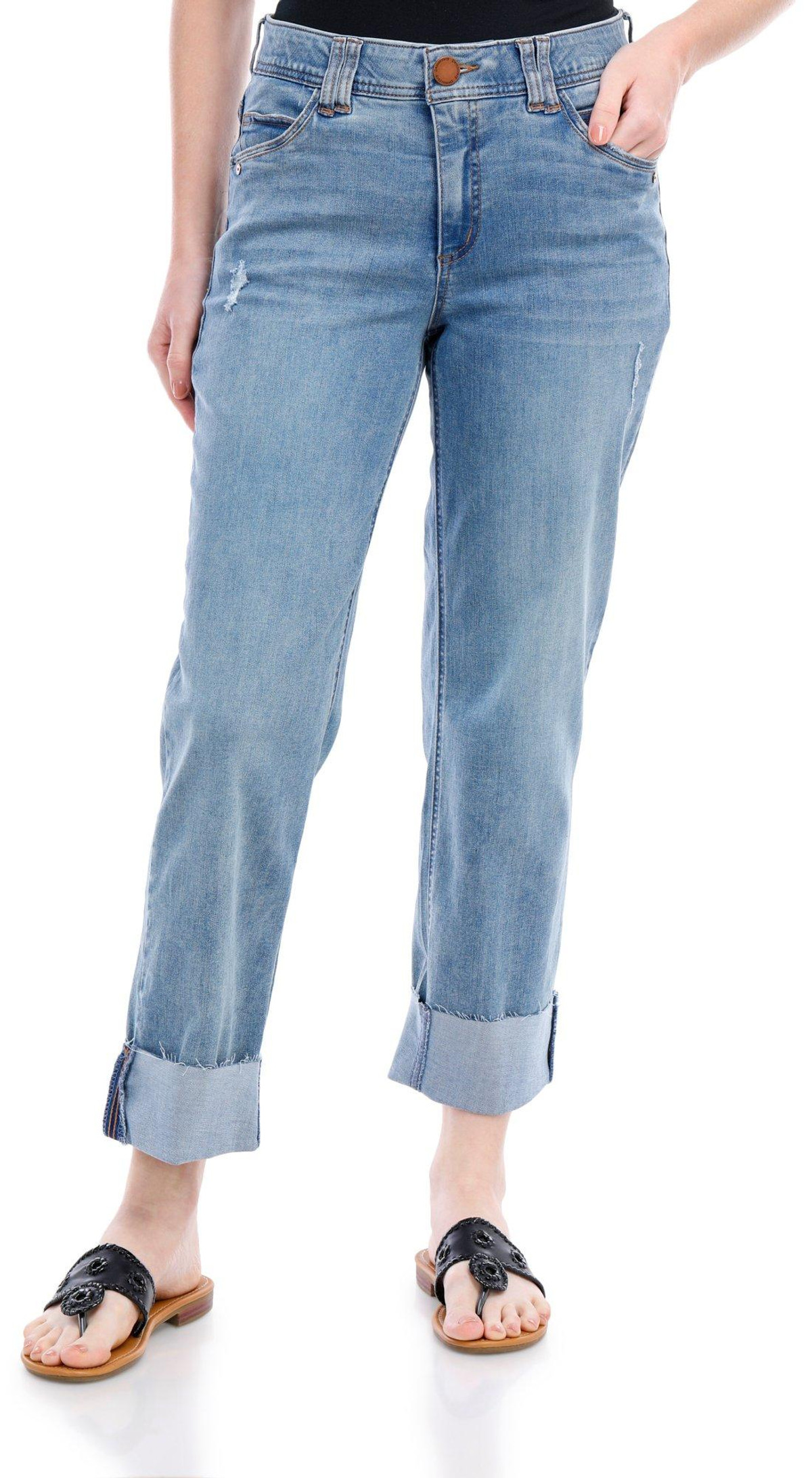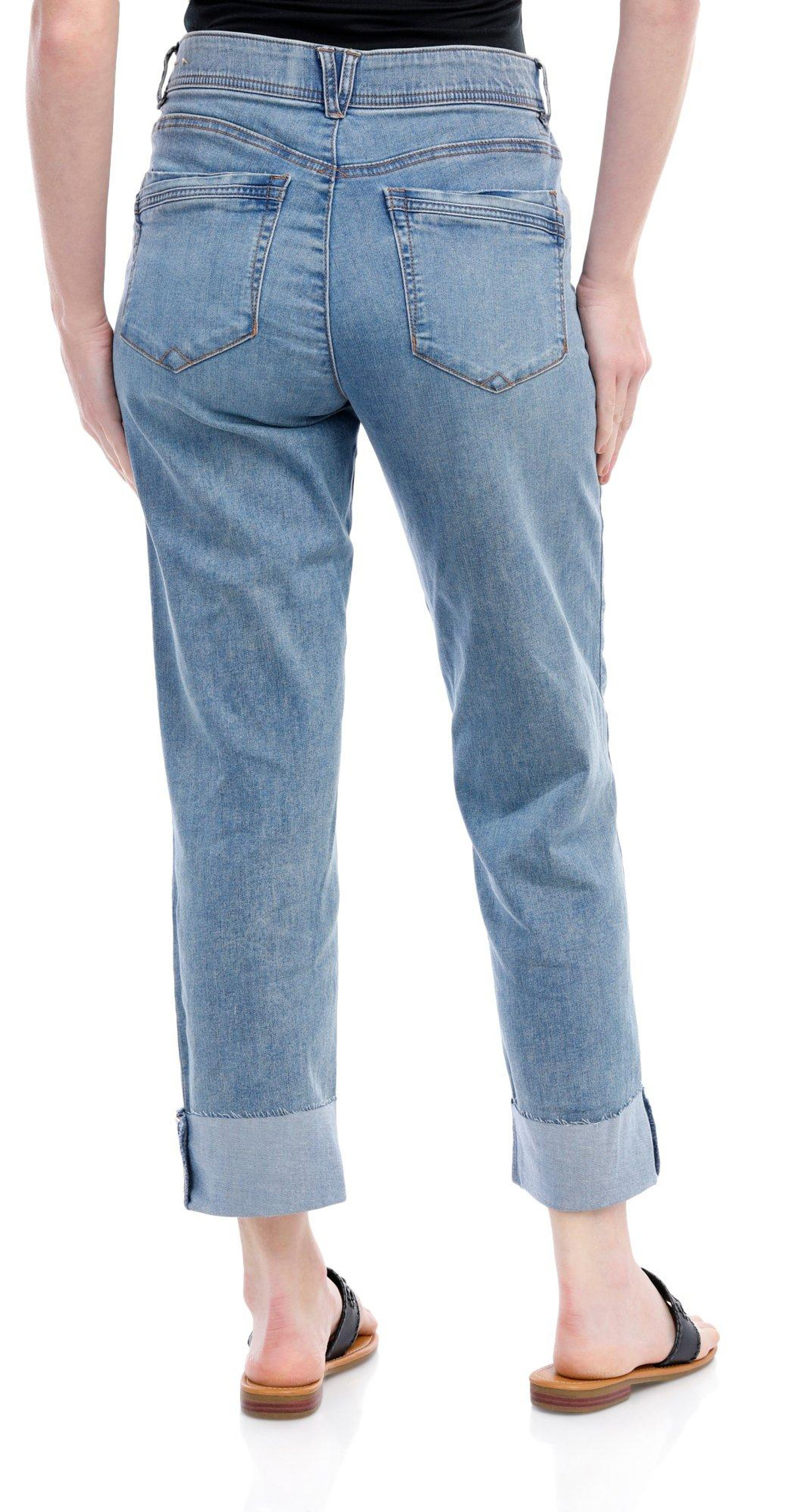 The Ab Tech Boyfriend Jeans are a perfect blend of style and comfort. Designed with a slimming fit, these jeans enhance your silhouette while providing a relaxed feel. Featuring double front and back pockets, they offer ample storage for your essentials. The distressed details add a trendy, edgy touch, while the cuffed hems complete the casual, laid-back look. Inseam measures 30 in, cuffed to 27 in. Fabrication is 56% cotton, 25% rayon, 18% polyester, 1% spandex.