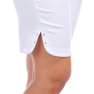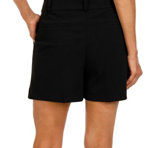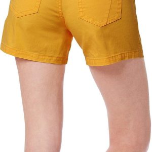 These Democracy denim shorts feature a whiskered design on lightweight denim fabric, a stretch waistband, Ab-tech tummy control, one-button and zipper closure, five-pocket styling, and a roll cuff hem. The unrolled inseam measures approximately 7 in. Fabrication 54% cotton, 27% rayon, 17% polyester, 2% spandex.