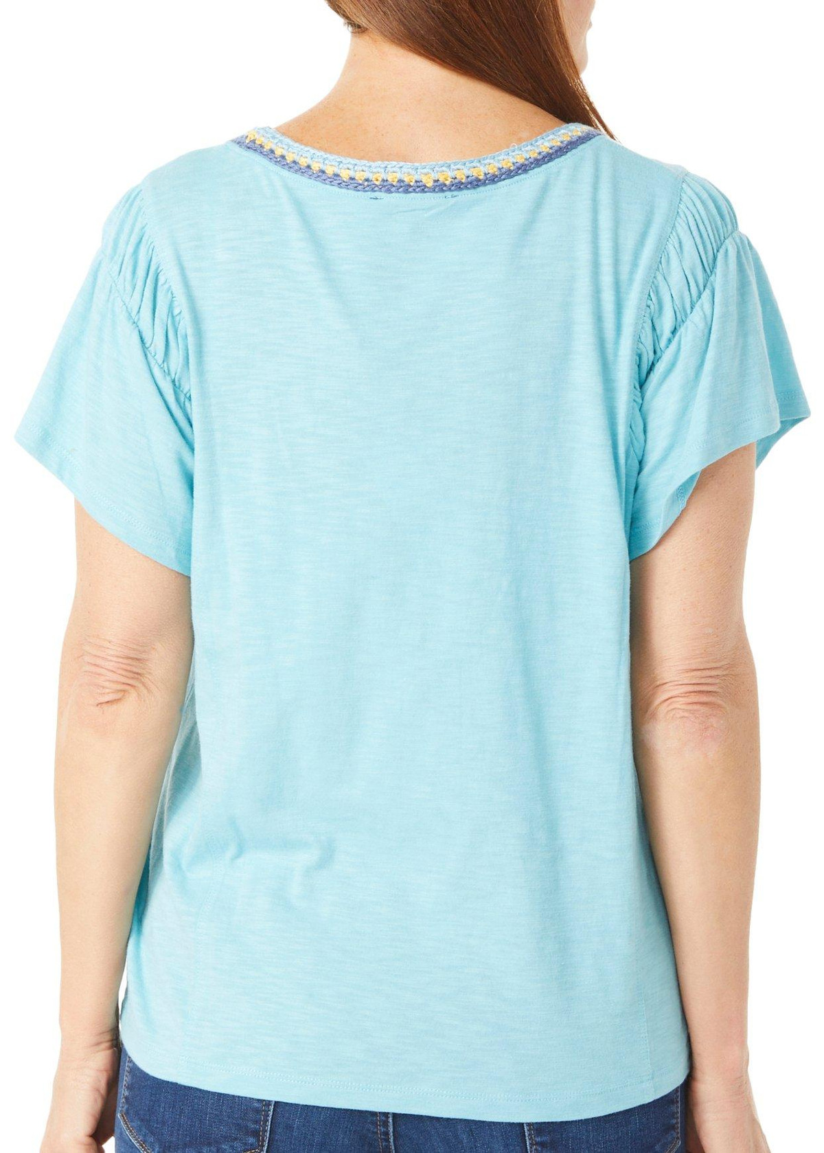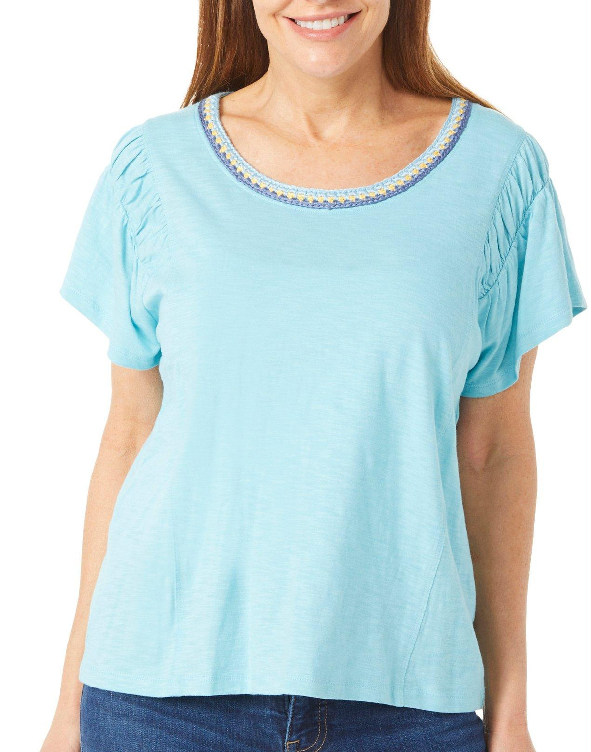 Democracy Womens Short Flutter Sleeve Crochet Neck Top