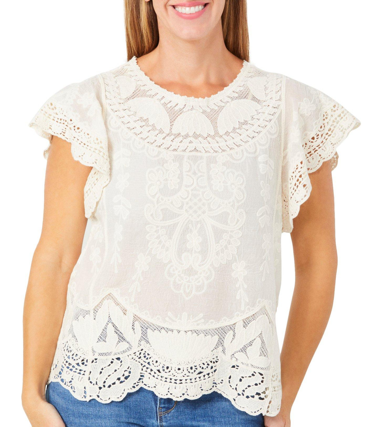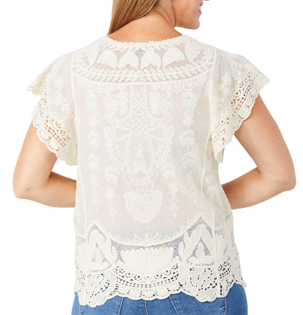 Feminine and breezy, this Women’s Short Sleeve Crochet Crew Neck Top features a solid color and intricate crochet design. Scalloped trim on the sleeves adds a delicate touch, making it perfect for warm-weather days or layering with your favorite pieces. Fabrication 100% cotton