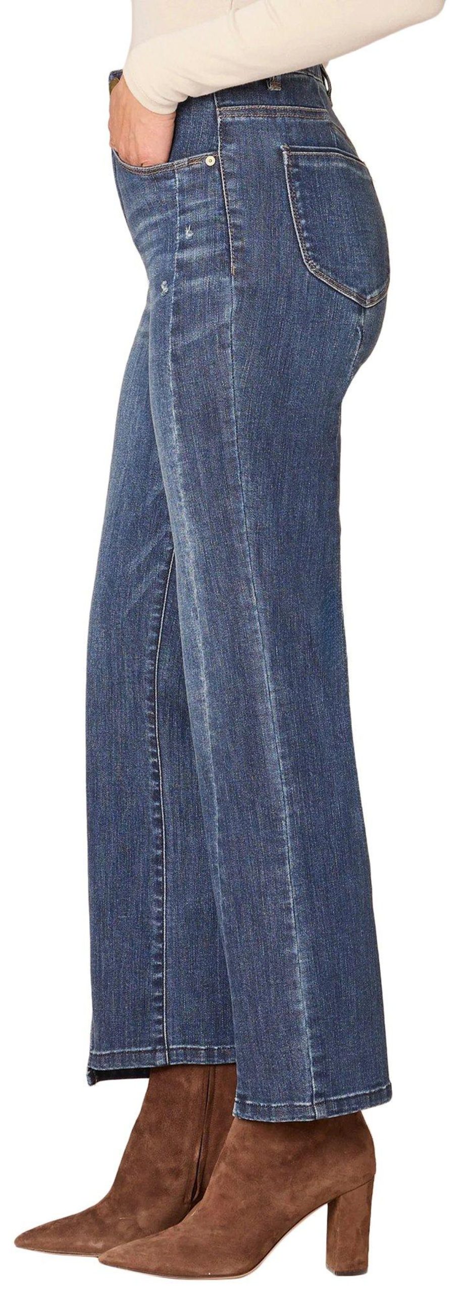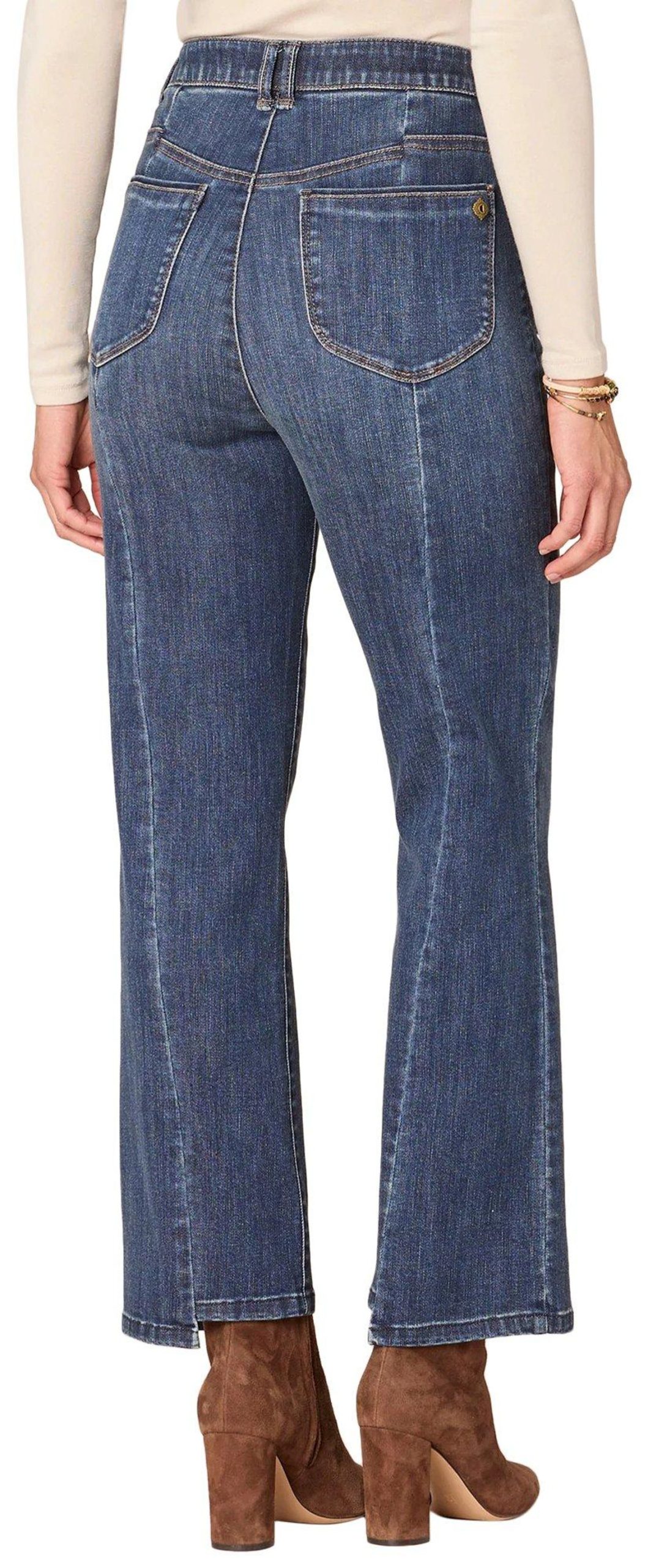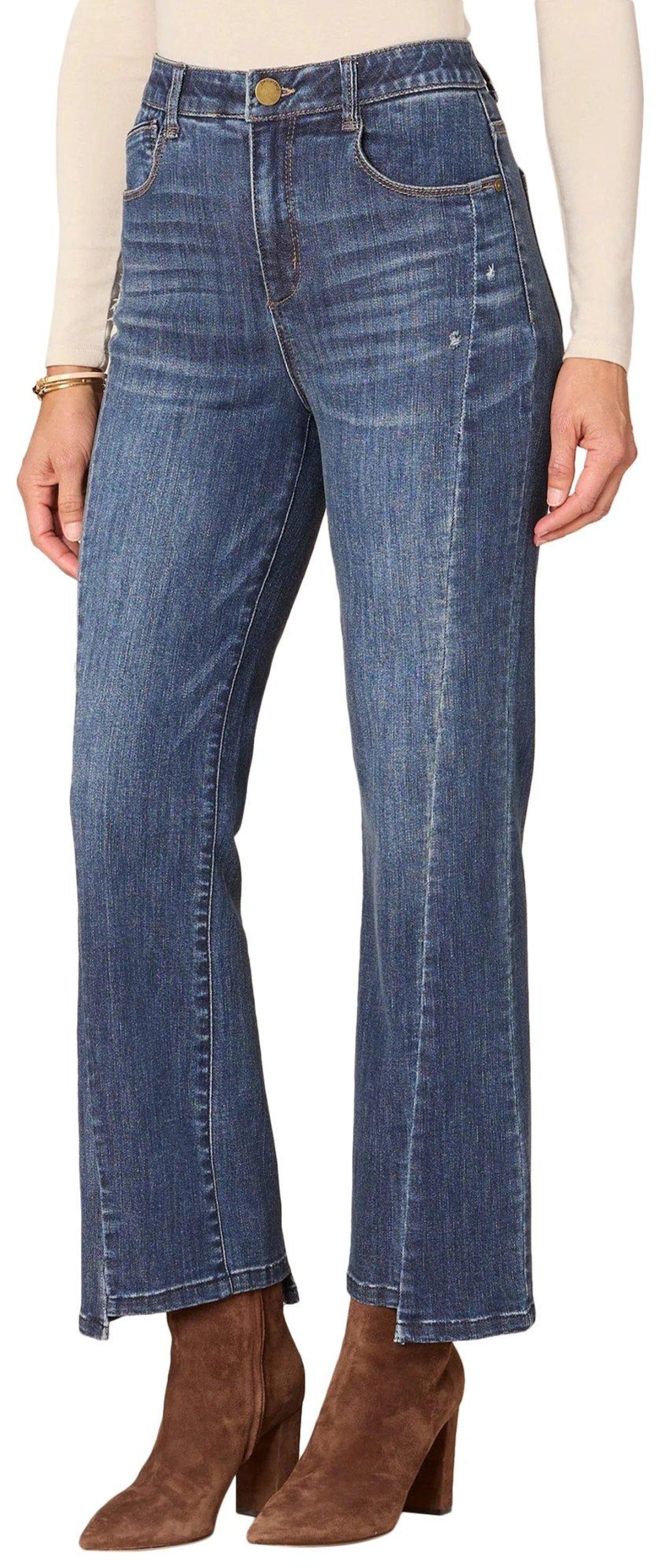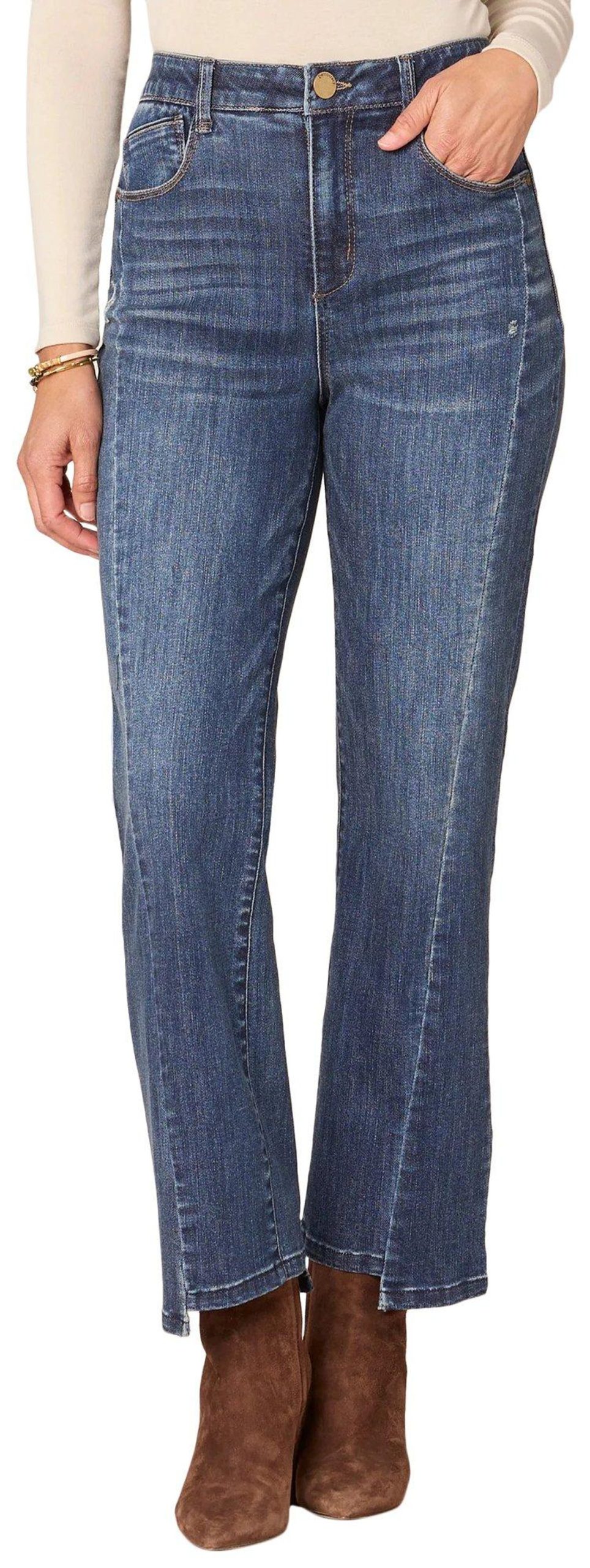 With these Absolution® Barely Boot jeans, its all about your silhouette and an effortless vibe. Designed with a skyrise waist, upcycle-inspired splicing, distress and whiskering details, a cropped asymmetrical clean finish step hem, and an uneven V-shaped back yoke, theyre the ideal weekend style. 62% cotton, 25% polyester, 11% rayon, 2% spandex