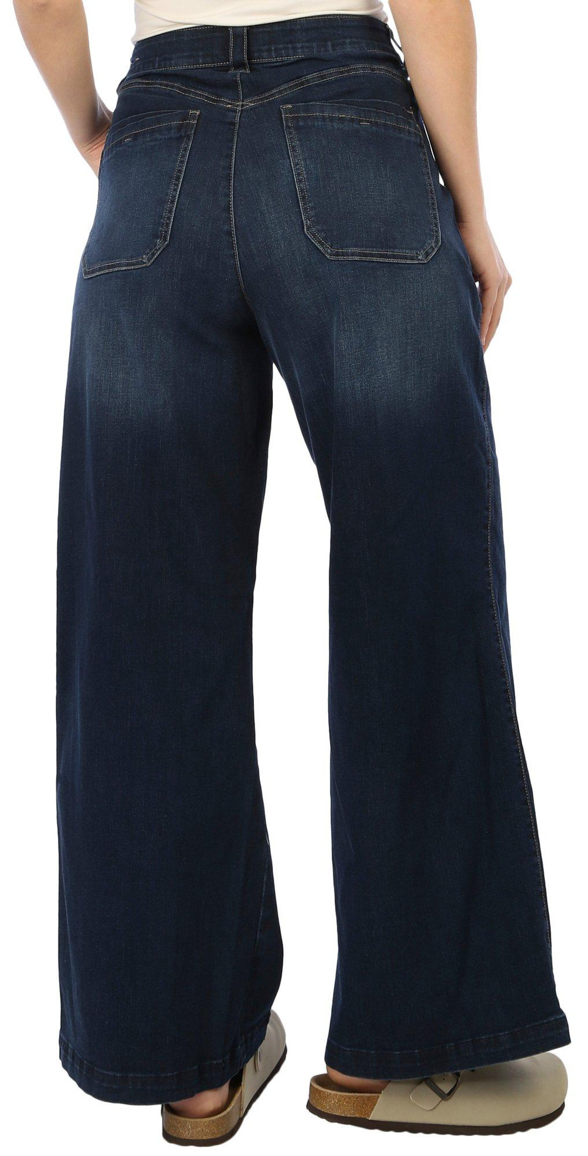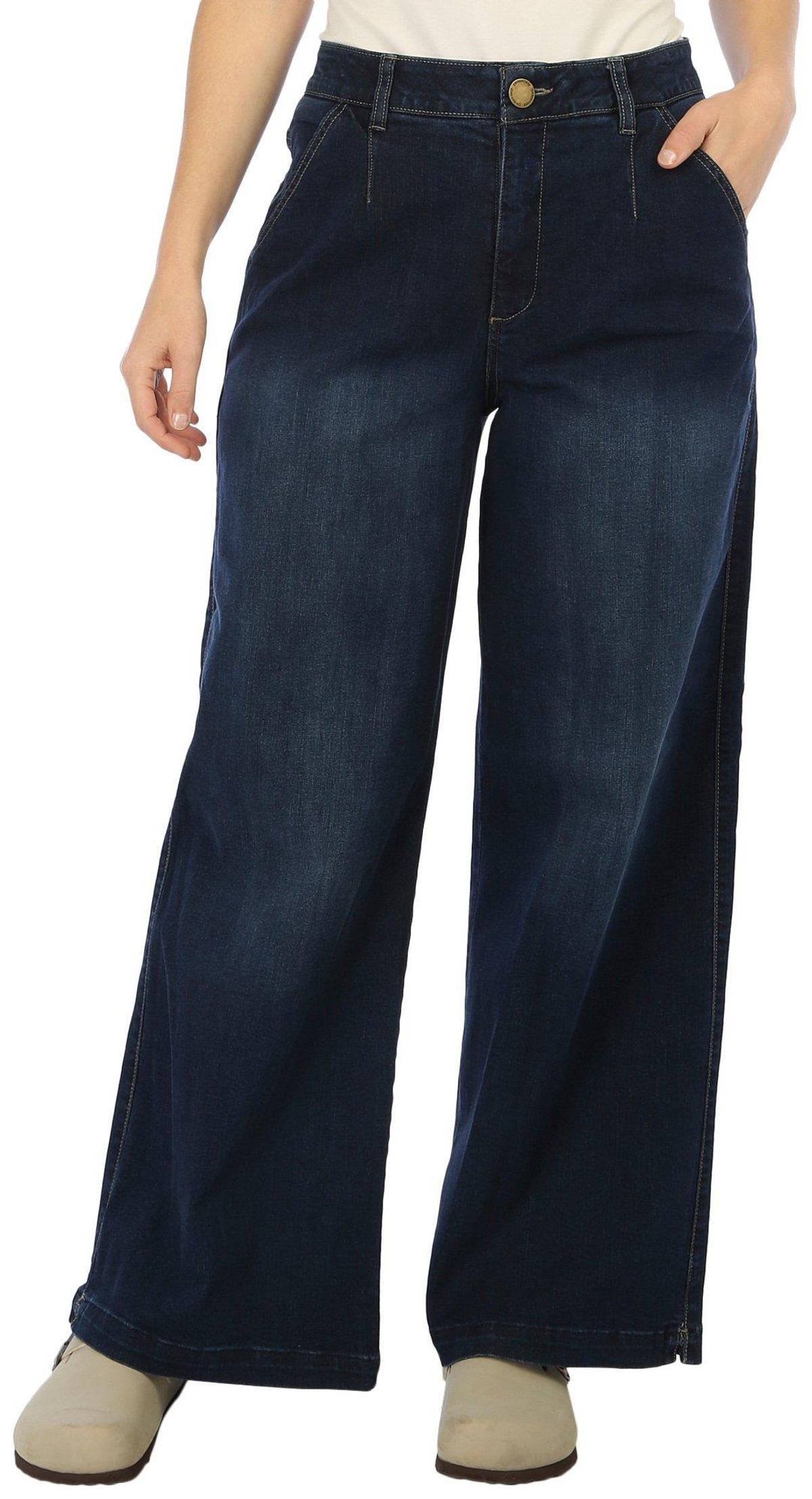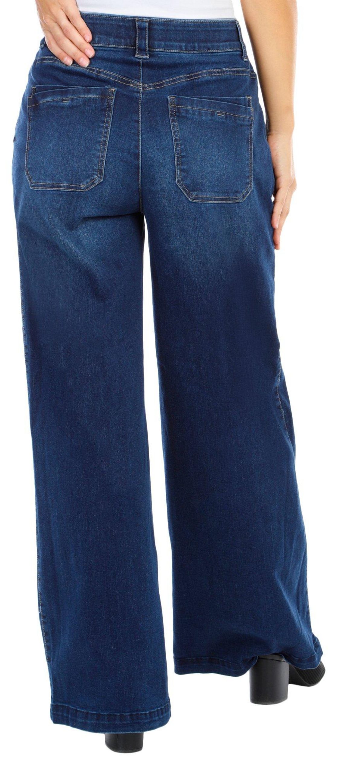 These Democracy jeans feature a solid color design on lightweight denim fabric, one-button and zipper closure, five-pocket styling, wide leg style, and wide hem. The inseam measures approximately 32 in. Fabrication 63% cotton, 23% polyester, 14% spandex.