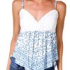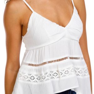 This sleeveless cami top features a flowing hanky design and delicate lace details for a soft, feminine touch. Lightweight and airy, it’s perfect for warm days or layered looks.