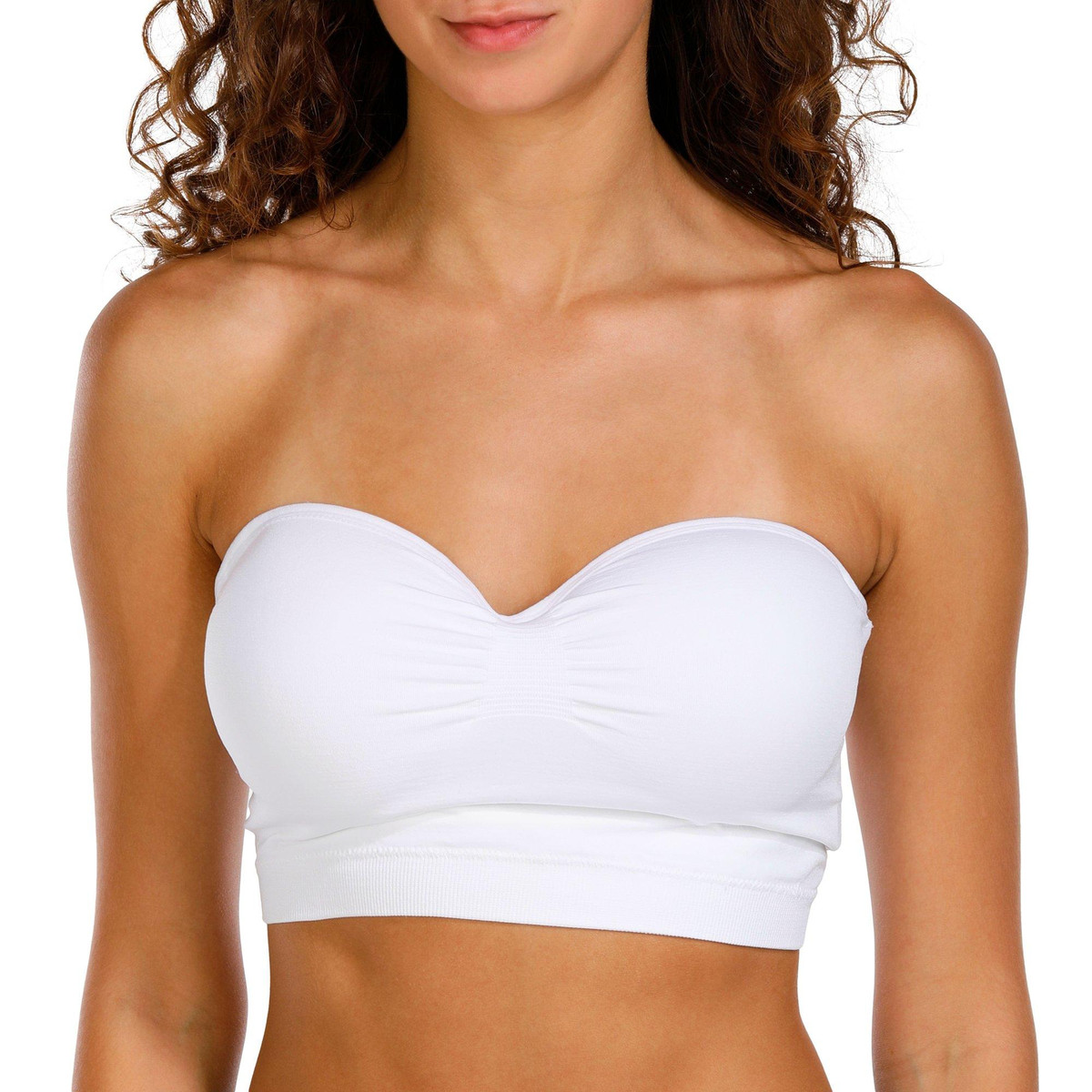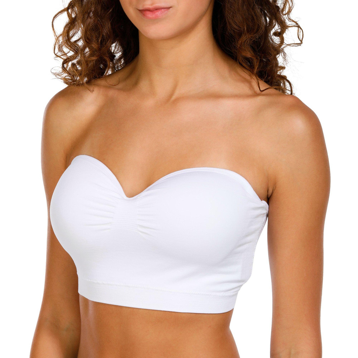 This pull-on bandeau top from Derek Heart features a solid color design on soft lightweight stretch fabric, non-removable molded cups, front ruching detail. Fabrication 95% polyester, 5% spandex.