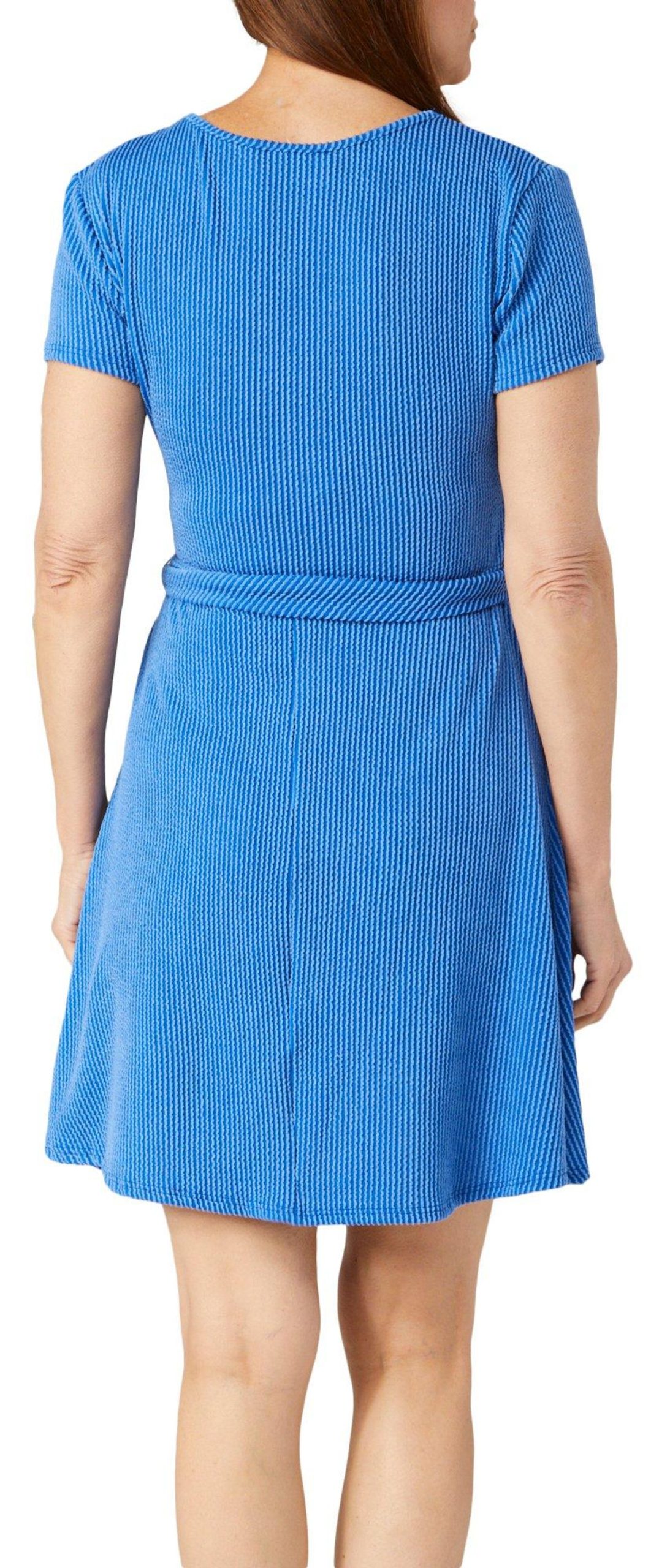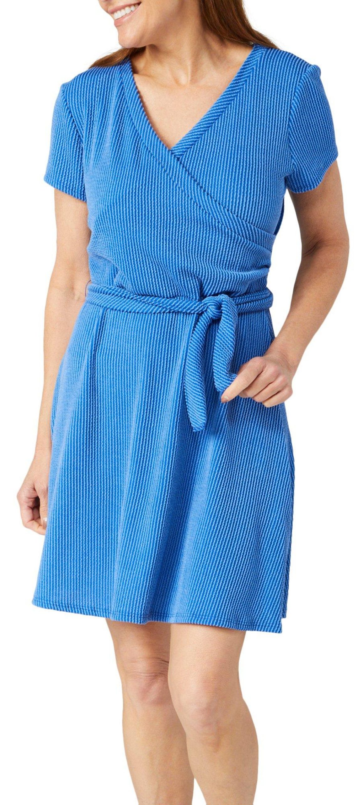 Elevate your wardrobe with this Sleeveless Ribbed Dress, featuring a chic wrap style upper and a flattering waist tie. The ribbed fabric adds a touch of texture and sophistication, while the wrap style upper offers a modern twist. Perfect for both casual and semi-formal occasions, this dress ensures a comfortable and stylish fit. Fabrication is 77% polyester, 18% rayon, 5% spandex.