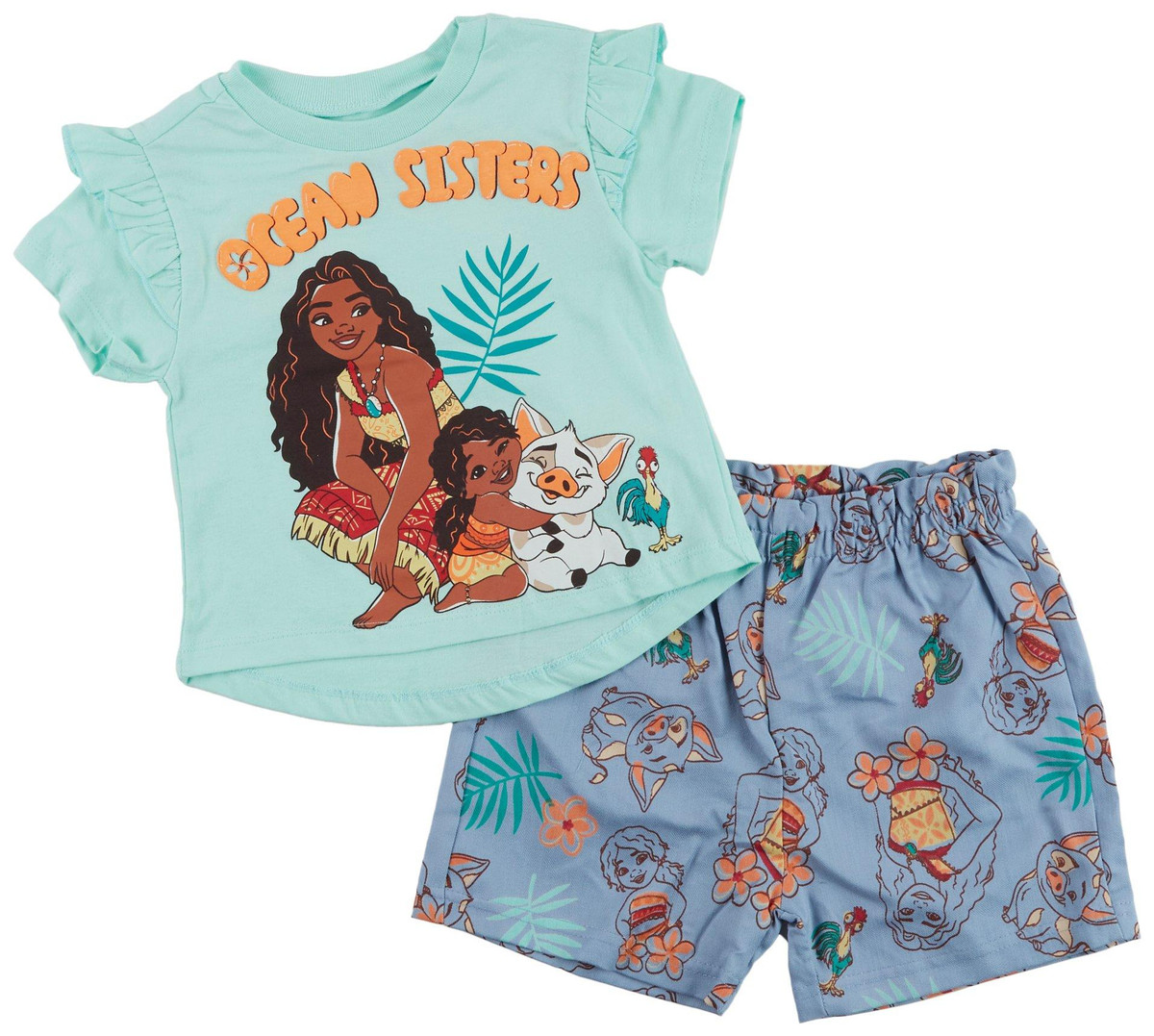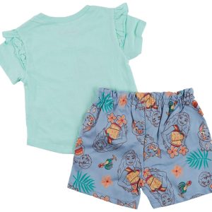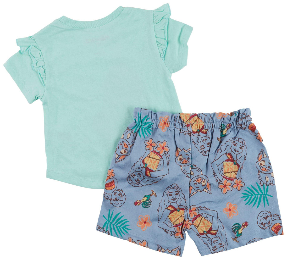 Set sail in style with this Moana tee and shorts set. The 100% cotton tee features a bold Moana graphic, crew neckline, and ruffled short sleeves. Paired with printed shorts inspired by the movies tropical patterns, its perfect for everyday play and adventure.