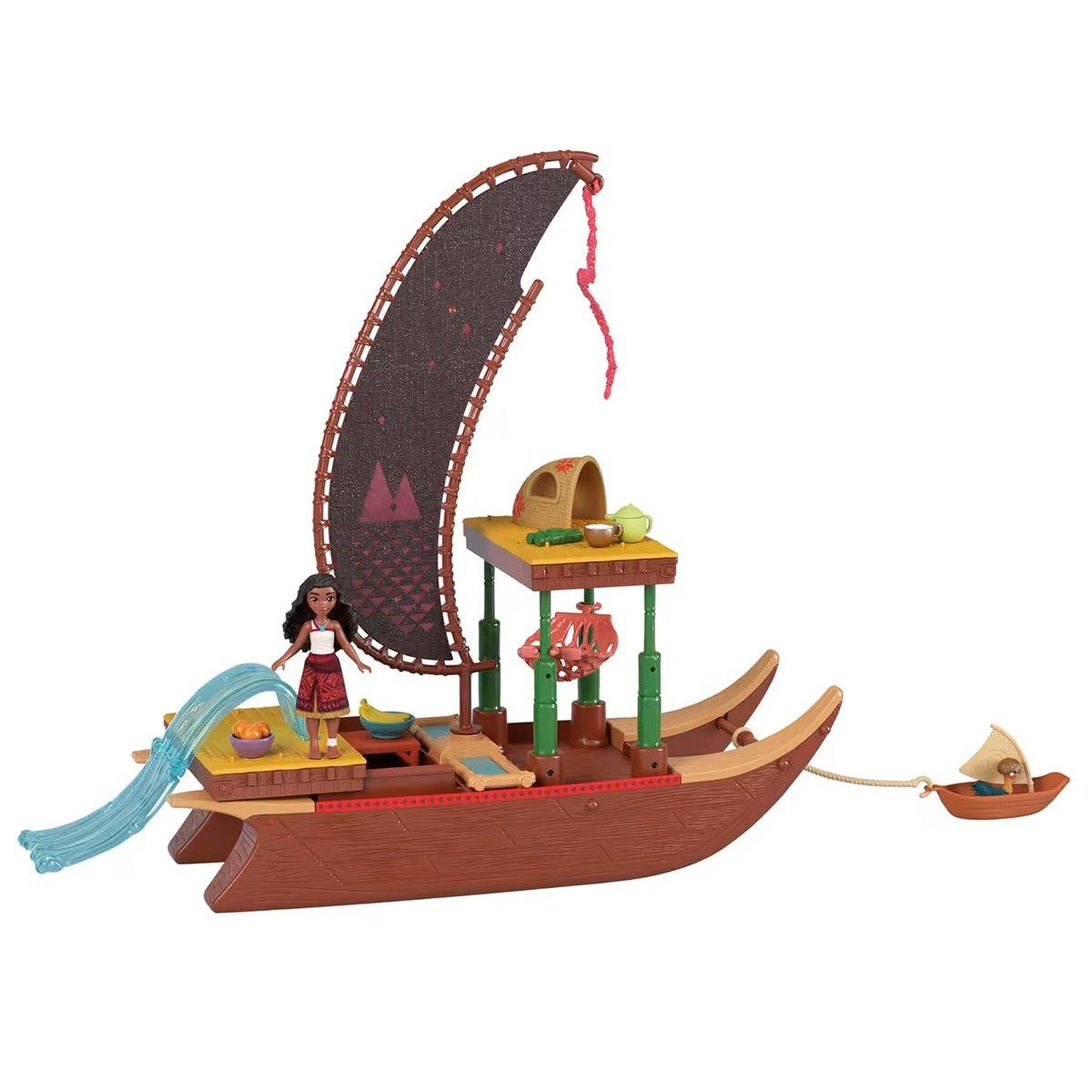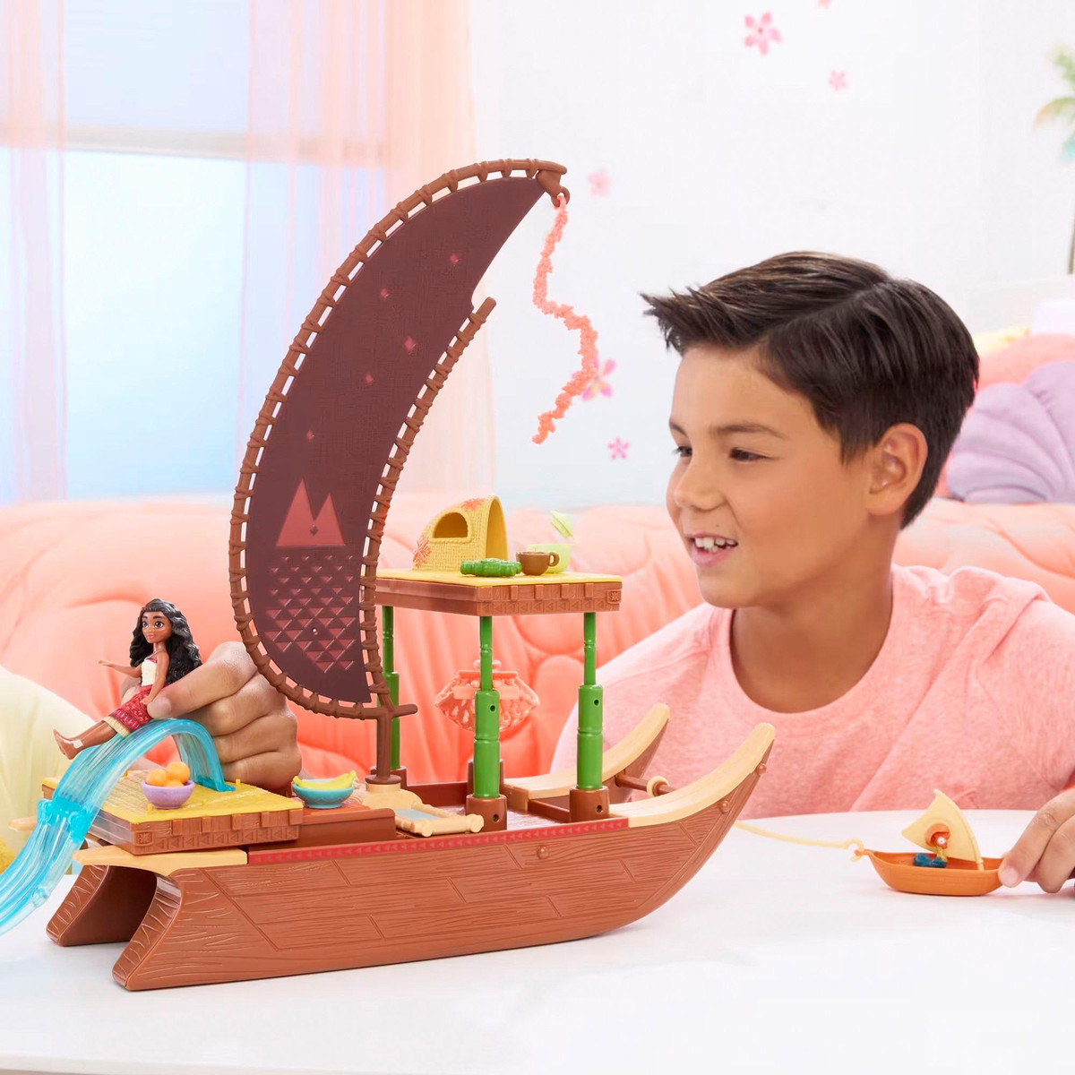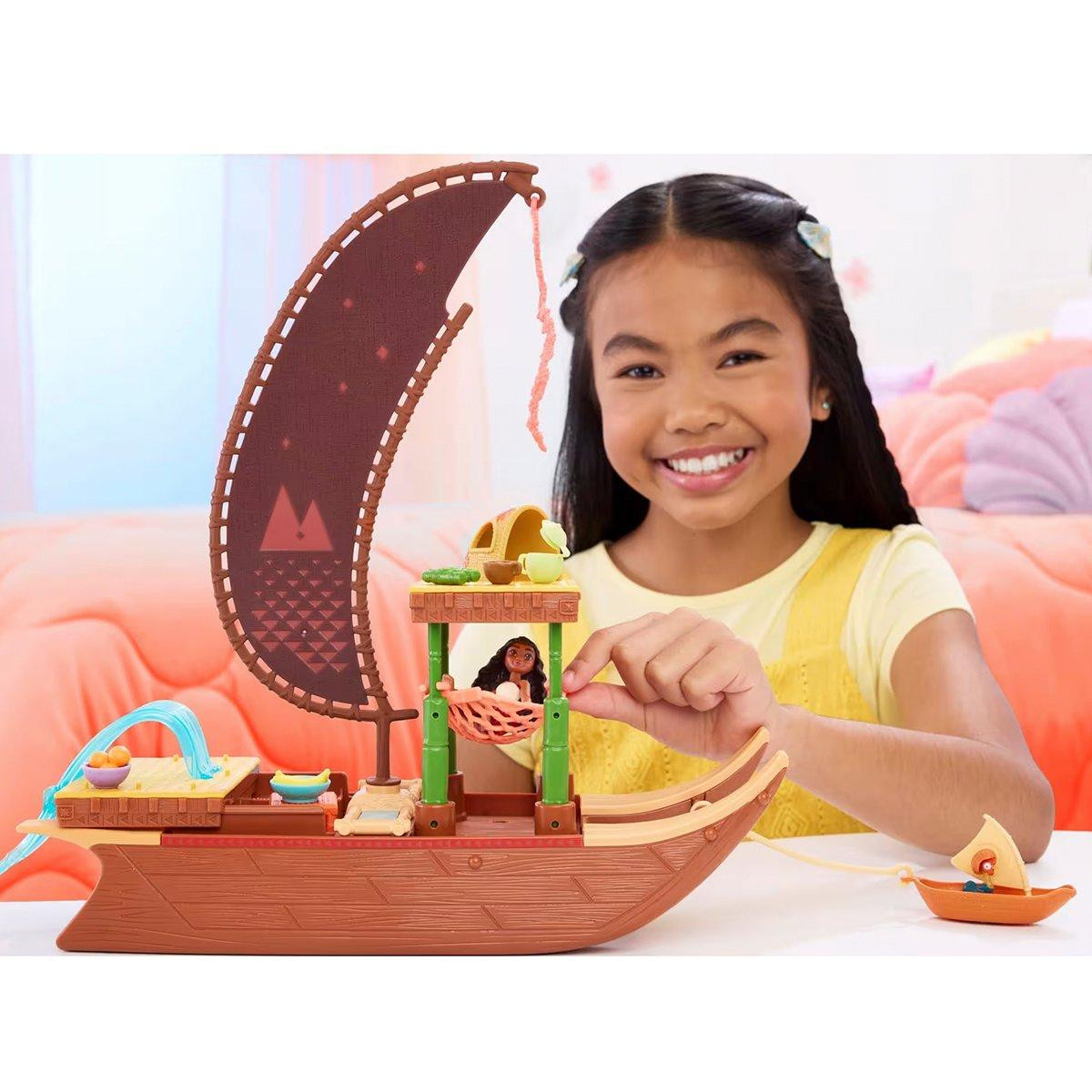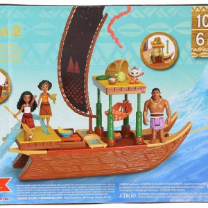 Moanas Adventure Canoe playset, inspired by Disneys Moana 2, the theatrical sequel to the original film, is ready to explore the sea and set sail beyond Motunui! With six transforming play areas a foldable water slide, hidden kitchen and hammock, platform, animal hut and animal boat the opportunities for storytelling play are endless.