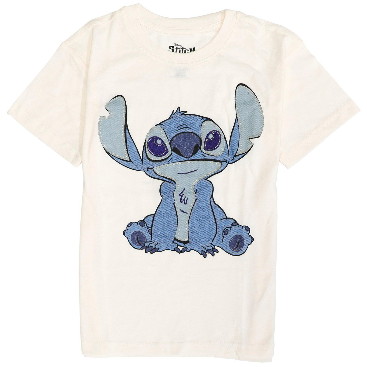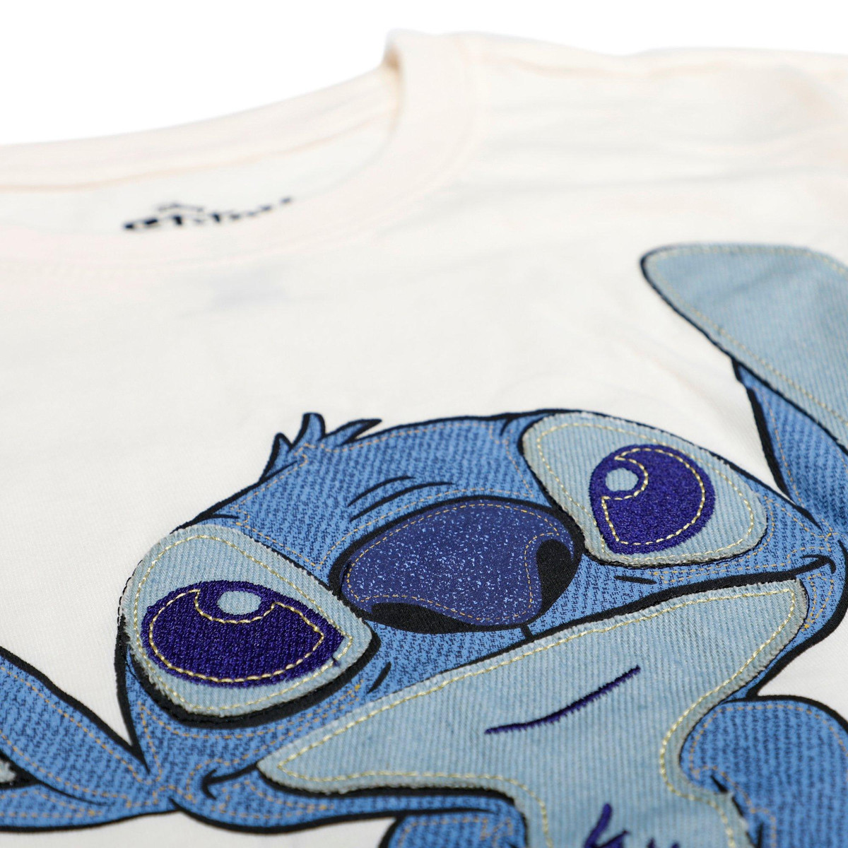 This Stitch crew T-shirt blends comfort and style with a soft fabric made from 60 percent cotton and 40 percent polyester. Featuring a fabulous Stitch design, it showcases mixed media textile art with screen print, appliqué, and embroidery for a unique two-dimensional effect using denim fabric. Perfect for everyday wear, this shirt offers a relaxed fit with a fun and creative touch.