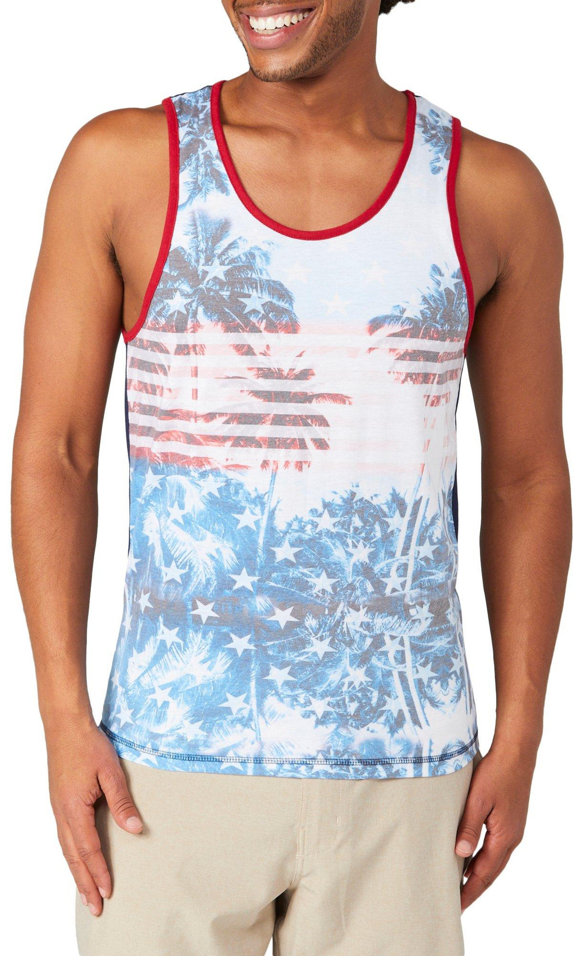 Show your patriotic spirit with our Men’s Blue American Flag Tank Top. Made from a blend of cotton and polyester, this tank features an American flag print and a palm tree print, complemented by a stylish u-neckline. Perfect for warm weather and casual outings.