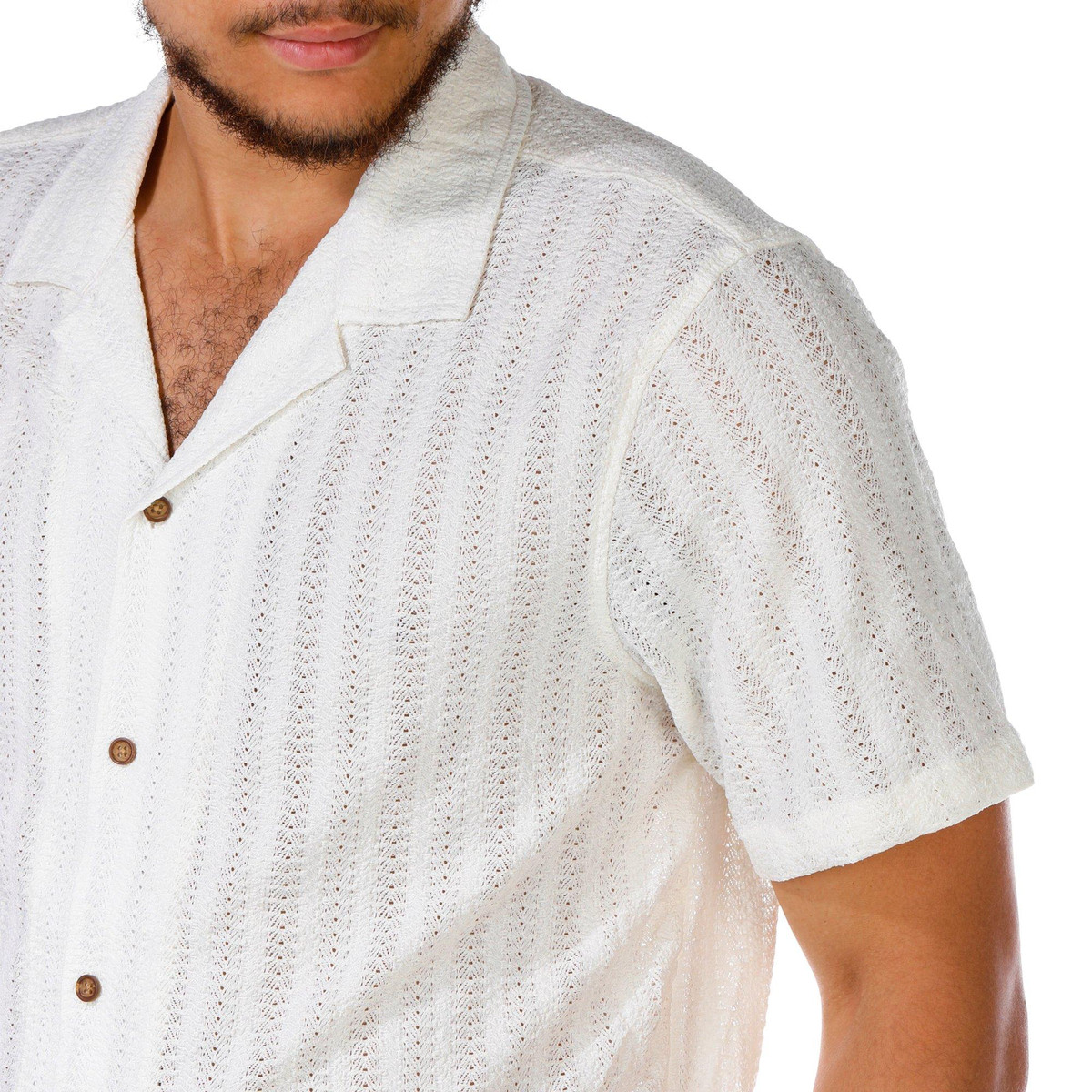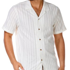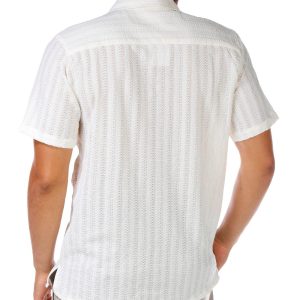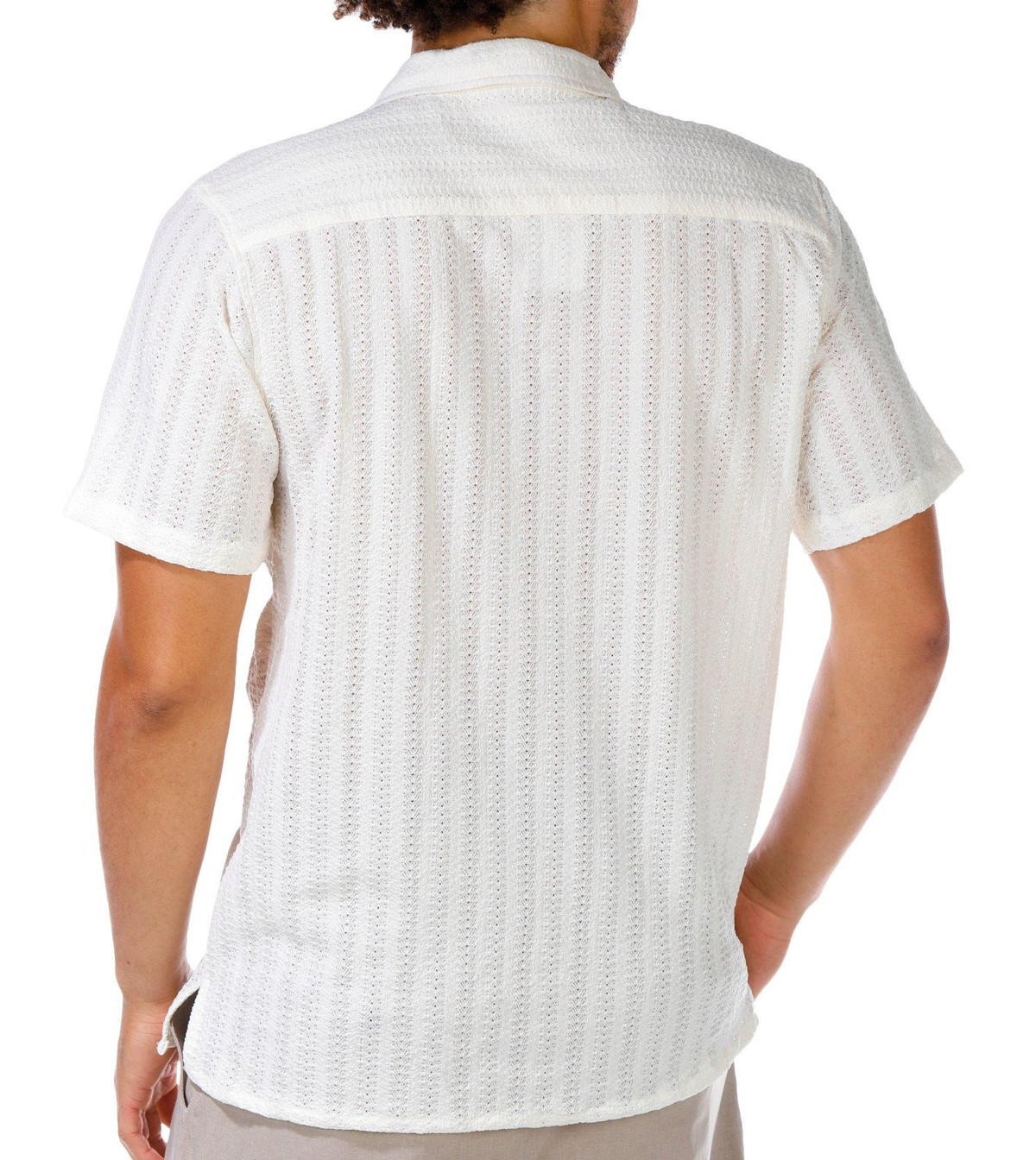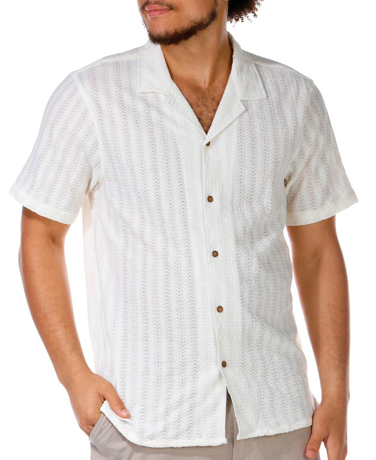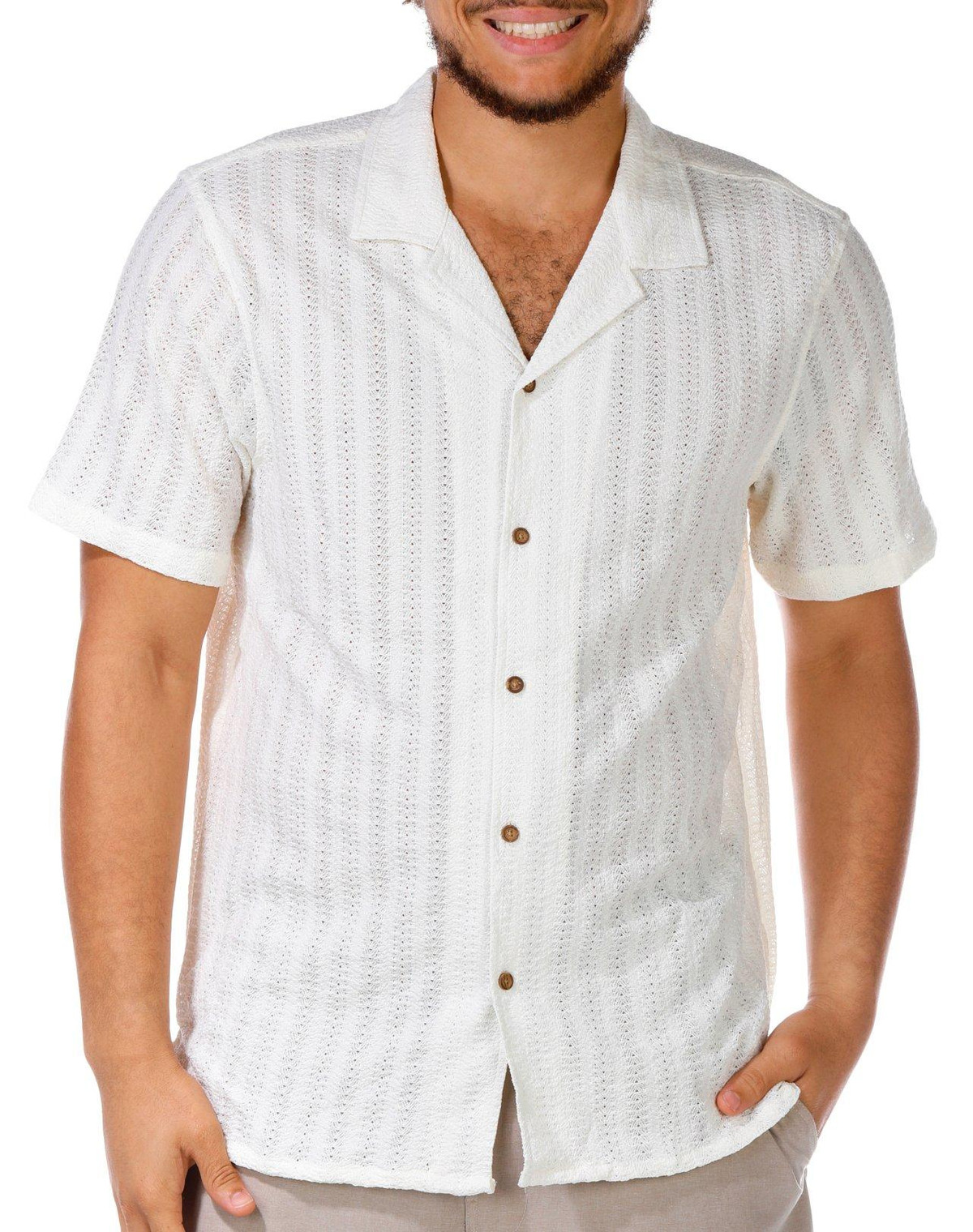 This Short Sleeve Top features a buttoned front, textured knit fabric, and a classic point collar for a polished yet comfortable look. A versatile piece perfect for casual or dressier days. Top length measures approximately 27 in. Fabrication is 97% polyester, 3% spandex.
