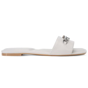 Polished chain-link hardware enriches the upper of a square-toe slide sandal set on a cushioned footbed that provides lasting comfort.