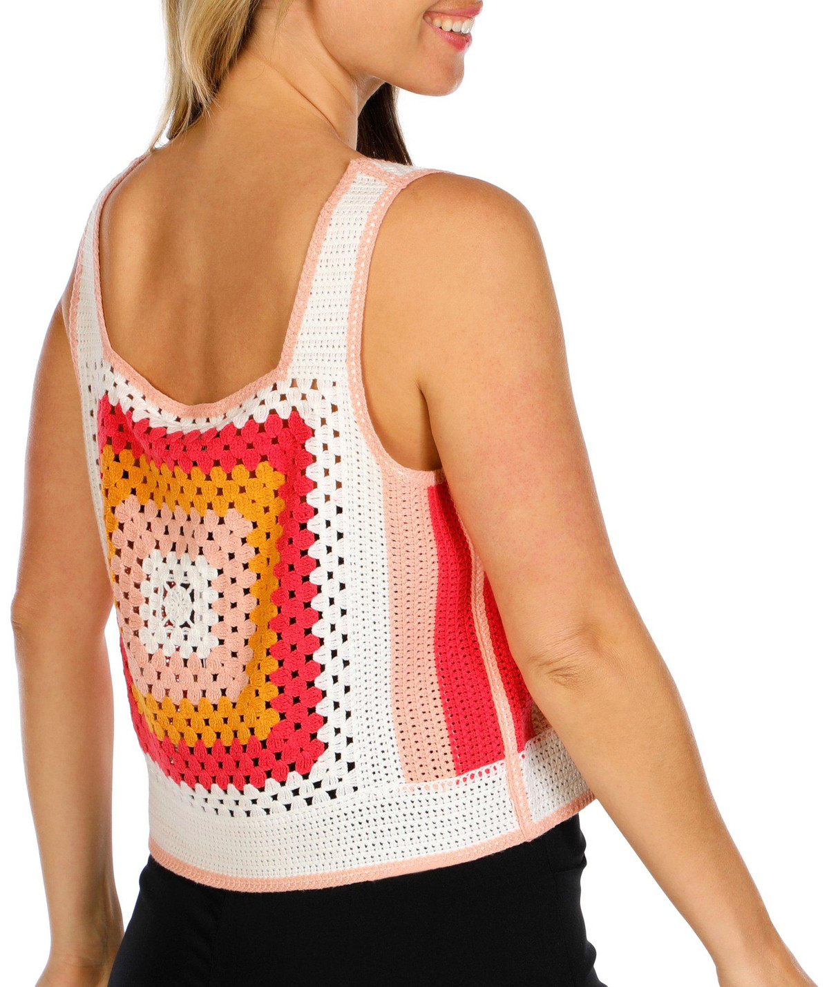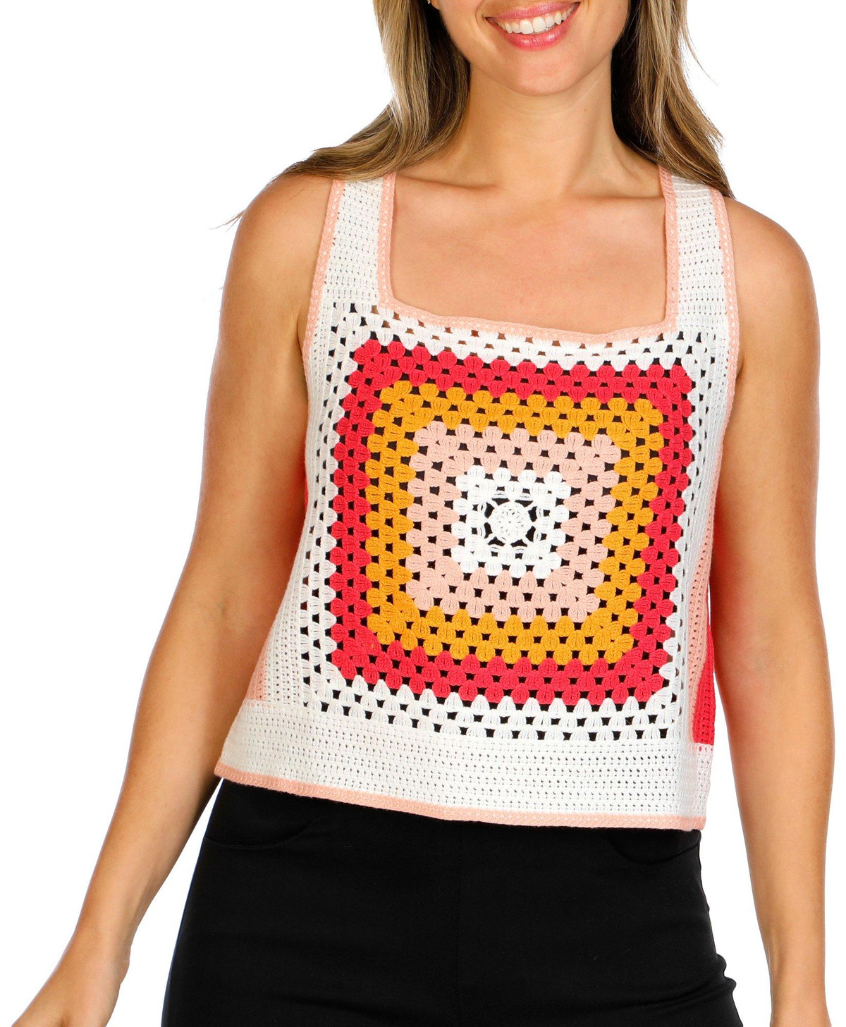 Brighten your look with this breezy Sleeveless Top, featuring a vibrant, colorful design and an airy open crochet style. Perfect for warm days, its lightweight texture and playful pattern bring a touch of boho charm to any outfit. Layer it over a cami or swimsuit for effortless summer style. Fabrication is 60% cotton, 40% acrylic.