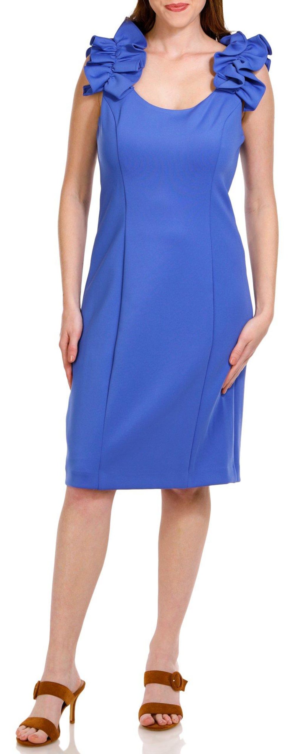 Elevate your style with our Women’s Ruffle Shoulder Sheath Dress. Crafted from a comfortable blend of polyester and spandex, this dress features a chic solid color, playful short ruffle sleeves, and a convenient back zip entry. Perfect for any occasion, this elegant piece combines sophistication and ease, making it a versatile addition to your wardrobe.