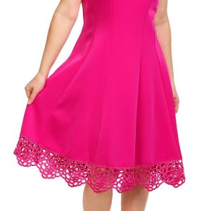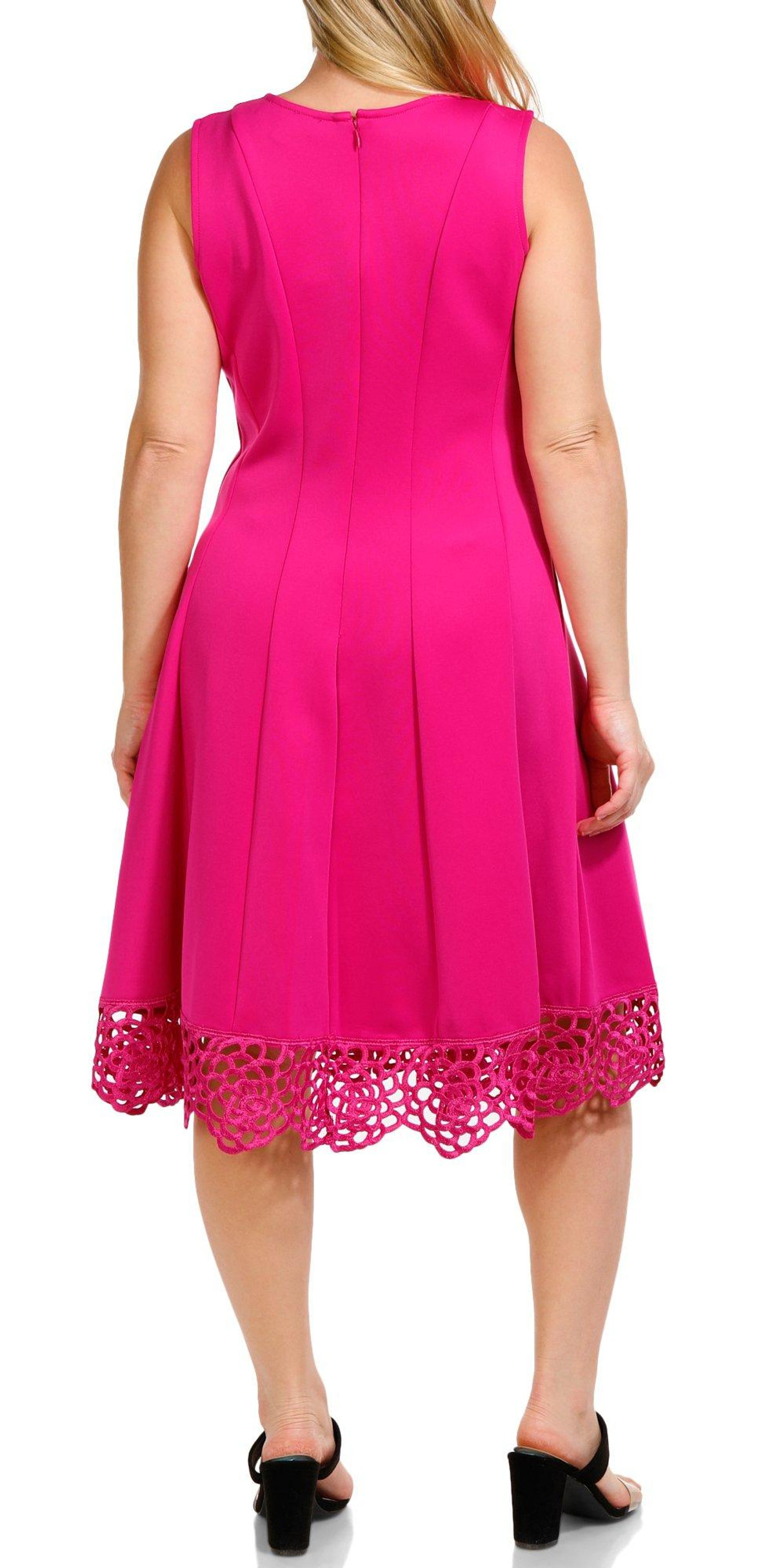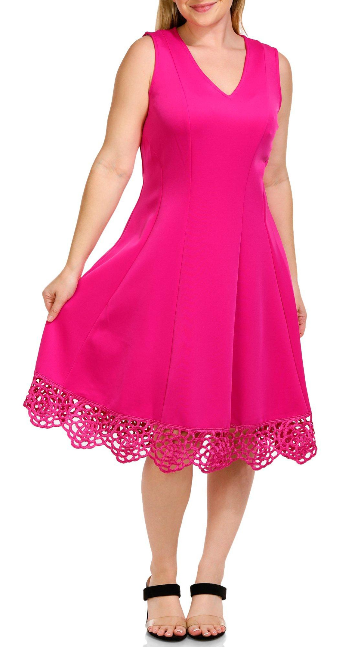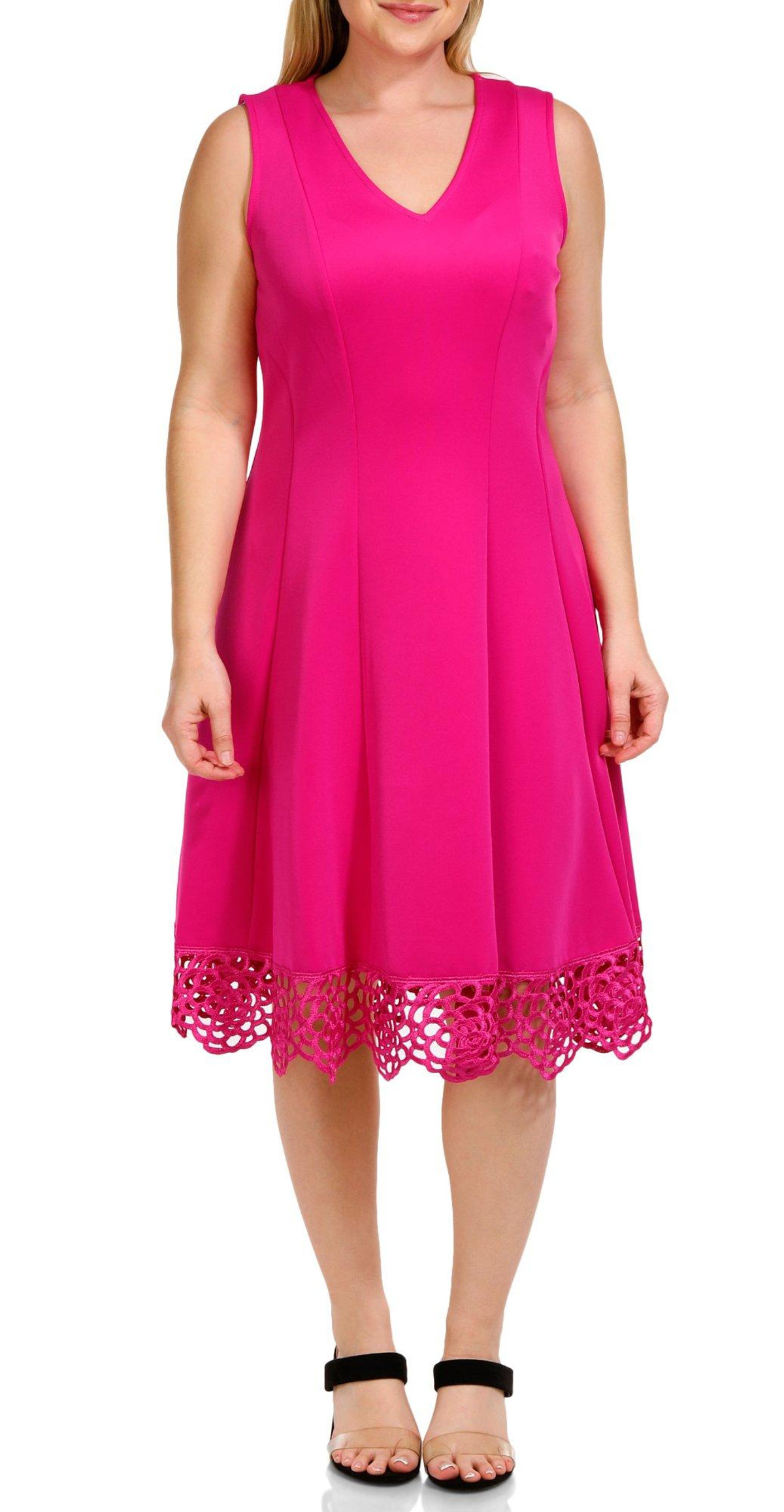 This dress features a fun and vibrant solid color design on midweight woven fabric, sleeveless styling, v-neckline, pleated details, and crochet lined hem. Measures approximately 40 in. long. Fabrication is 95% polyester and 5% spandex.