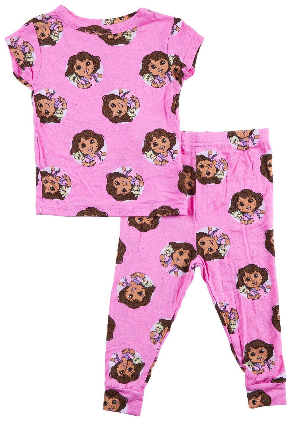 Introducing the Baby Girls 2 Pc Dora Pajama Pants Set, crafted from a soft blend of viscose and spandex for ultimate comfort. This adorable set features a cute Dora The Explorer print on a short sleeve top and matching pants. Perfect for bedtime or lounging, this pajama set combines playful design with cozy materials, making it a delightful addition to your little one’s sleepwear collection.