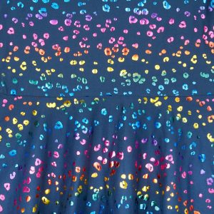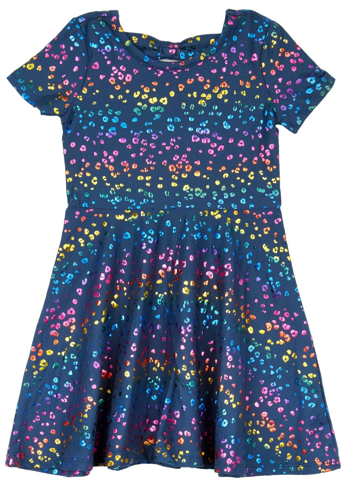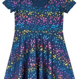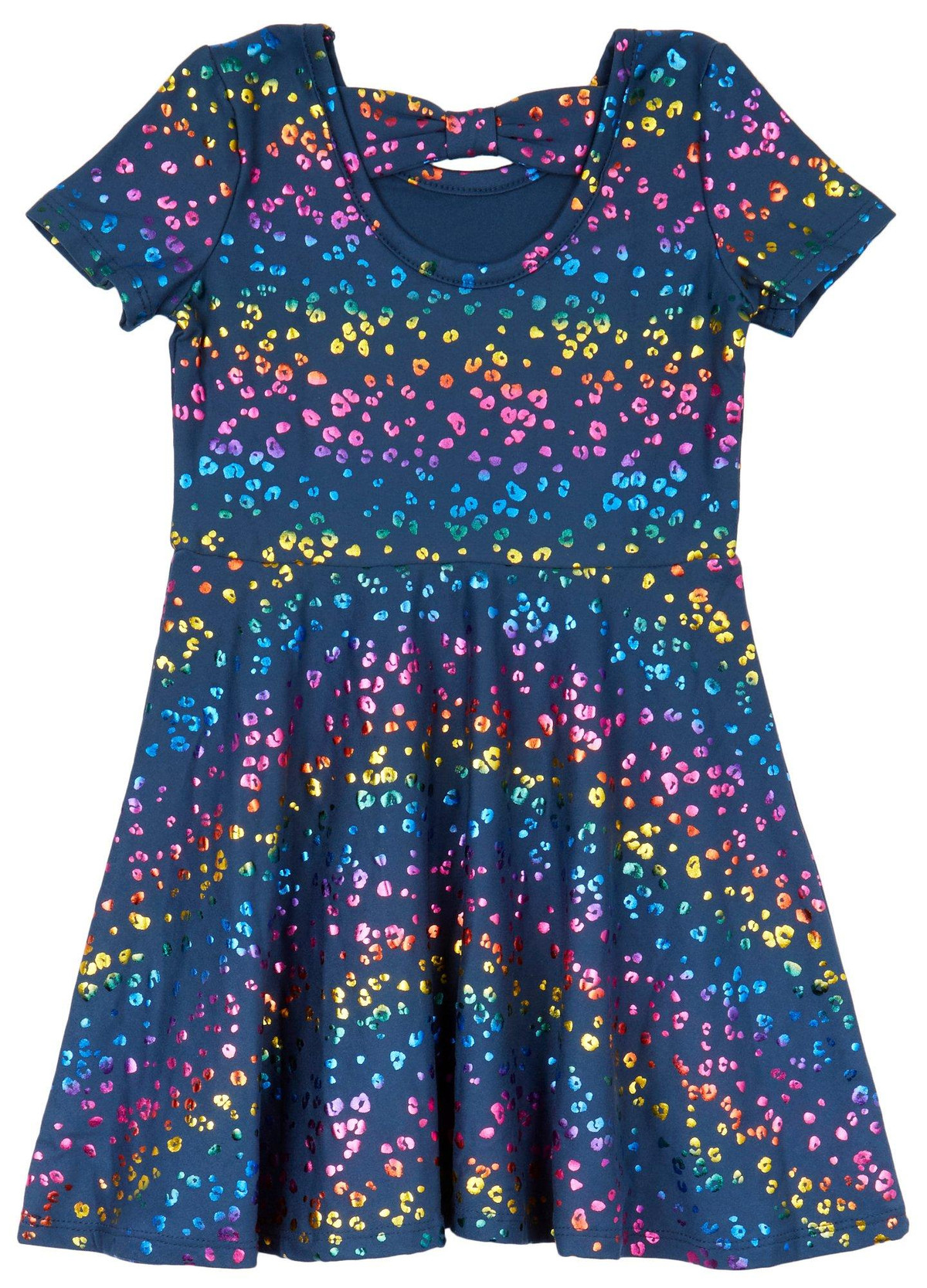 Dot & Zazz combines fun styles with soft comfort for everyone. This short sleeve dress features a cat & moon print design, one tier styling, upper back bow tie with keyhole, and a comfortable crew neckline. Fabrication is 57% cotton, 38% recycled polyester, 5% spandex.