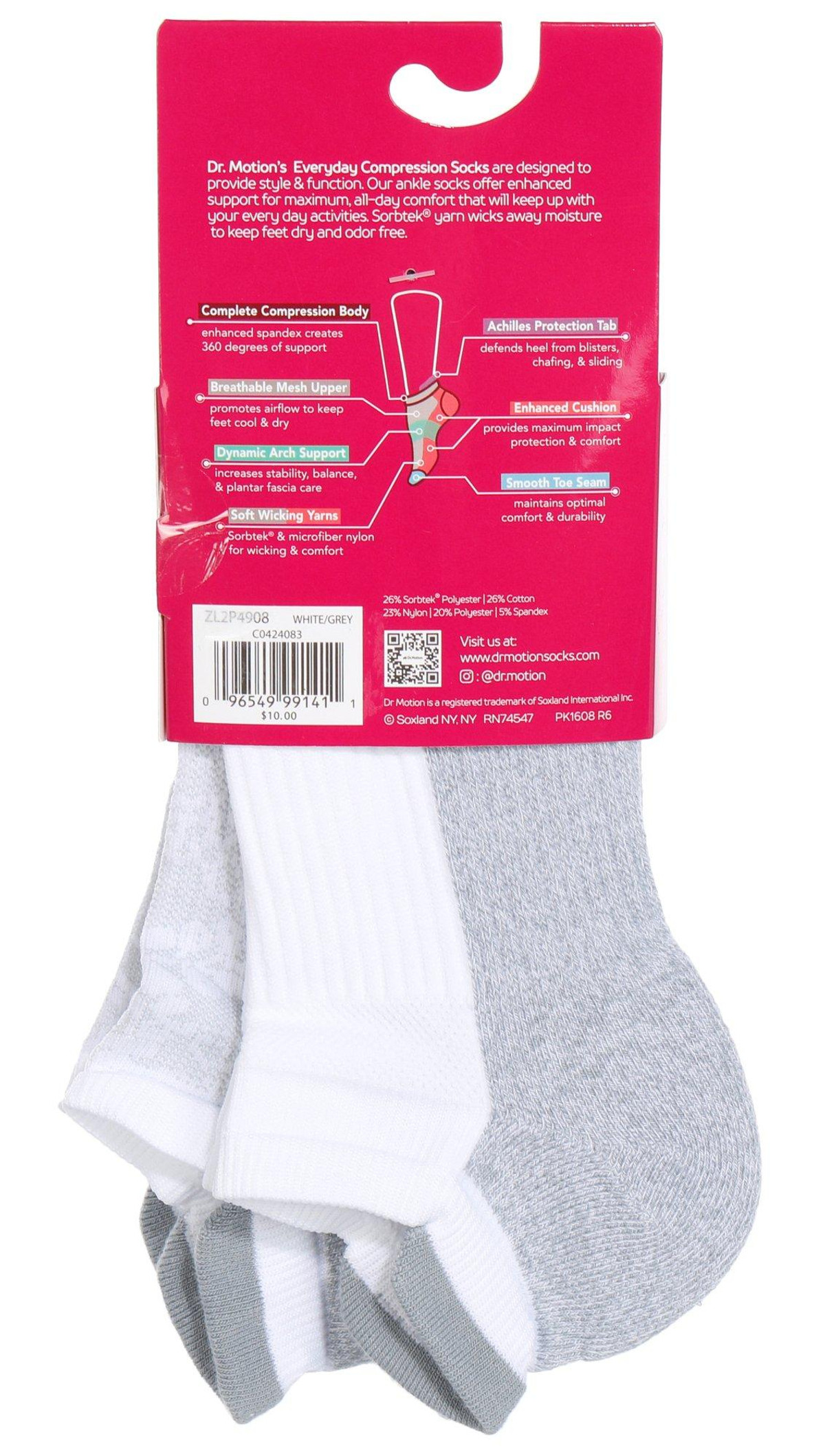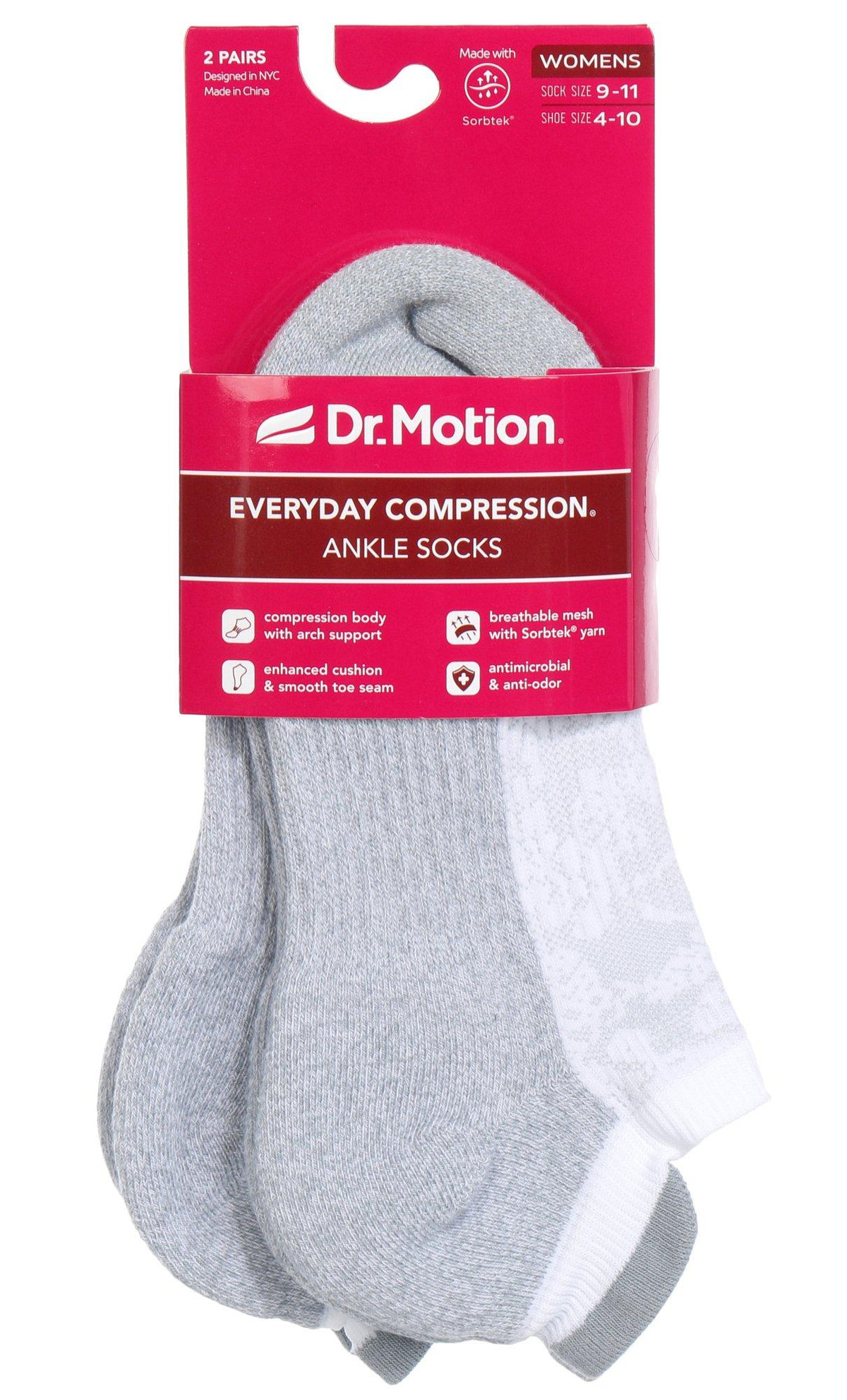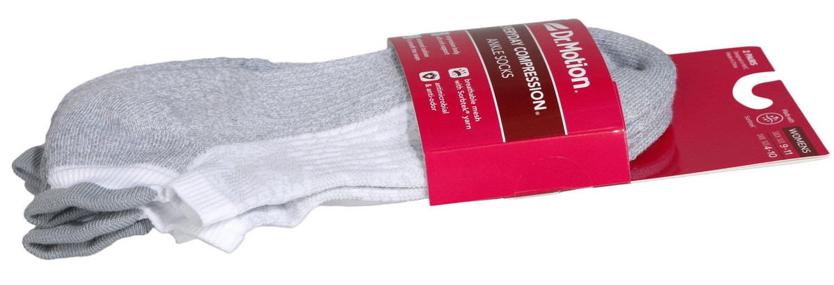 Dr. Motion women’s compression ankle socks in grey come in a 2-pair pack, sized for sock size 911 and shoe size 410. These socks feature a compression body with dynamic arch support, enhanced cushioning, and a smooth toe seam. Made with breathable mesh and Sorbtek yarn, they wick moisture and offer antimicrobial and anti-odor protectionperfect for everyday comfort and support.