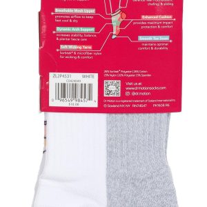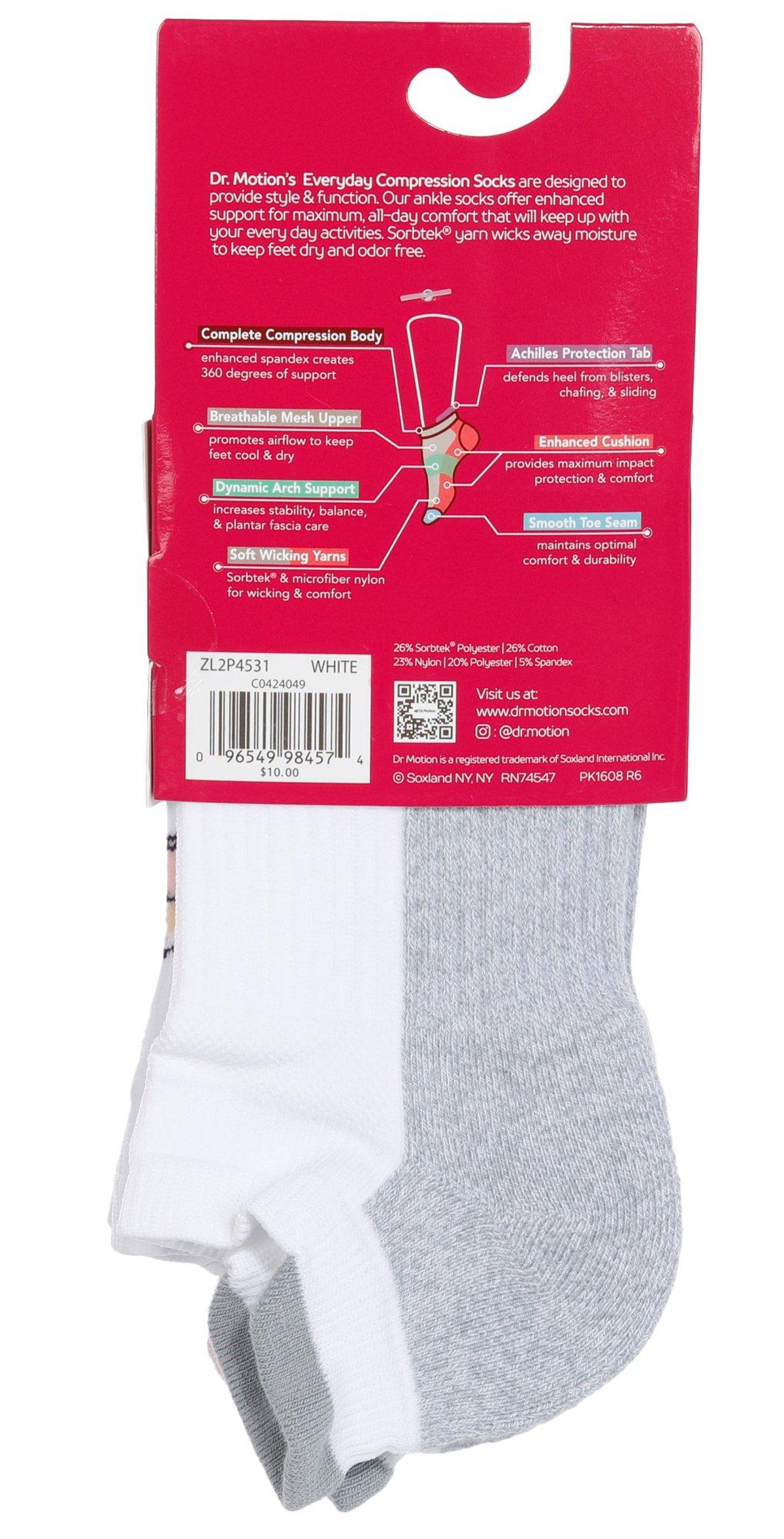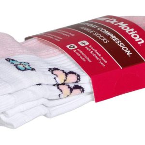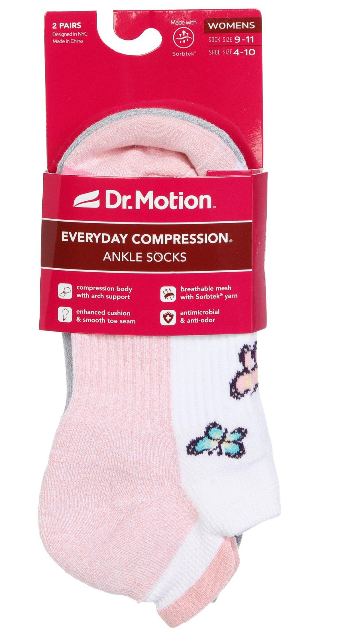 Dr. Motion women’s compression ankle socks come in a 2-pair pack (grey and pink with butterfly design), sized 911 sock and 410 shoe. Features include 360° compression, arch support, breathable mesh with wicking yarn, antimicrobial and anti-odor tech, ankle tabs with reflective logo, Y-heel fit, cushioned cotton heel/toe, and reinforced smooth toe. Fabric: 50% Nylon, 29% Cotton, 13% Polyester, 8% Spandex.