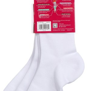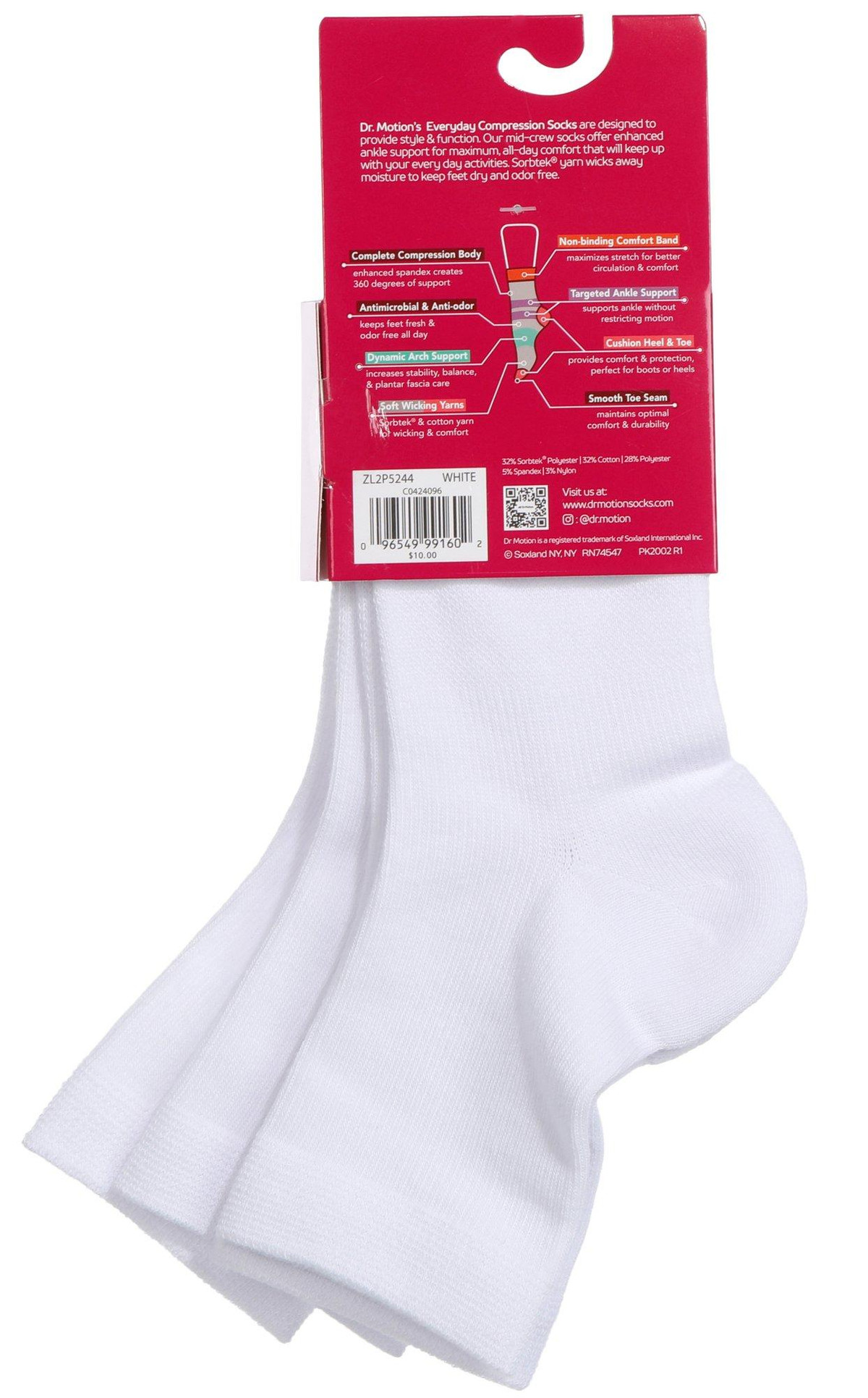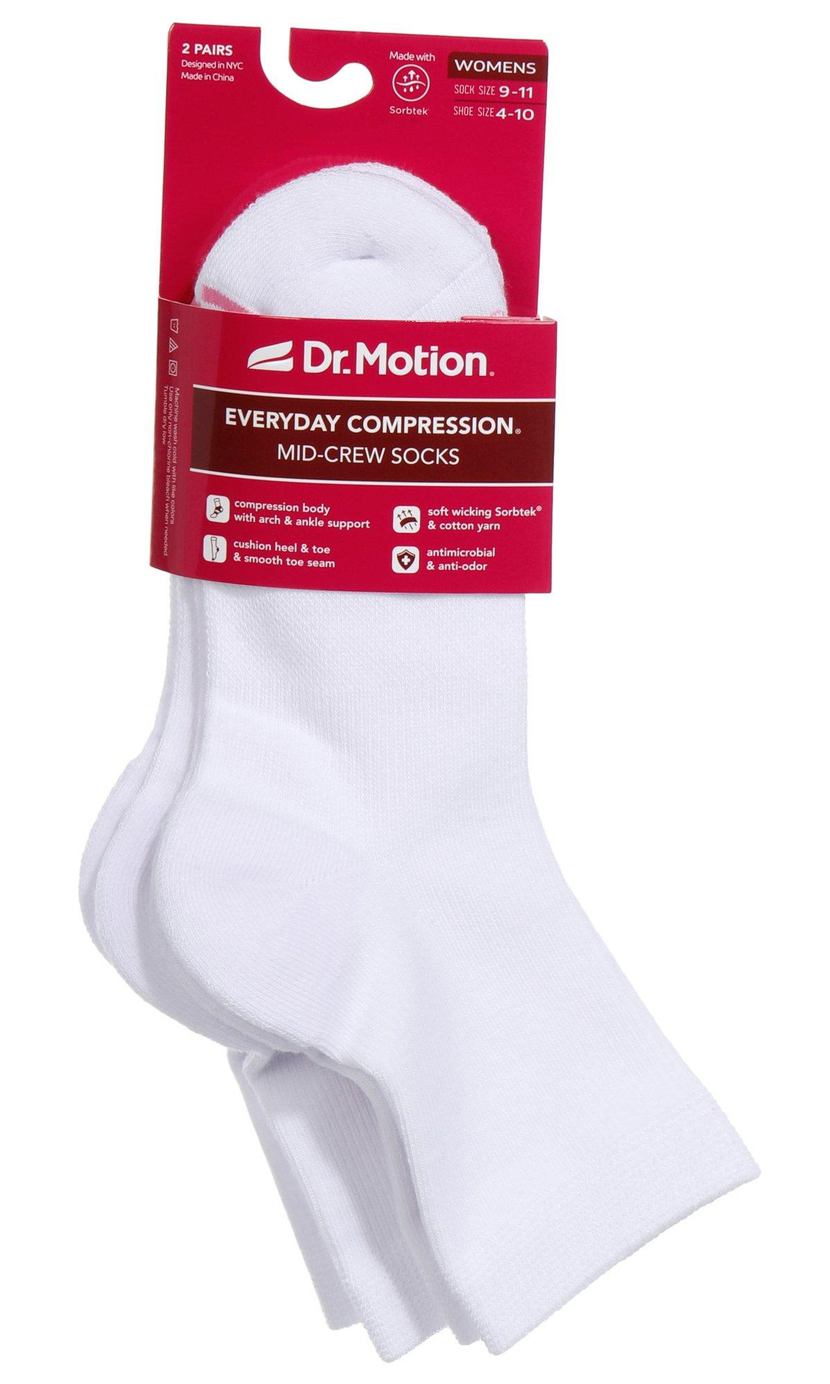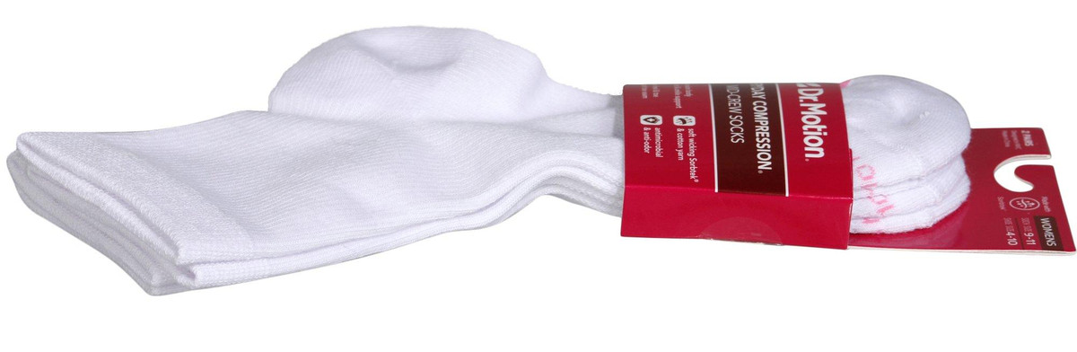 Dr. Motion women’s compression mid-crew socks come in a 2-pair pack in classic all white. Sized 911 sock and 410 shoe. Features include 360° compression, arch support, breathable mesh with wicking yarn, antimicrobial and anti-odor tech, ankle tabs with reflective logo, Y-heel fit, cushioned cotton heel/toe, and reinforced smooth toe. Fabric: 50% Nylon, 29% Cotton, 13% Polyester, 8% Spandex.