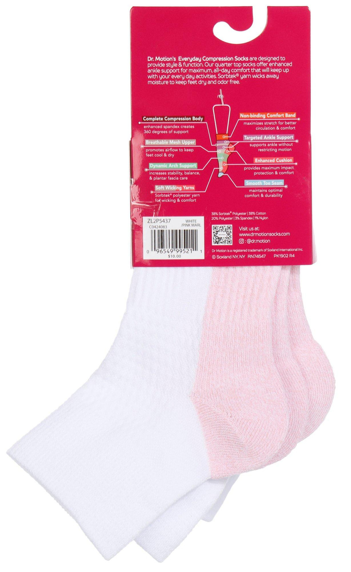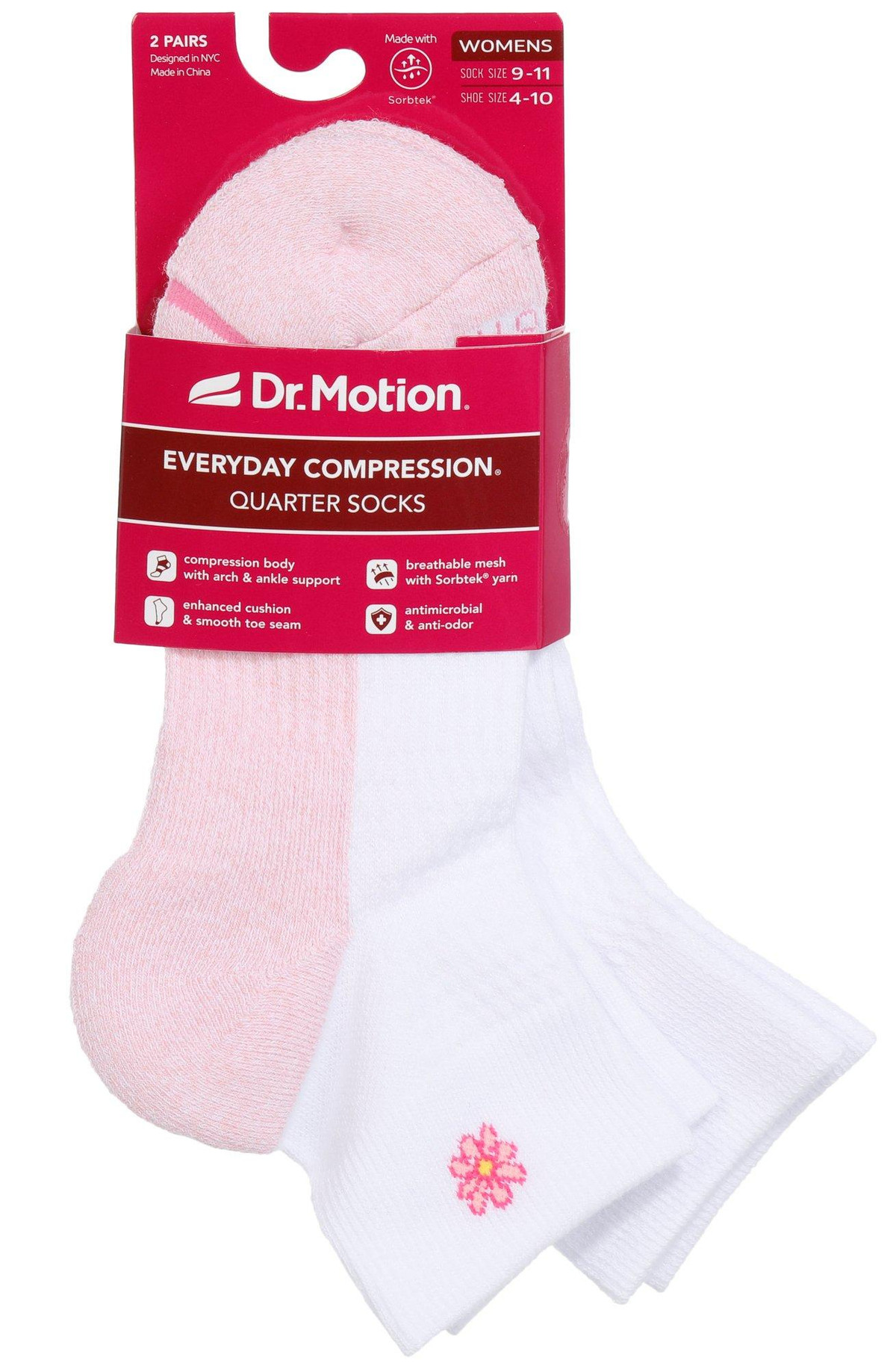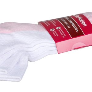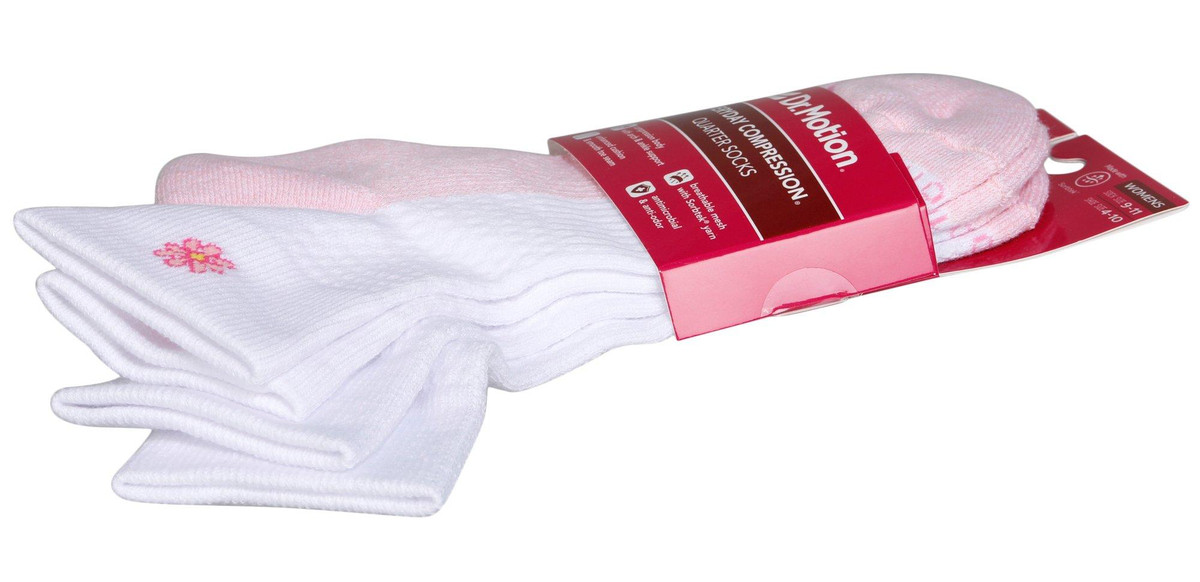Dr. Motion women’s compression quarter socks come in a 2-pair pack with updated styling. Sized 911 sock and 410 shoe. Features include 360° compression, arch support, breathable mesh with wicking yarn, antimicrobial and anti-odor tech, ankle tabs with reflective logo, Y-heel fit, cushioned cotton heel/toe, and reinforced smooth toe. Fabric: 50% Nylon, 29% Cotton, 13% Polyester, 8% Spandex.