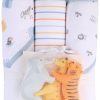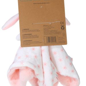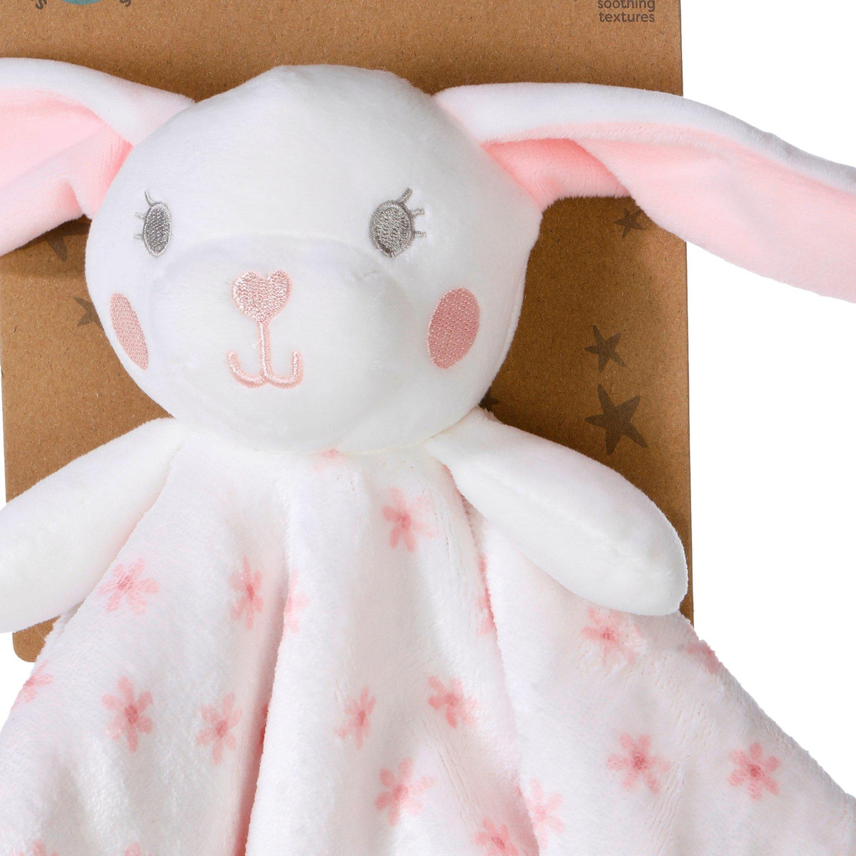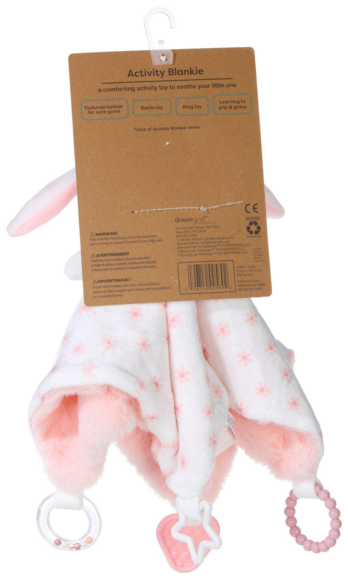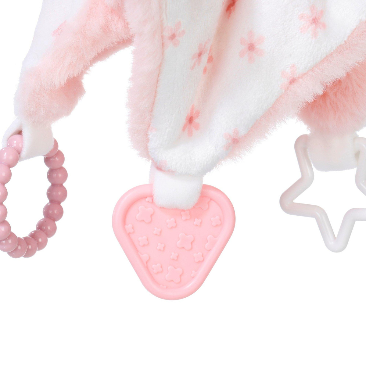 This 15-inch bunny activity blankie features a soft pink design with floral accents, crafted to soothe and engage babies through sensory play. It includes a gentle rattle, textured teether, and a grip ring to support tactile exploration and teething relief. Ideal for newborns and up, the plush bunny offers crinkly textures and comforting softness, making it a perfect companion for snuggles, playtime, or trave