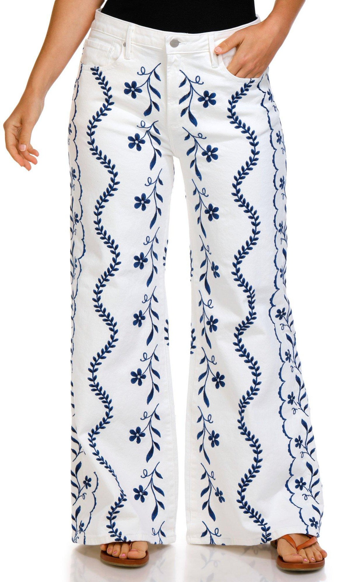 Add a touch of charm to your denim collection with the Women’s Wide Leg Penelope Embroidered Jeans. Made from a soft cotton-spandex blend, these jeans feature delicate floral embroidery, a flattering wide-leg fit, classic 5-pocket styling, and a button-fly zip closure for a timeless finish.