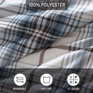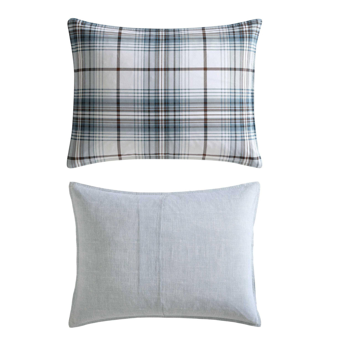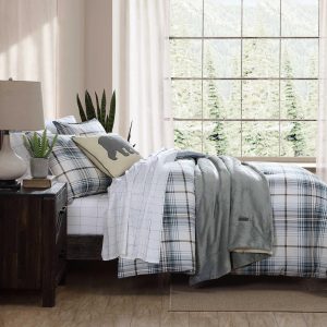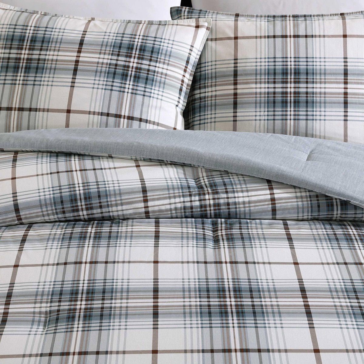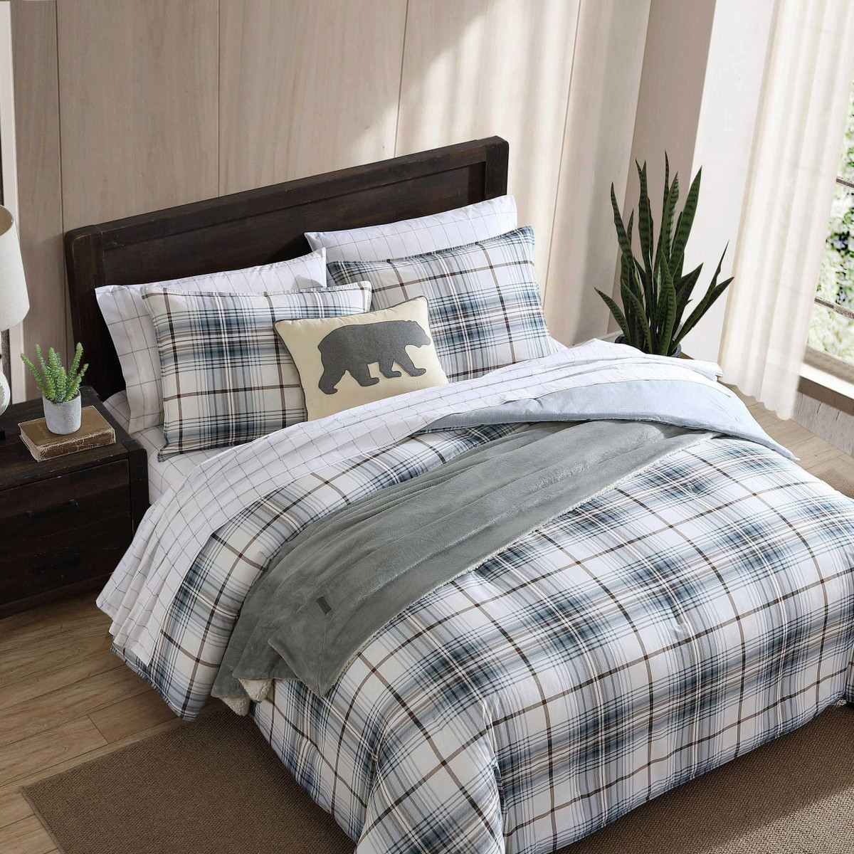 Embrace your outdoor lifestyle with the Eddie Bauer Alder Plaid Comforter Set. The comforter and matching shams feature a plaid pattern, combining rich tones of grey, blue, and brown to create a warm and inviting look. The comforter reverse has a texture print in blue and grey to add some versatility to your bedding ensemble. Great for layering. Machine washable for easy care.