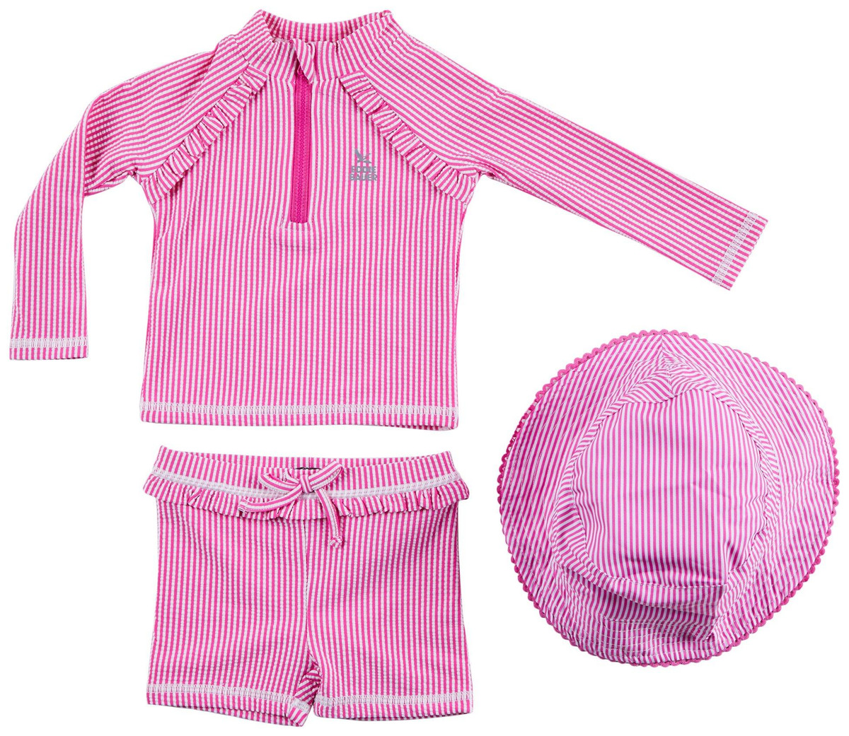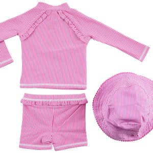Introducing the Baby Girls 3 Pc Striped Rash Guard Swim Set, made from a durable blend of polyester and spandex for comfort and flexibility. This stylish set includes a long sleeve quarter zip rash guard, shorts, and a hat, all featuring a vibrant stripe print. Perfect for beach days or poolside fun, this swim set offers excellent sun protection and ensures your little one stays comfortable and fashionable while enjoying water activities.