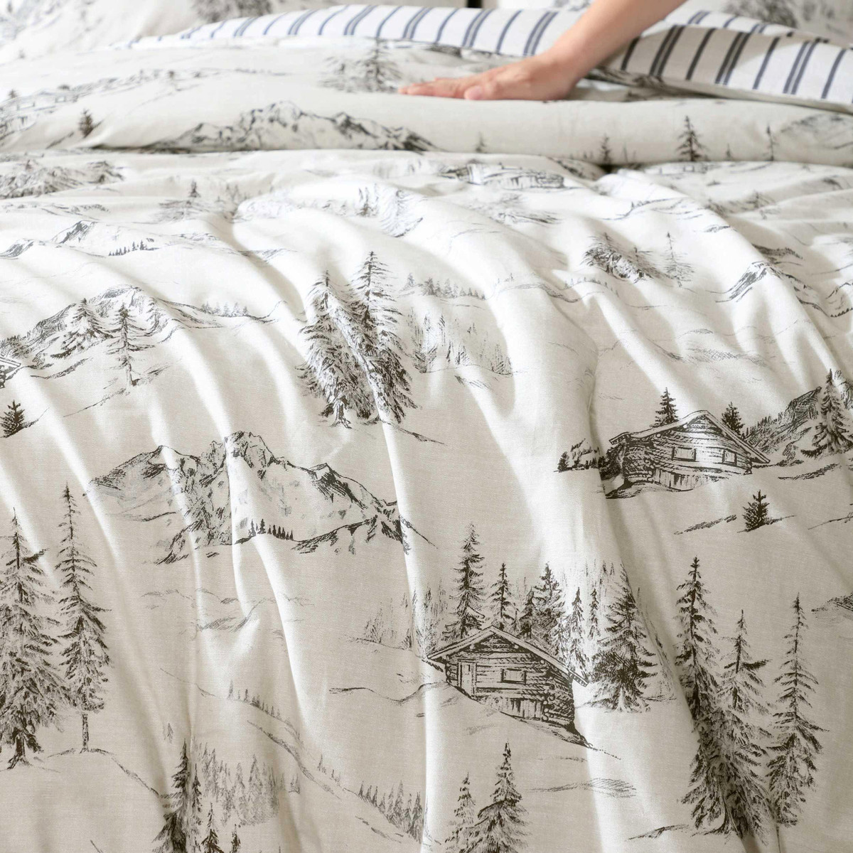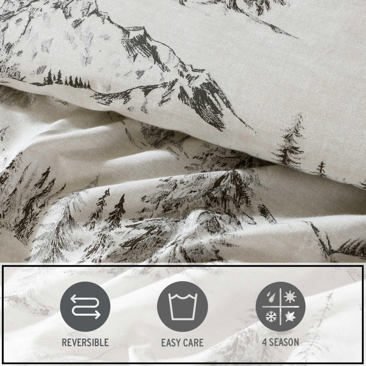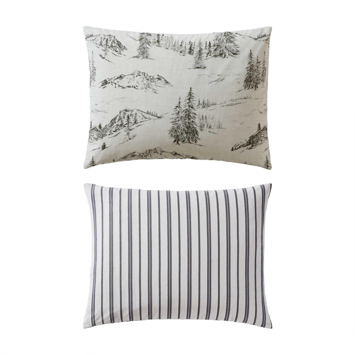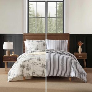 Turn your bedroom into a retreat with the Eddie Rocky Mountain Comforter Set. The outdoor inspired design reverses to a classic stripe. This super soft comforter is sure to keep you warm and cozy throughout those frigid winter nights. The comforter is 100% cotton and has a 100% polyester fill. The included shams feature a two-piece center closure. Layer in our Eddie Bauer sheet sets and accessories to create a unique look. The ensemble is machine washable for easy care.