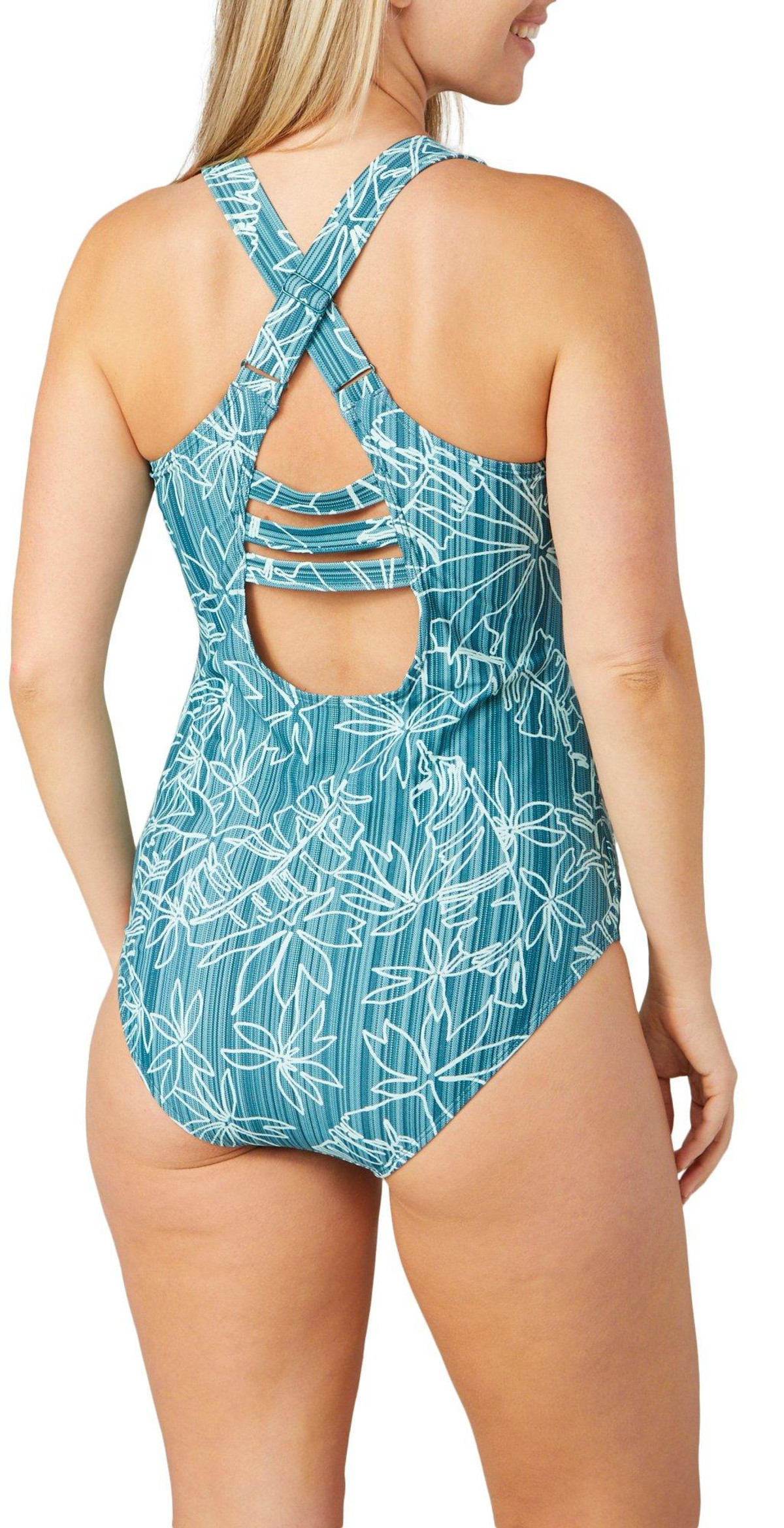 This chic One Piece Swimsuit features a high neck design, offering a sleek and sophisticated look. The multi-strap detail adds a trendy touch, while the adjustable straps ensure a perfect fit. Soft removable cups provide comfort and support, making this swimsuit ideal for beach days or poolside lounging. Fabrication is 82% nylon, 18% spandex. Lining is 100% polyester.