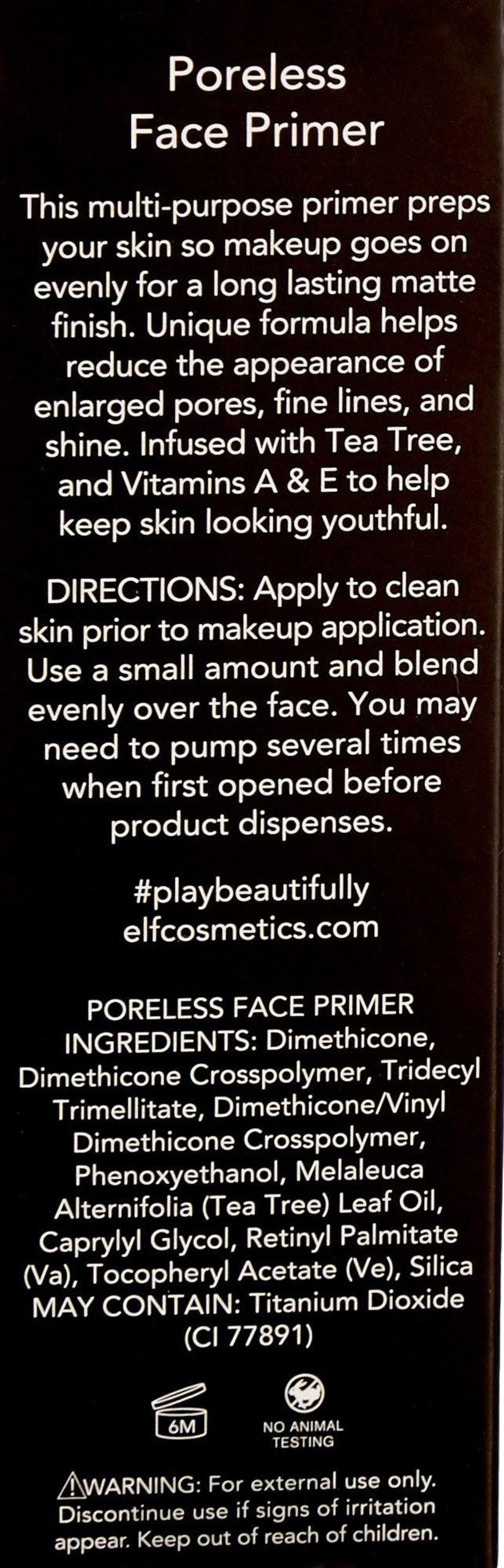 This poreless face prmer from Elf preps your skin so makeup goes on evenly for a long lasting matte finish. Infusd with tea tree, vitamin a, and vitamin e. 6 months expiration from first use. 0.47 fl oz.