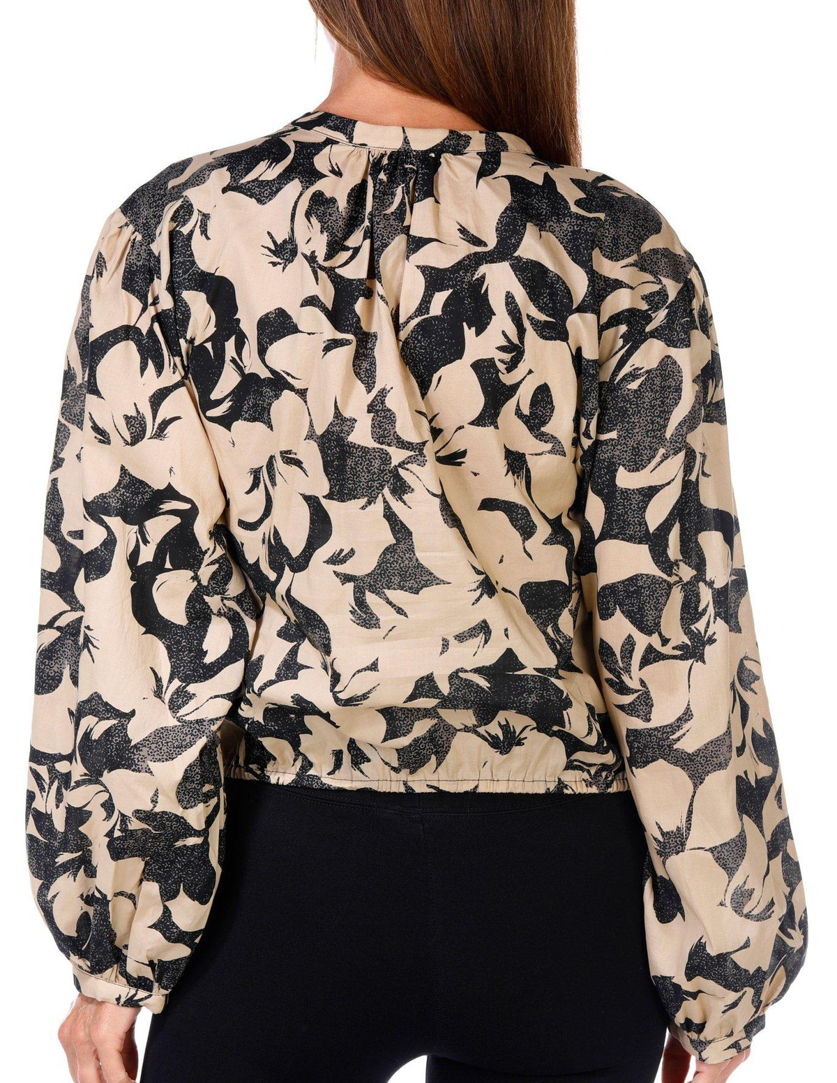This long sleeve blouse features a stylish split neckline and an allover floral print, perfect for both casual and dressy occasions. Fabrication is 100% cotton.
