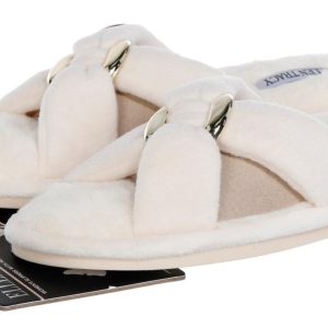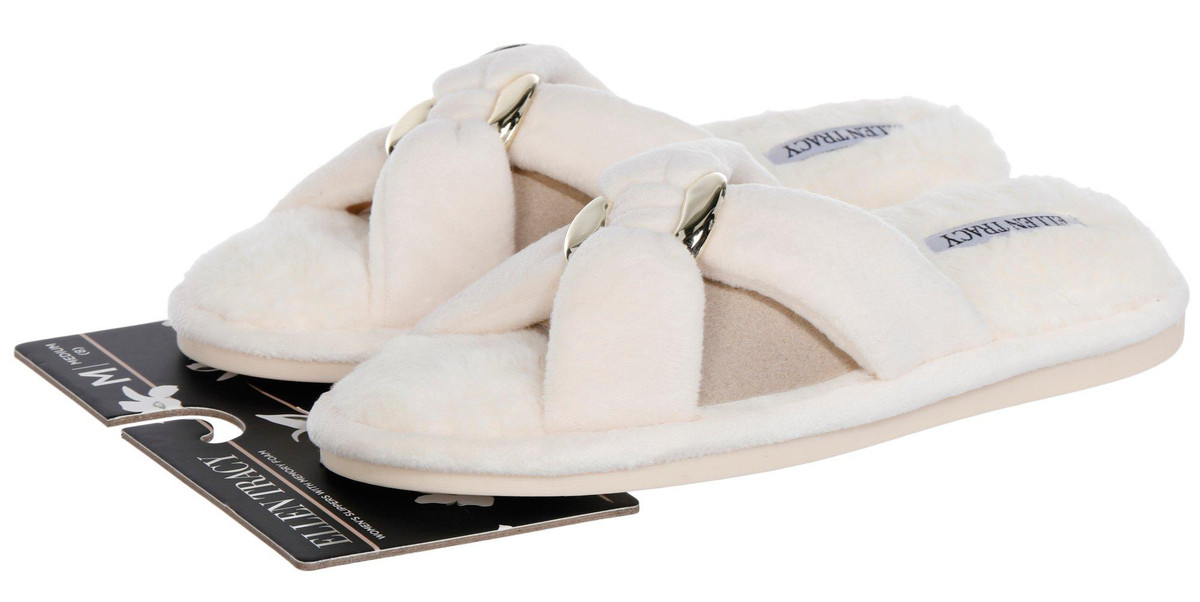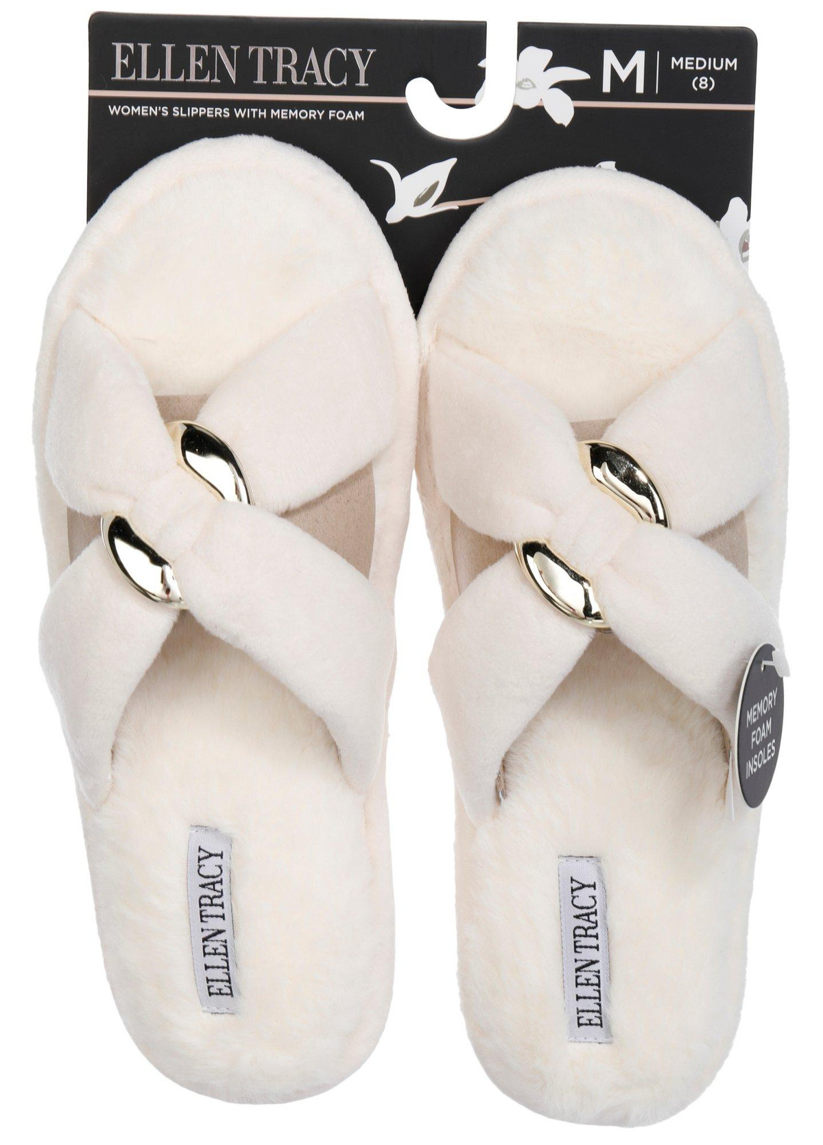 Ellen Tracy Criss Cross Plush Slippers with Ring Detail offer cozy elegance with soft, luxurious materials and a chic metallic ring accent. Designed with memory foam cushioning for all-day comfort, these slippers keep your feet warm while adding a stylish touch to your at-home look.