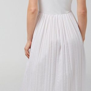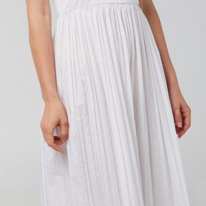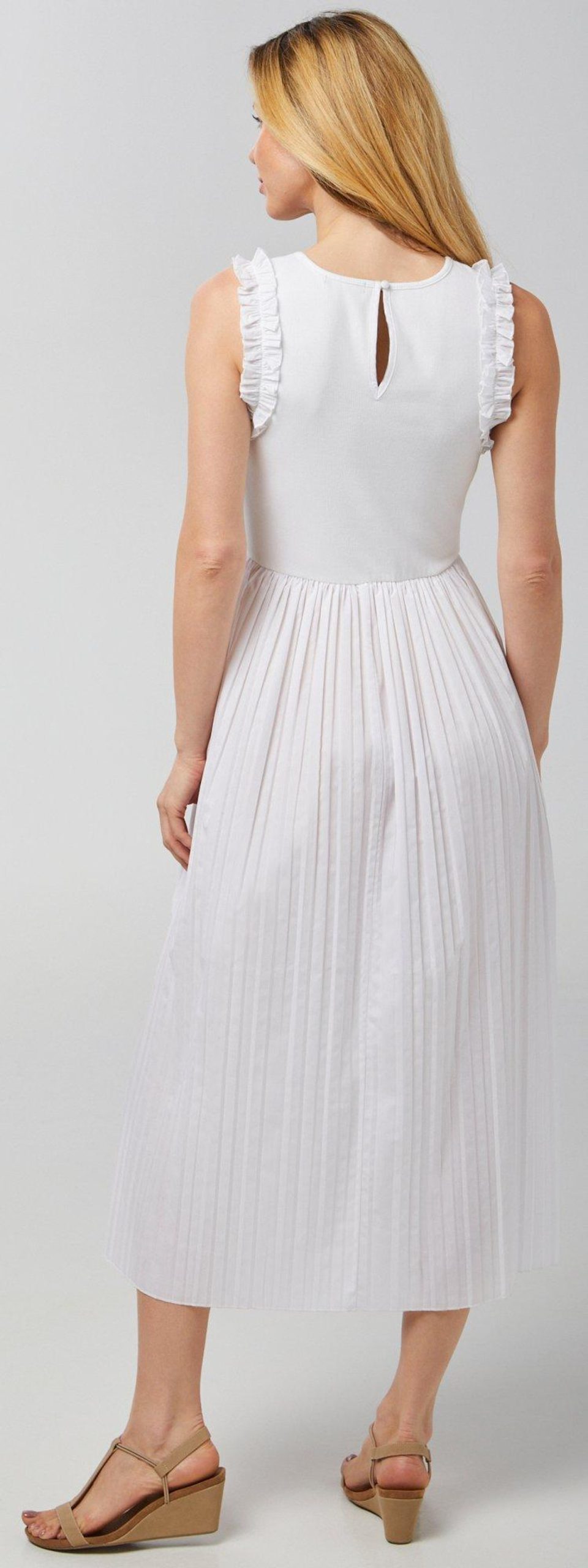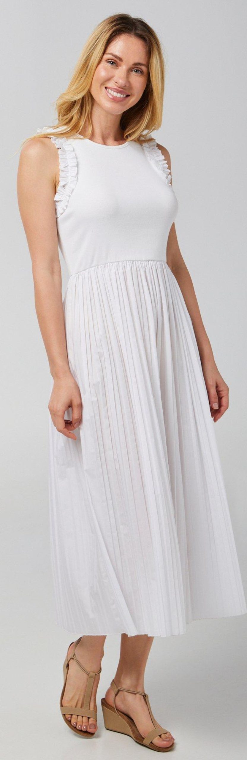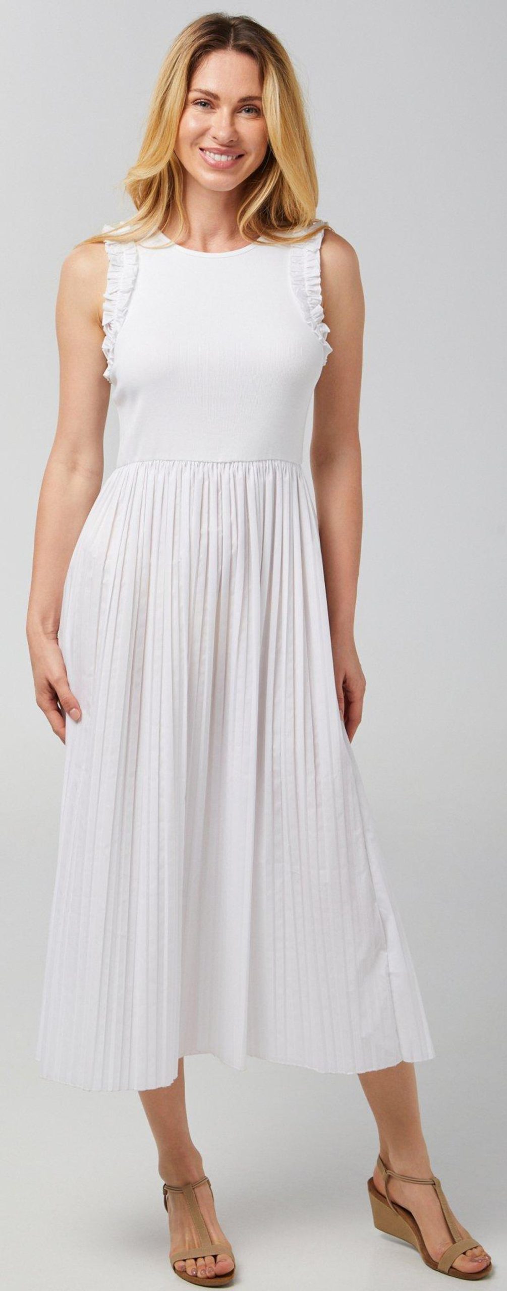 Introducing our Women’s Sleeveless Ruffle Midi Dress, crafted from a blend of cotton, polyester, and spandex. This stylish dress features a solid color, a pleated skirt, and elegant ruffle detail on the upper. The midi length adds a touch of sophistication, making it perfect for both casual and formal occasions. Embrace effortless style and comfort with this versatile and chic dress.