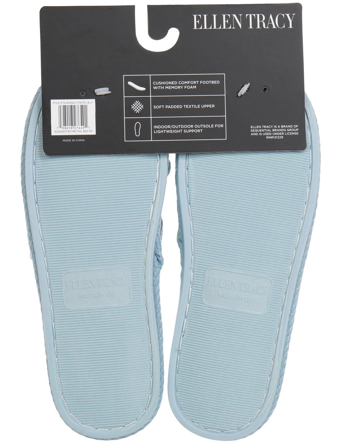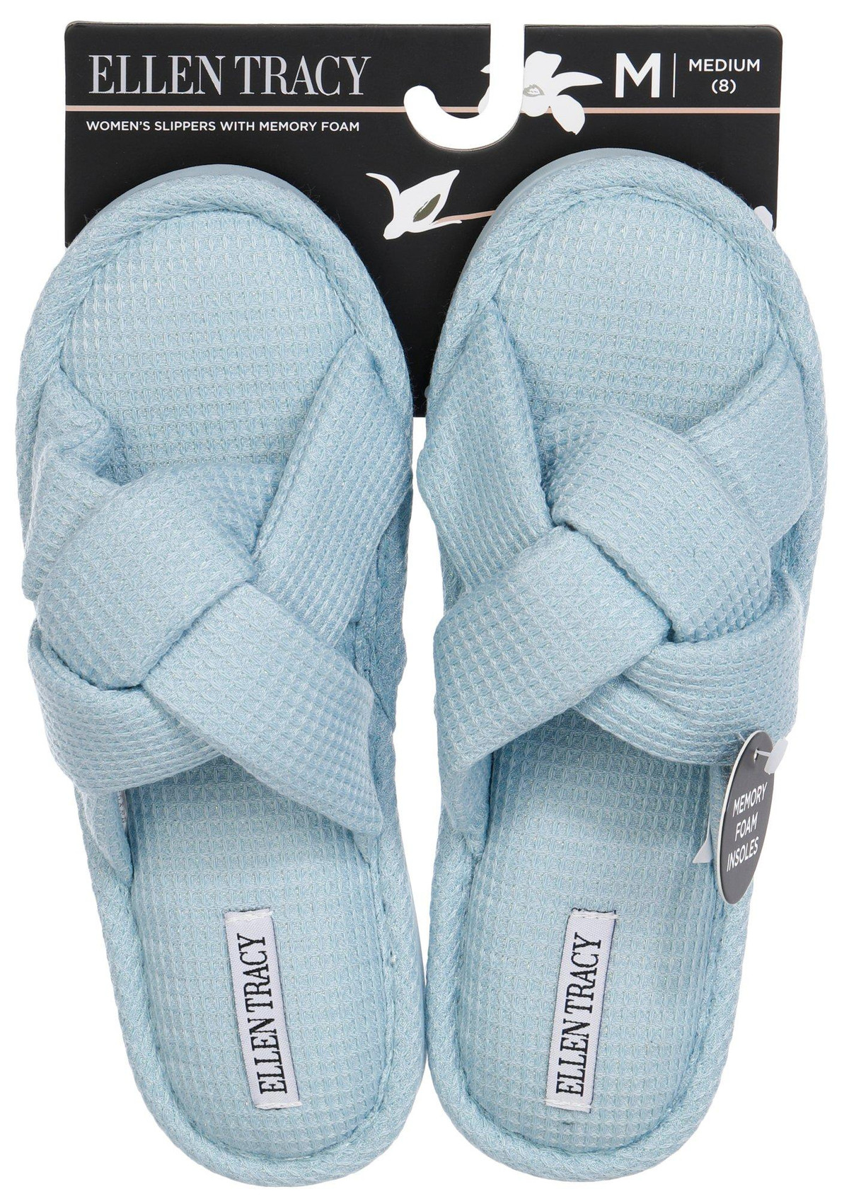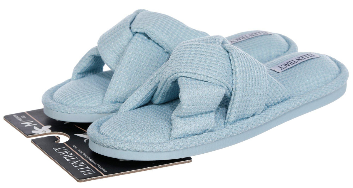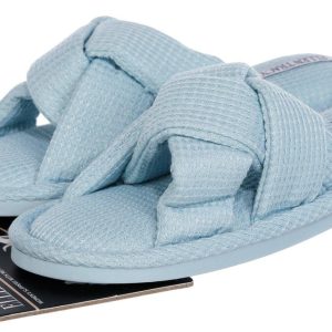 Bow Cross Slippers in mint feature a breathable waffle knit fabric finish for lightweight comfort. Designed with a charming bow and delicate floral accents, these slippers include memory foam cushioning for soft, supportive wear. Perfect for adding a fresh, feminine touch to your everyday loungewear.