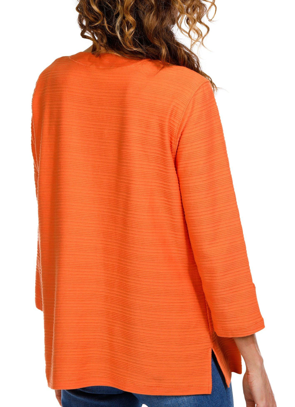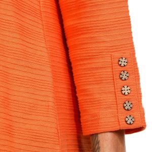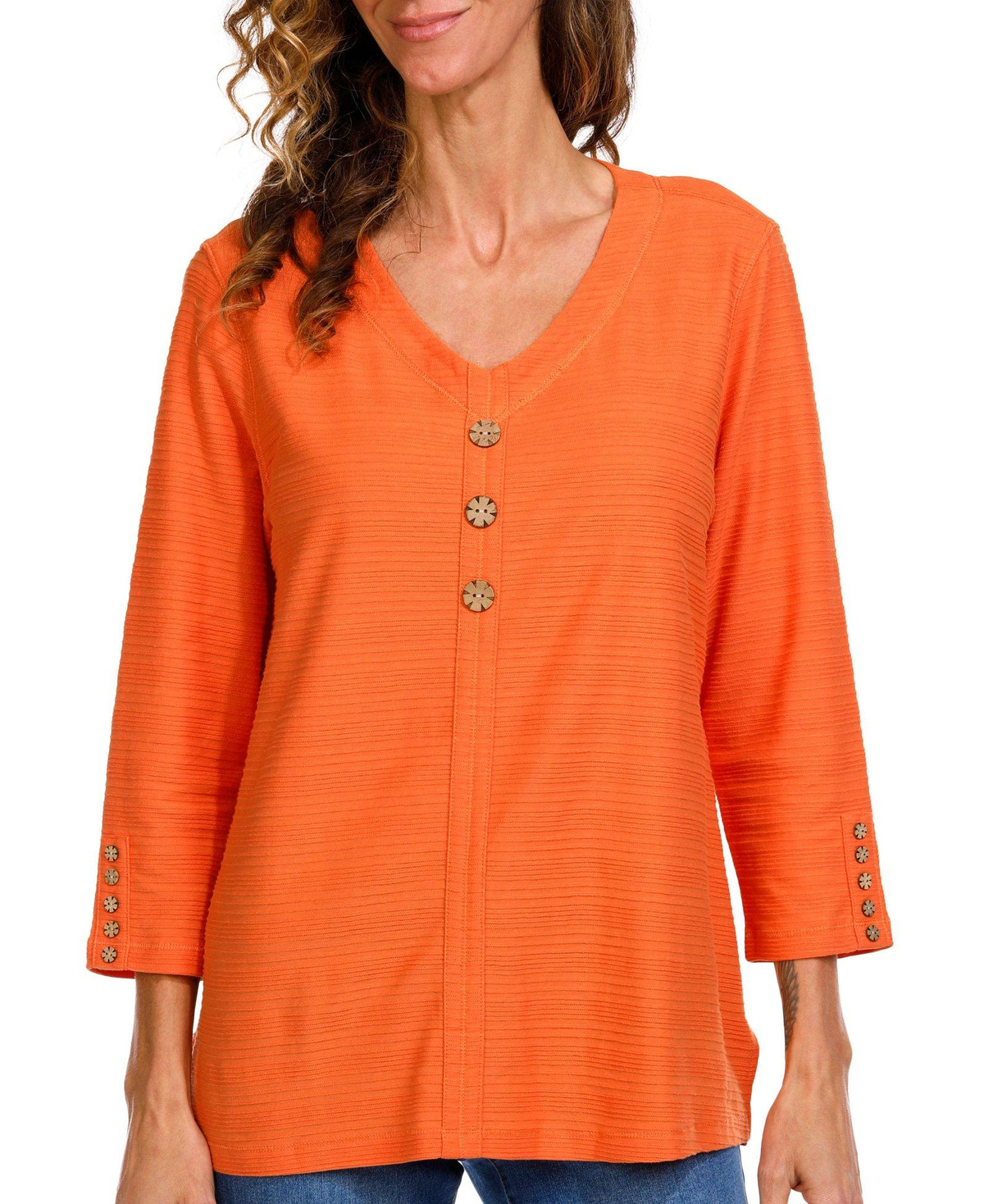 This 3/4 sleeve top features textured embroidered details and decorative wooden buttons for a natural handcrafted look. Soft and stylish its perfect for adding charm to any casual outfit.