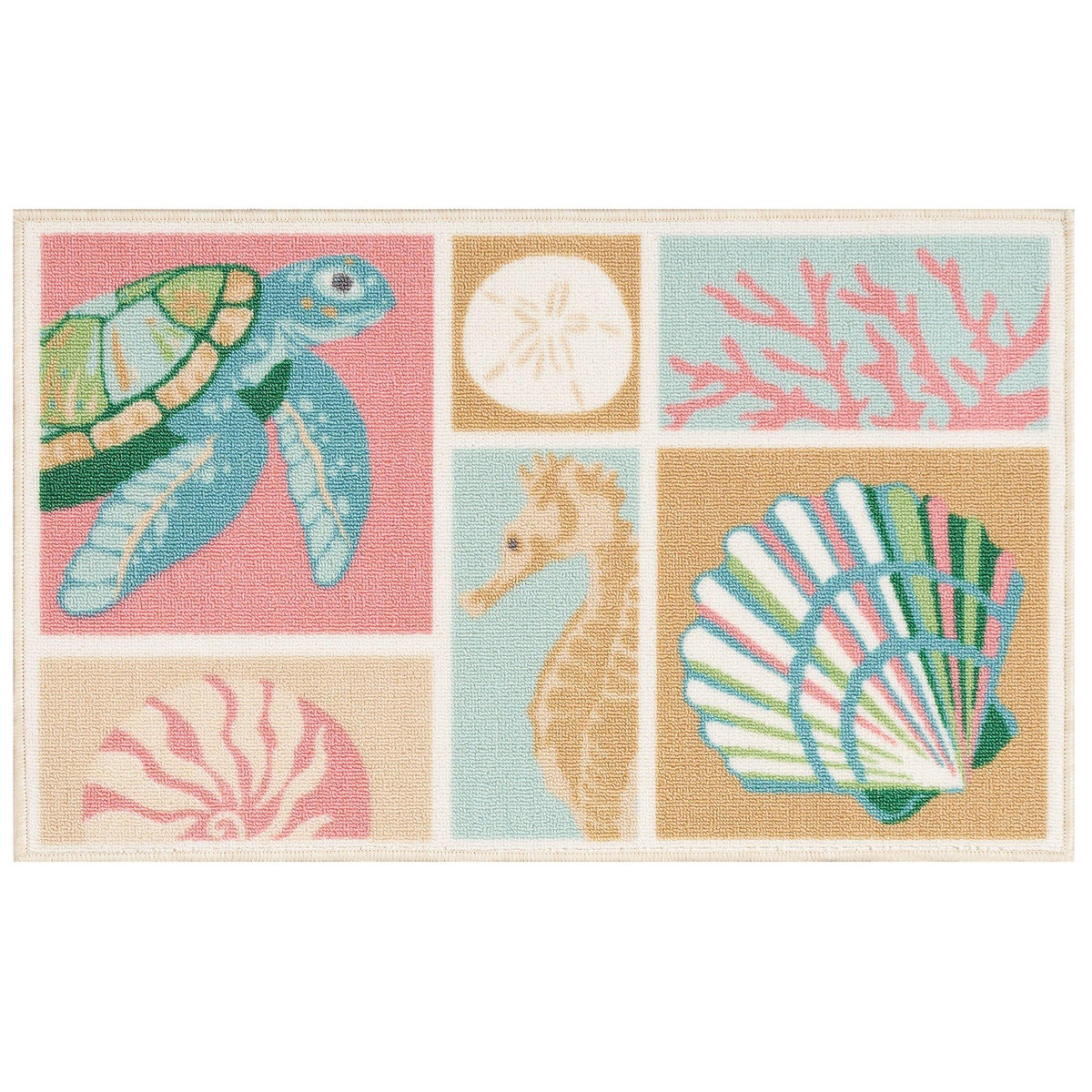 Enhance any space in your home with this fun and colorful coastal-themed accent rug by Essential Elements! It features a fun and colorful grid of different sea creatures, and a nonskid backing. Measures approximately 17”L x 28”W.