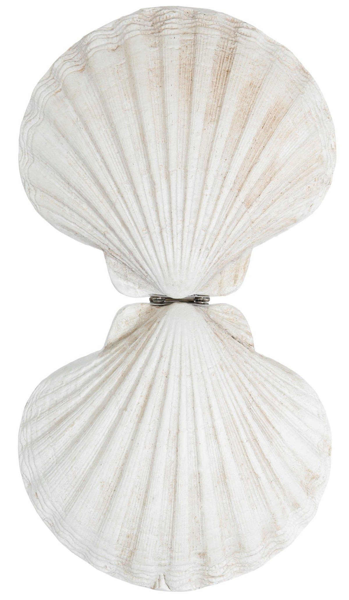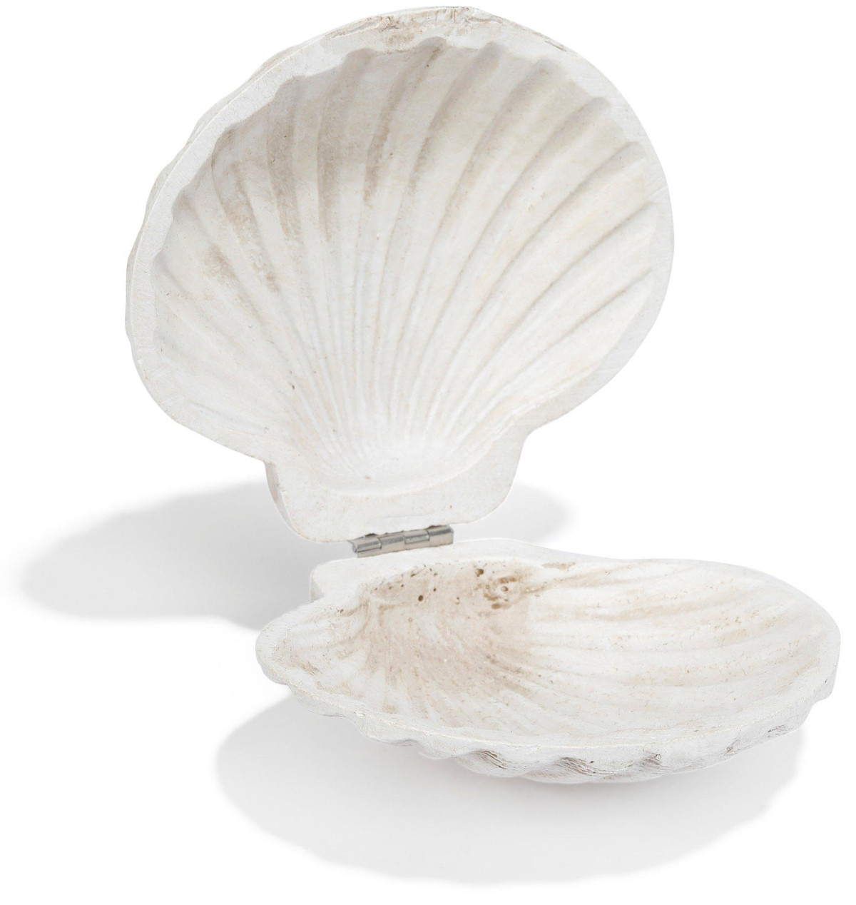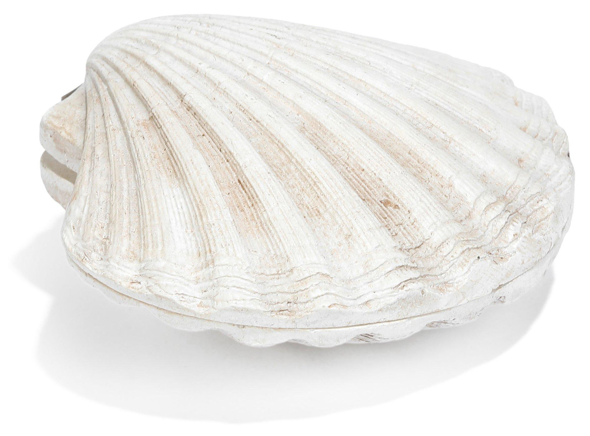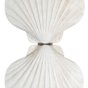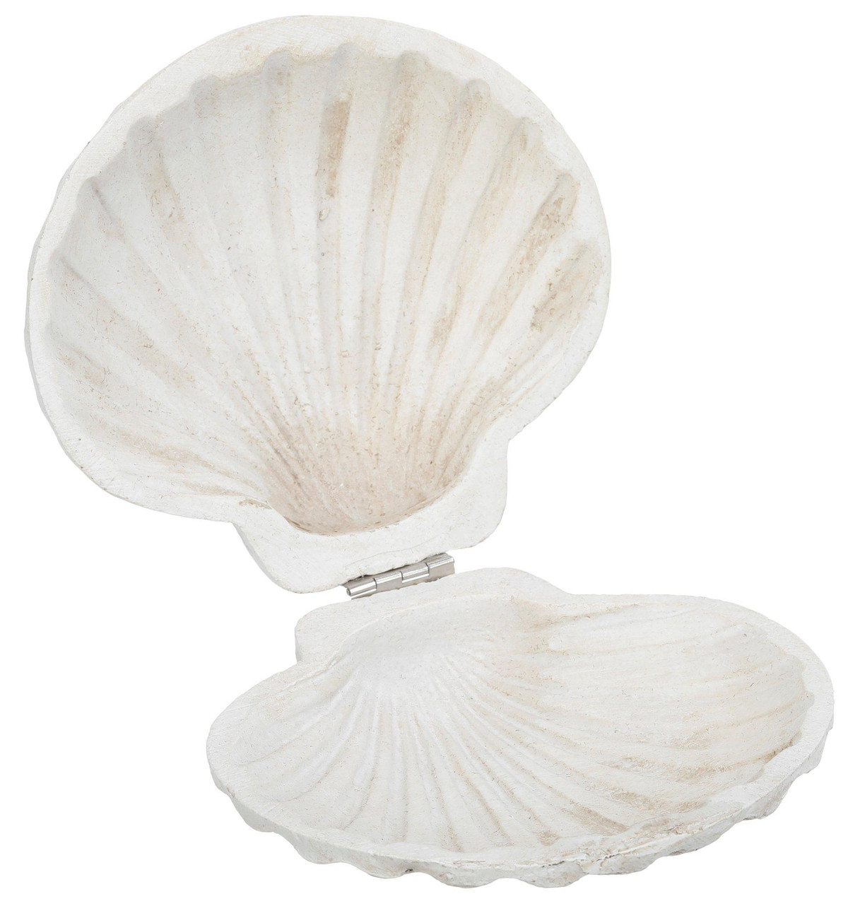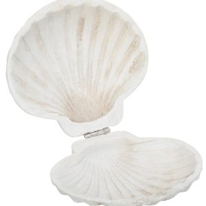 Add coastal charm to your space with this resin scallop shell trinket box. Featuring a realistic shell design and hidden storage, its perfect for holding small keepsakes while elevating your décor. Ideal for mantels, shelves, or coffee tables in any beach-inspired setting. Fabrication is 100% resin. Measures approximately 5 in x 4.5 in x 2 in.