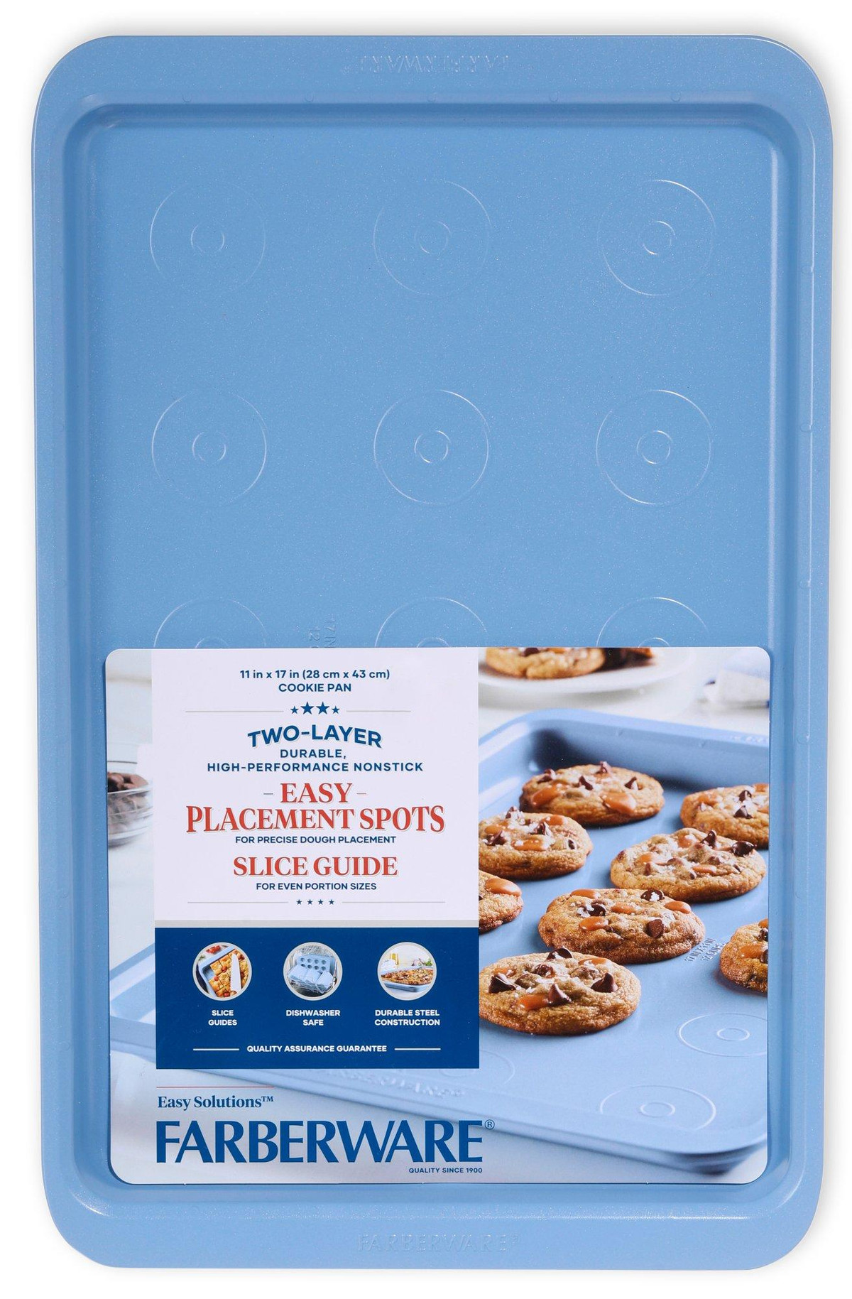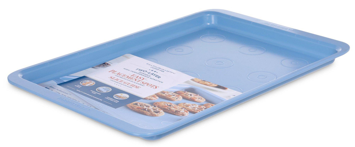 Designed for convenient, easy baking, this sheet pan boasts a sturdy, heavy-duty steel construction which resists warping, and has two layers of smooth, durable, easy-release nonstick. Unique features include cookie outlines on the pan that show you just where to plop down your dough and lines to help guide cutting into equal portions.