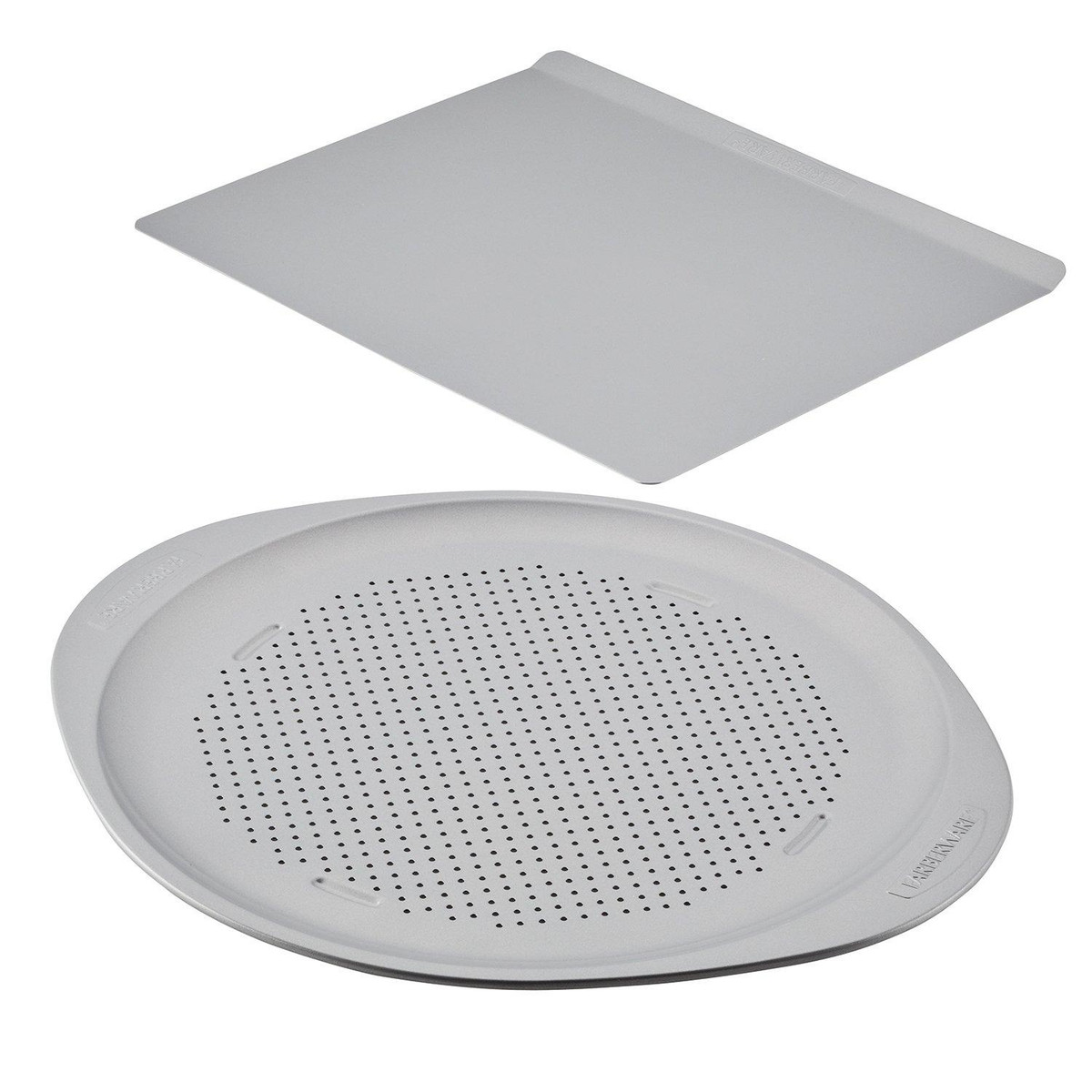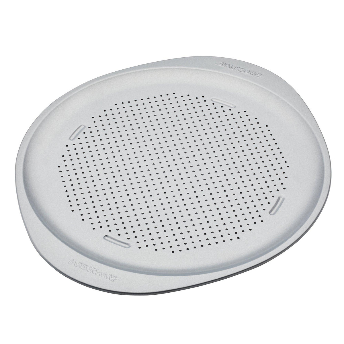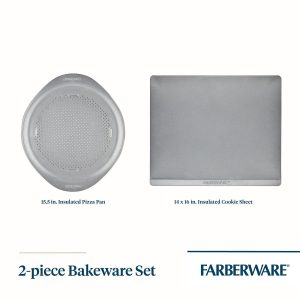 Farberware makes stylish, inventive cooking supplies for everyday use. This set of one baking sheet and one pizza pan features heavy gauge steel, baking pan features and insulated air pocket for airflow, and a perforated pizza pan. Measures 15.5Dia (pizza pan), 14W x 16L (baking sheet).