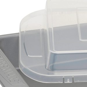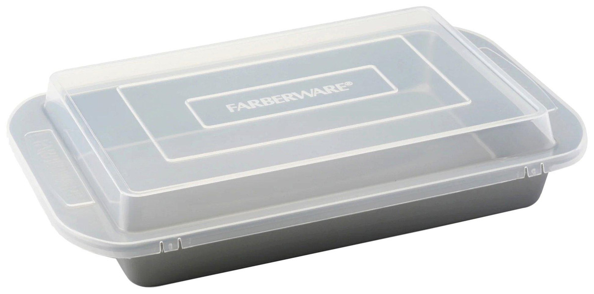 Farberware makes stylish, inventive cooking supplies for everyday use. This cake pan features heavy-duty construction, non-stick surface that makes cleaning easy, and is oven safe up to 450 degrees. Measures 9”L x 13”W x 2”H. Lid included.