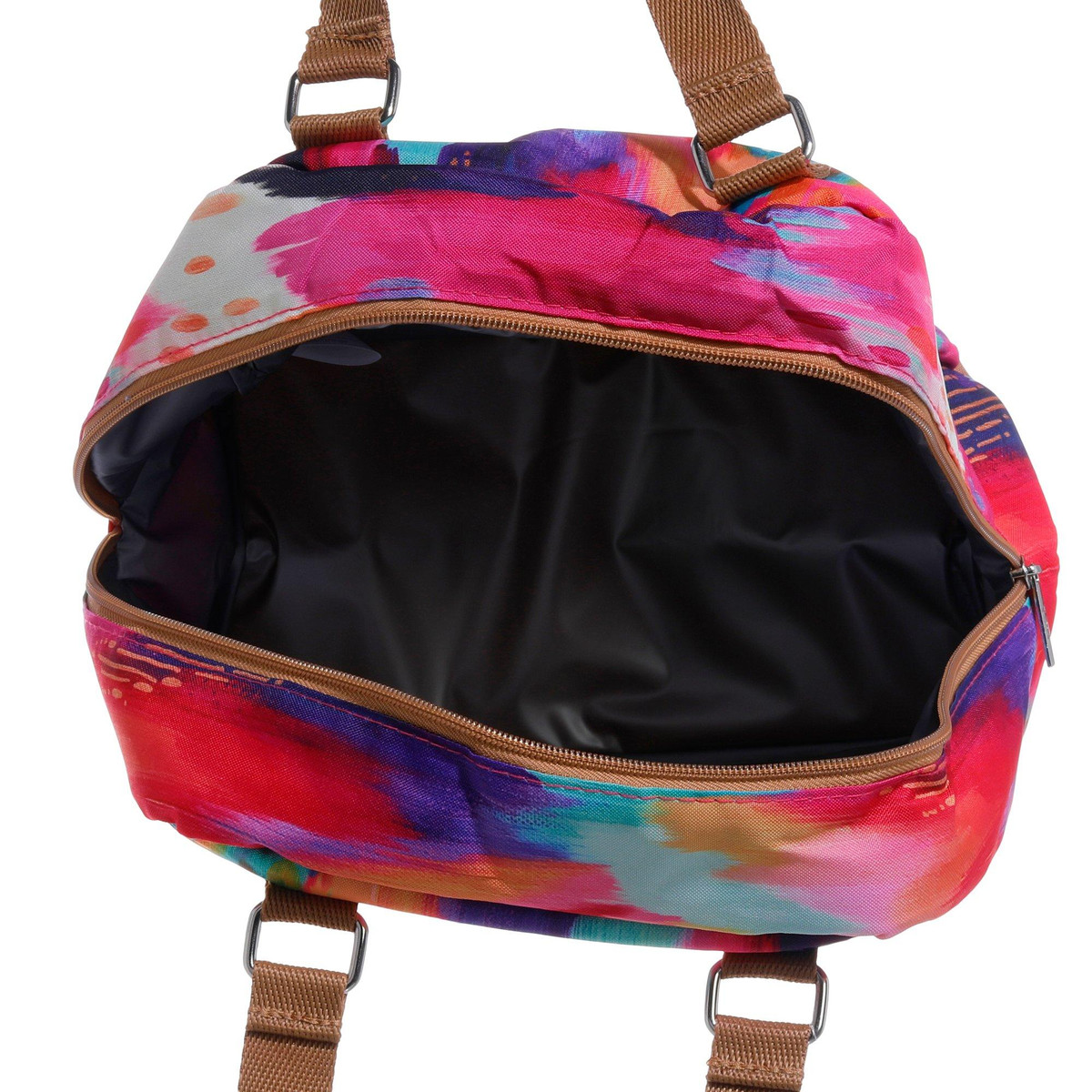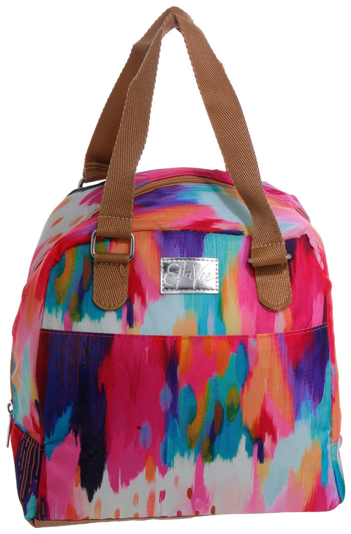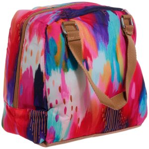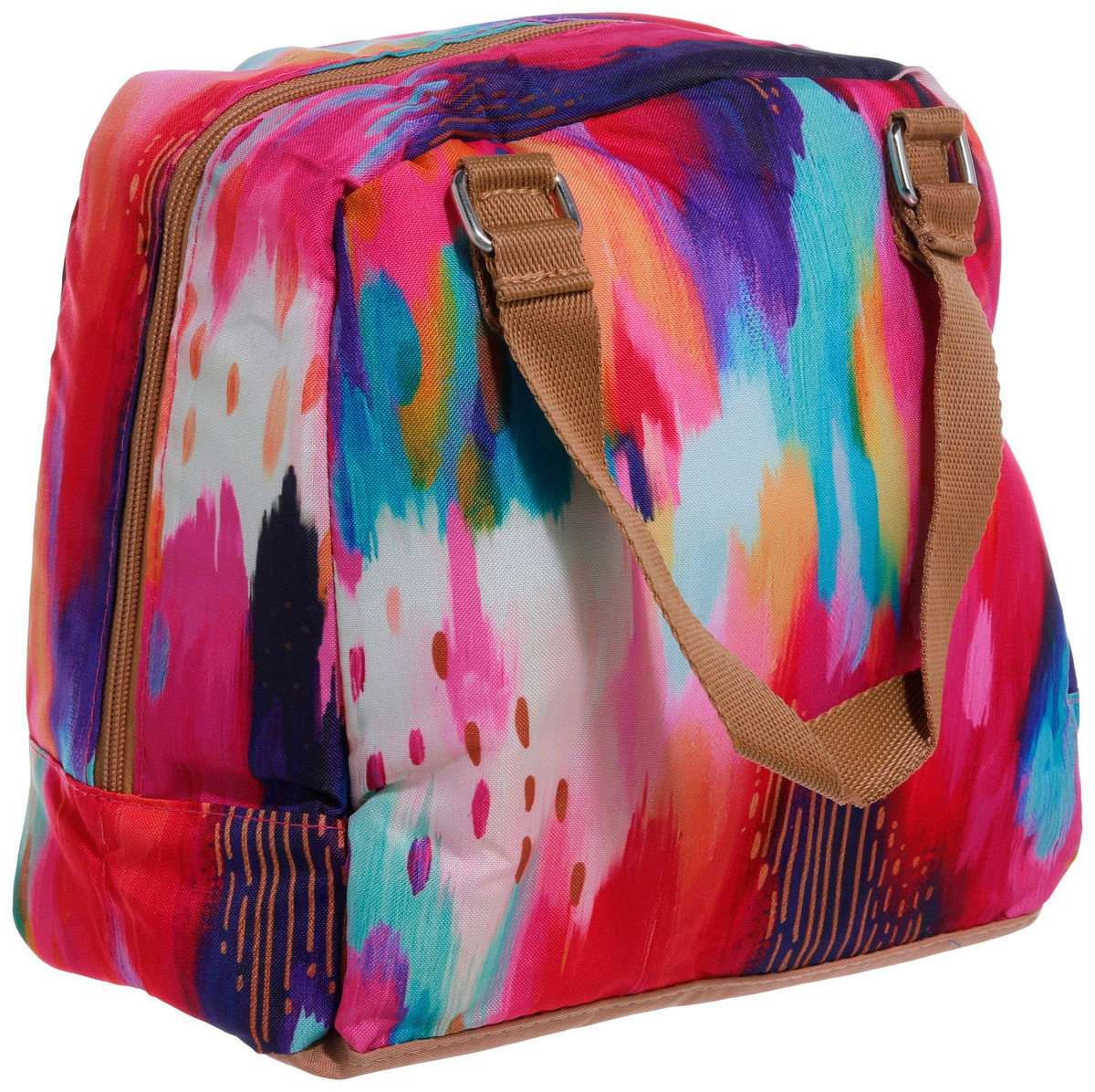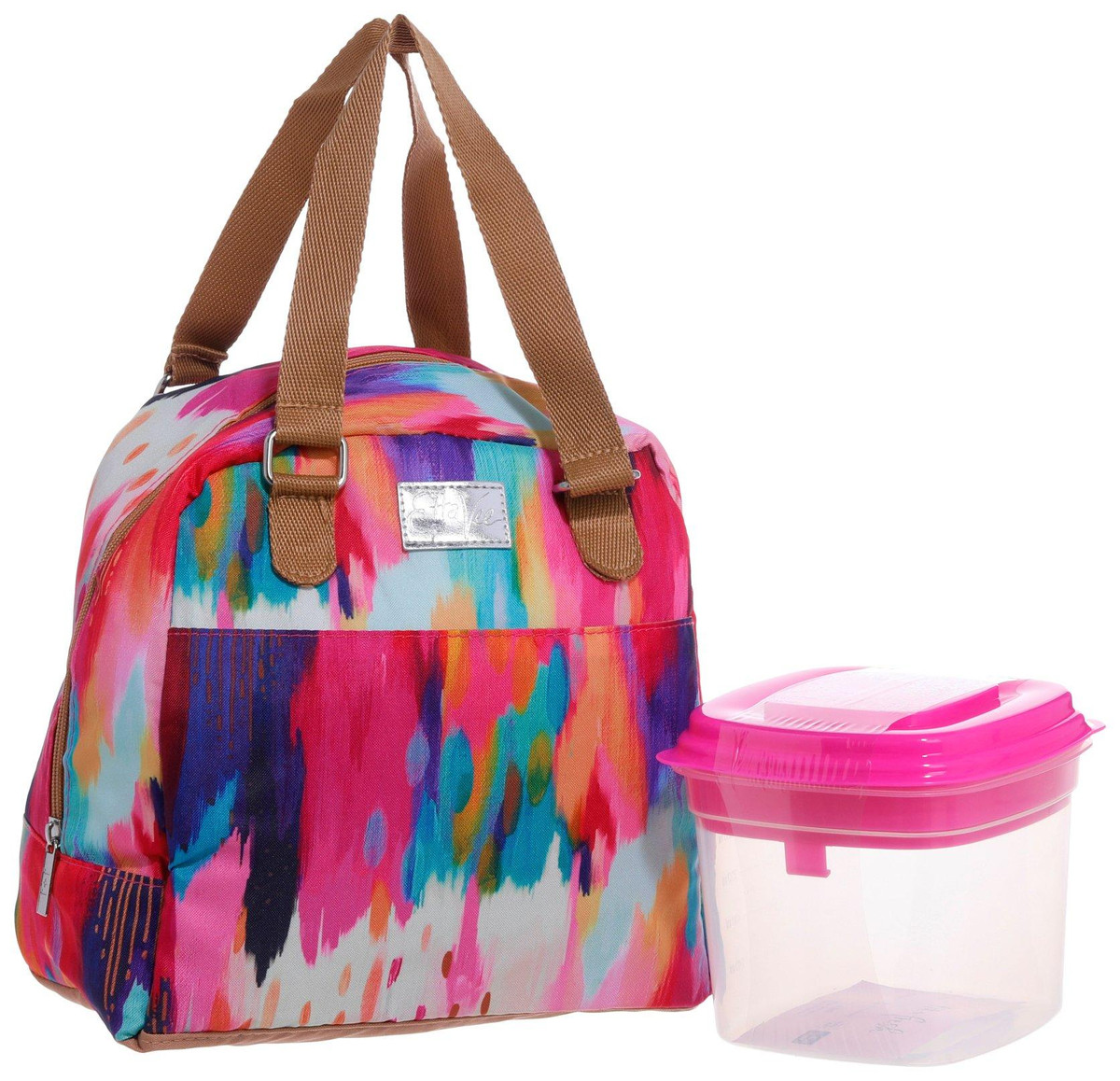 Carry your meals in style with this chic Abstract Print Lunch Tote Bag. Featuring two top handles, the main zip compartment includes two matching plastic storage containers, keeping your food organized and fresh. Gold tone hardware adds a touch of elegance, while one large exterior slip pocket provide extra storage for essentials. Perfect for work, school, or on-the-go! Measures approximately 10 in x 6 in x 9 in.