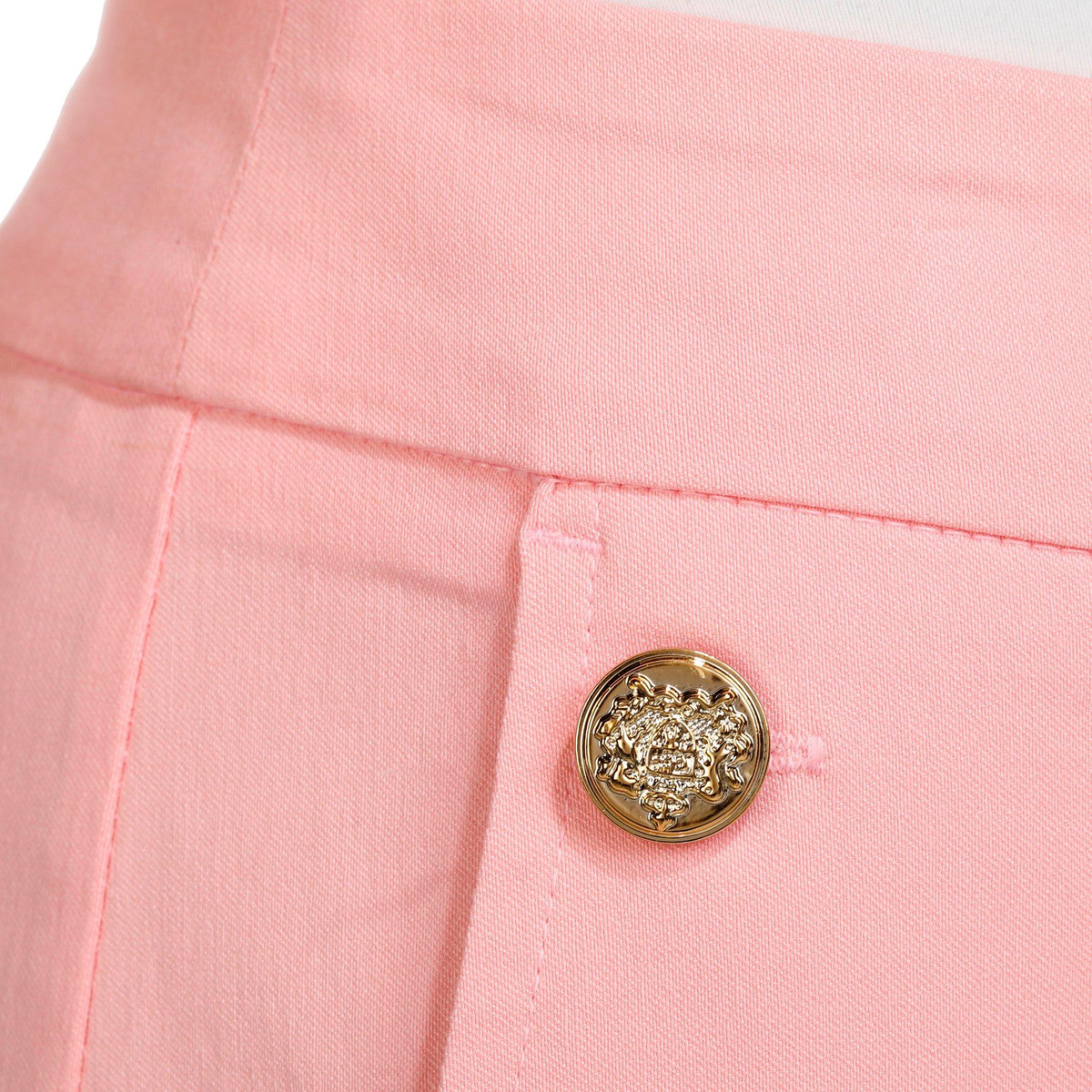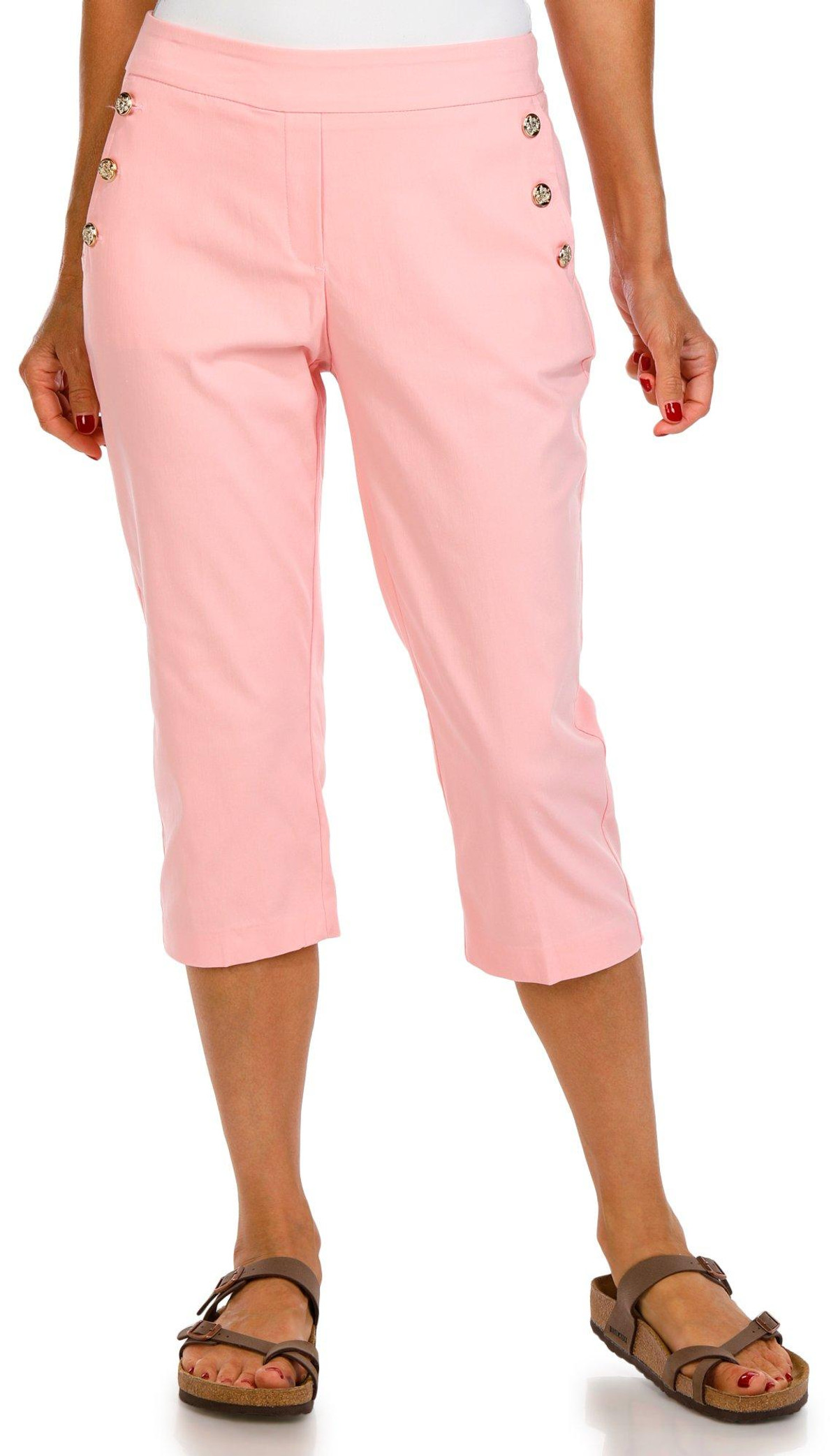 These sailor capri pants feature a solid color with a pull on waistband and gold button accents. The capri length and nautical inspired details offer a stylish and comfortable look for warm weather days.