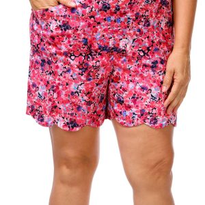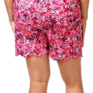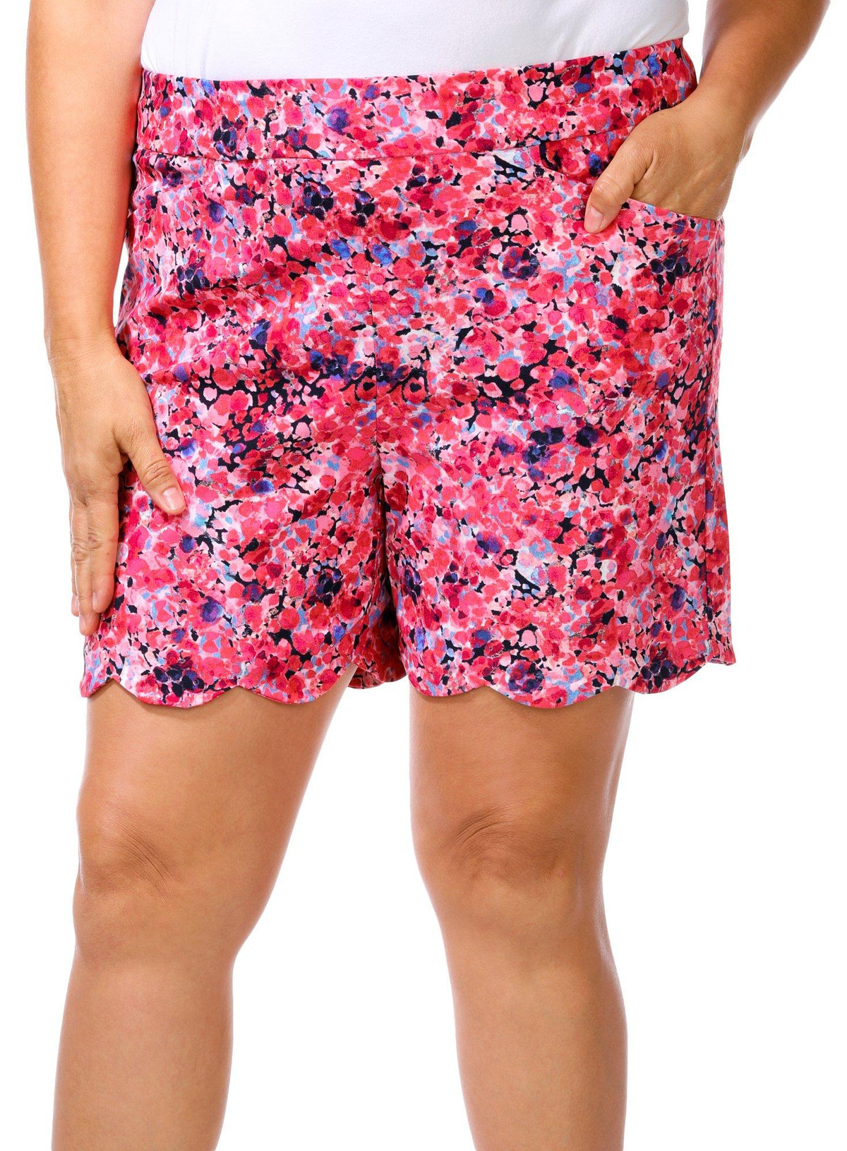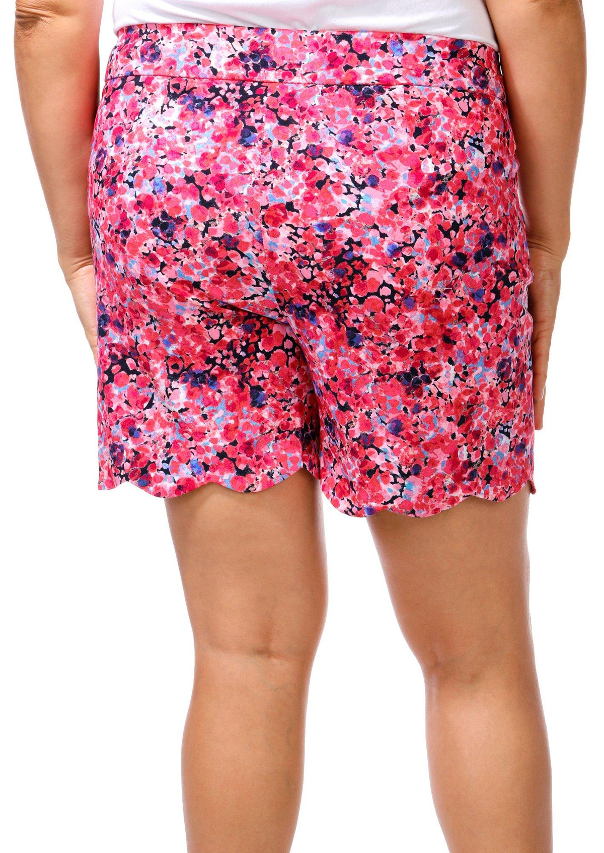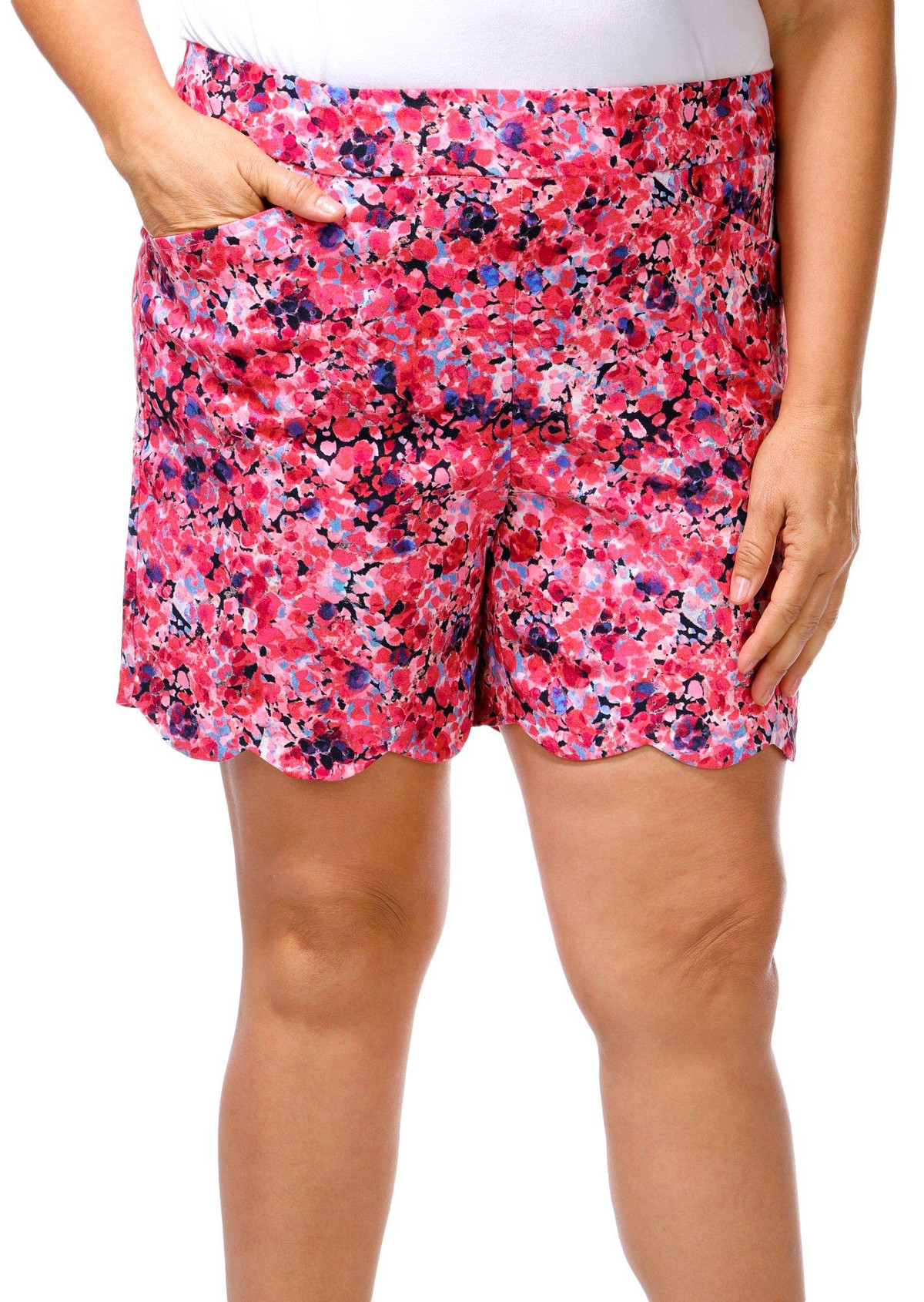 Add playful polish to your summer look with these Plus Spray Dot Scalloped Bermuda Shorts. Made from a comfy blend of rayon, nylon, and spandex, they feature a charming spray dot print, pull-on waistband, front pockets, and a scalloped hem for a fun, feminine finish.