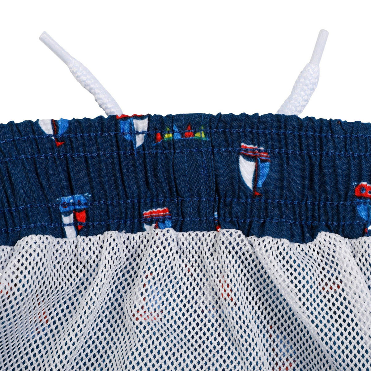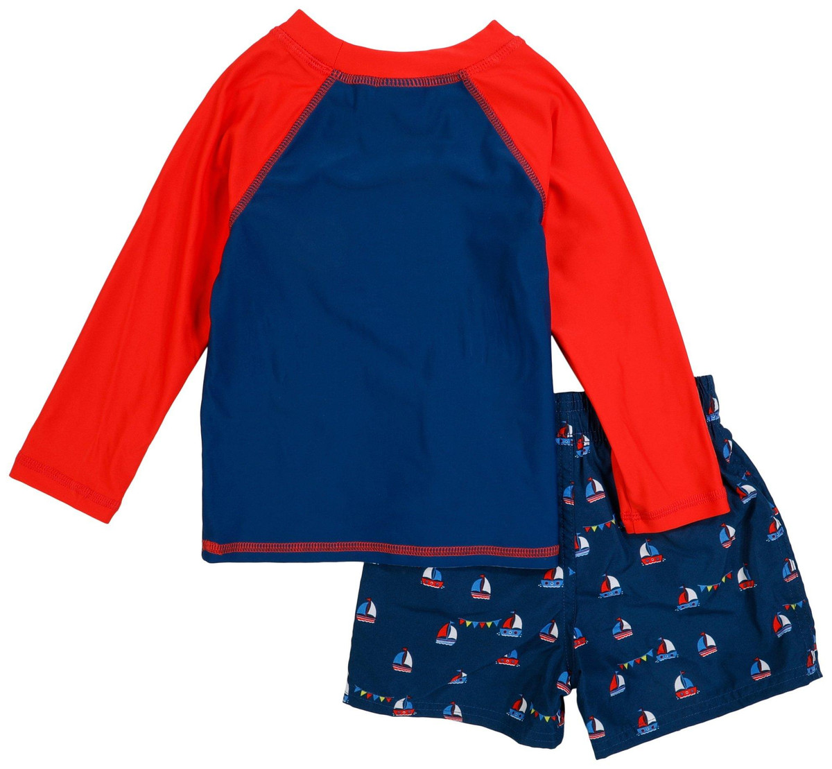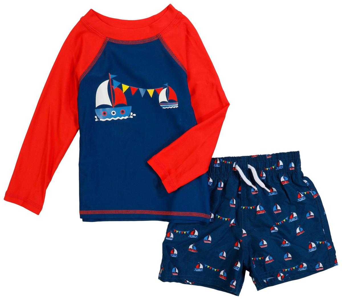 Rash guard: Sail Boats printed graphic, crew neck, raglan sleeves. Swim trunks: elastic drawstring waistband, mesh brief lining. 100 % Polyester