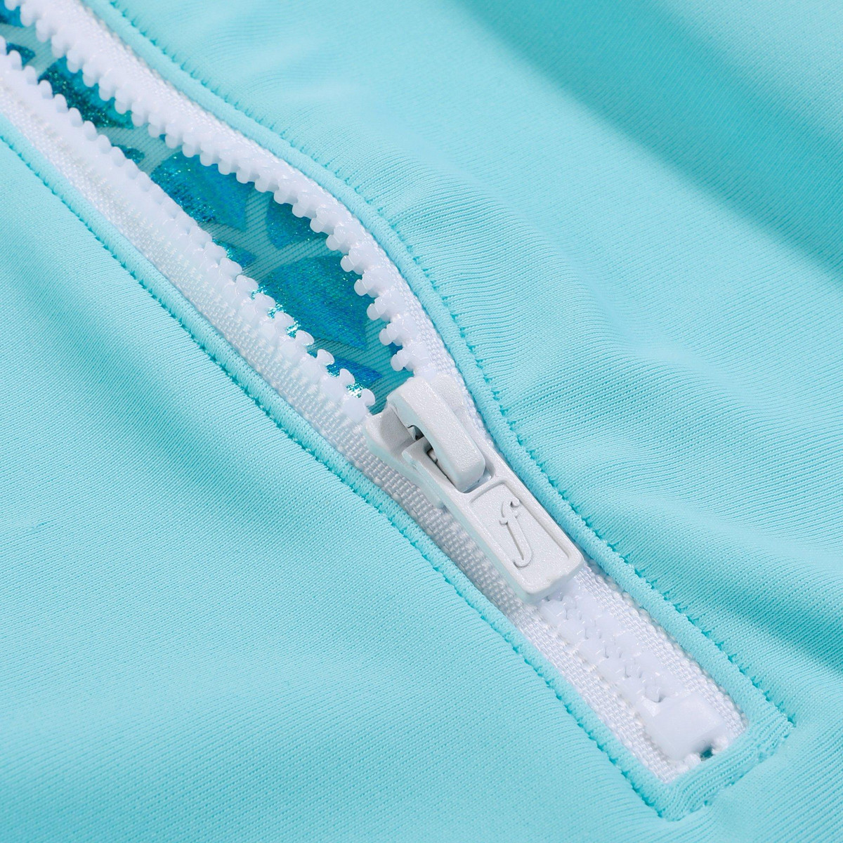 Make a splash in our Mermaid Rash Guard Swimsuit! Featuring UPF 50+ sun protection, a 3/4-zip front with a chin guard, and dazzling foil scale print raglan sleeves. Fully lined for comfort and crafted with stretch for the perfect fit. Fabrication: 86% polyester, 14% spandex. Lining: 100% polyester.