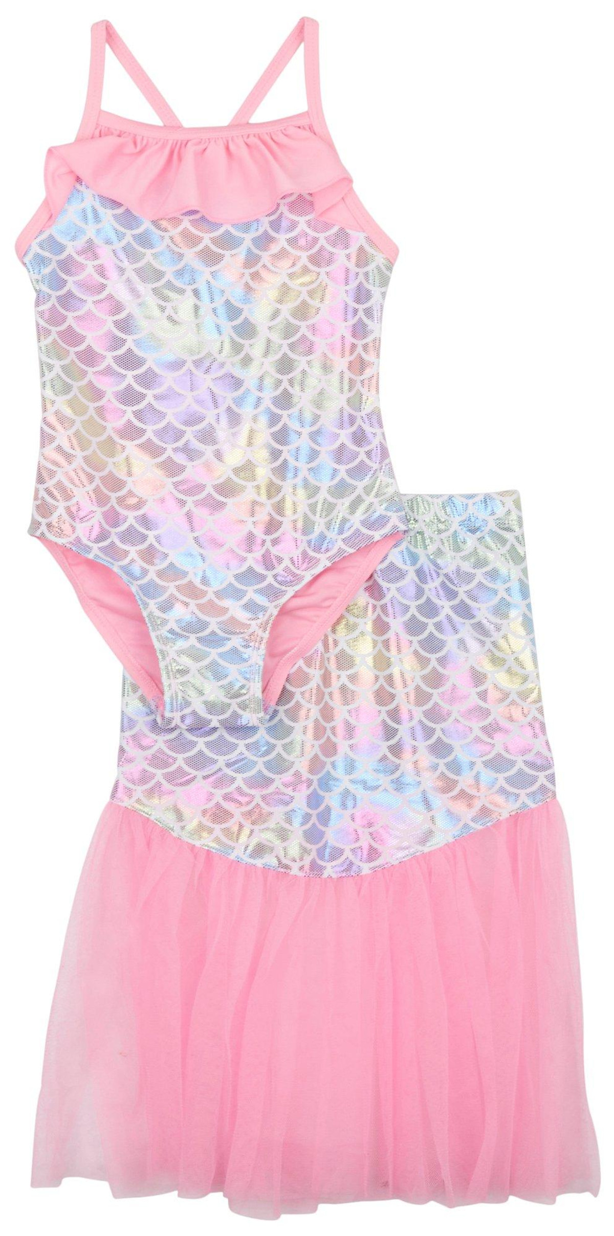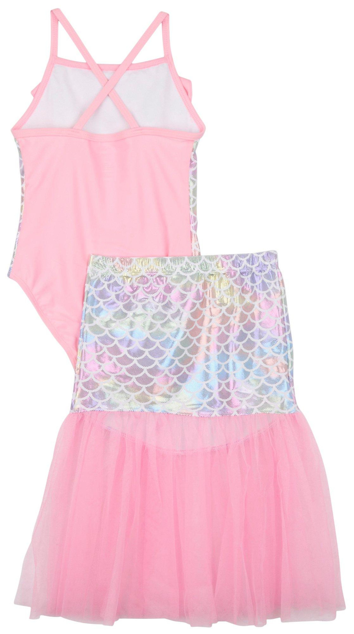 This 2-piece mermaid swim set includes a mermaid tie dye design, back twist shoulder strap with upper ruffle styling, and a coordinating mermaid tutu skirt. Fabrication 86% polyester, 14% spandex, and 100% polyester skirt lining.