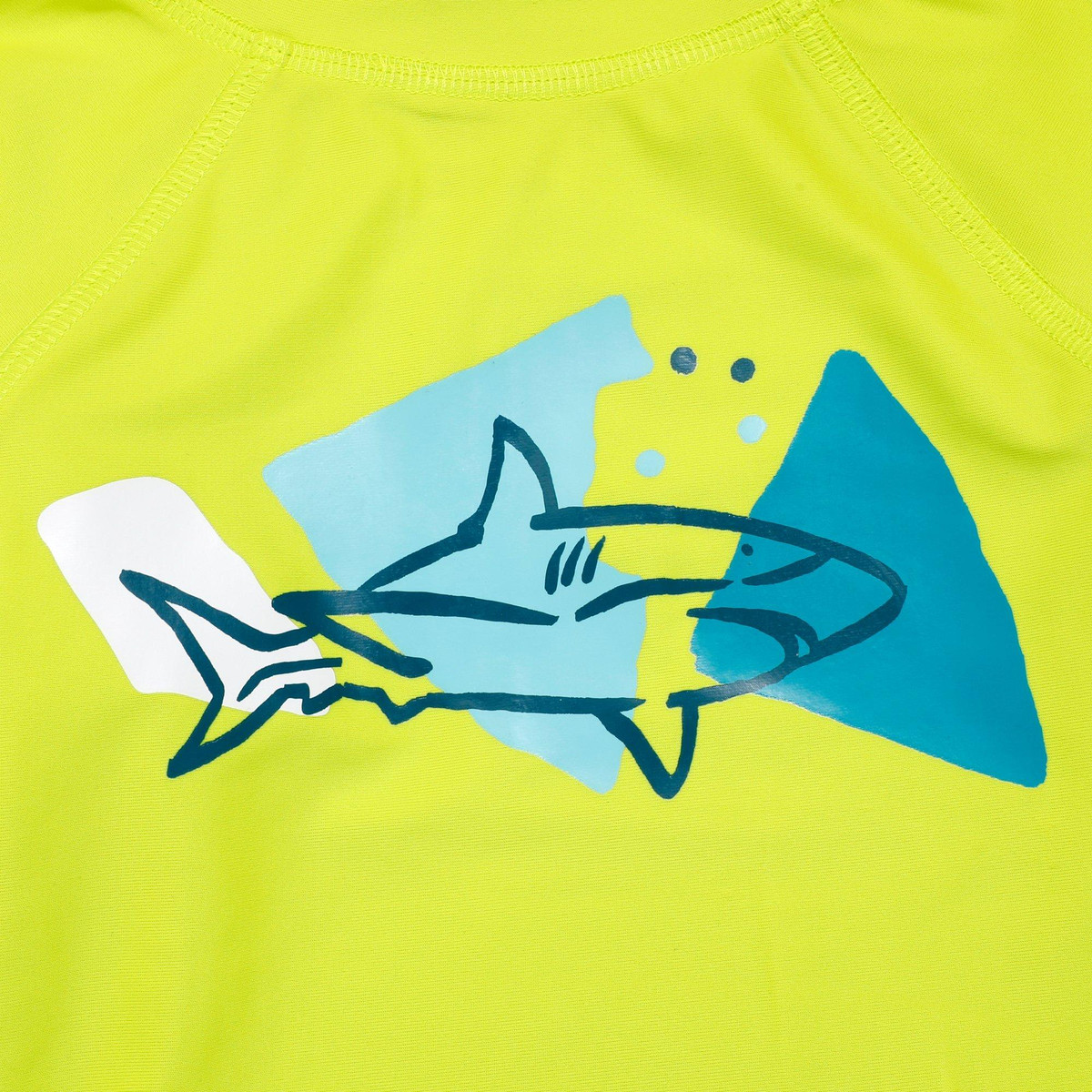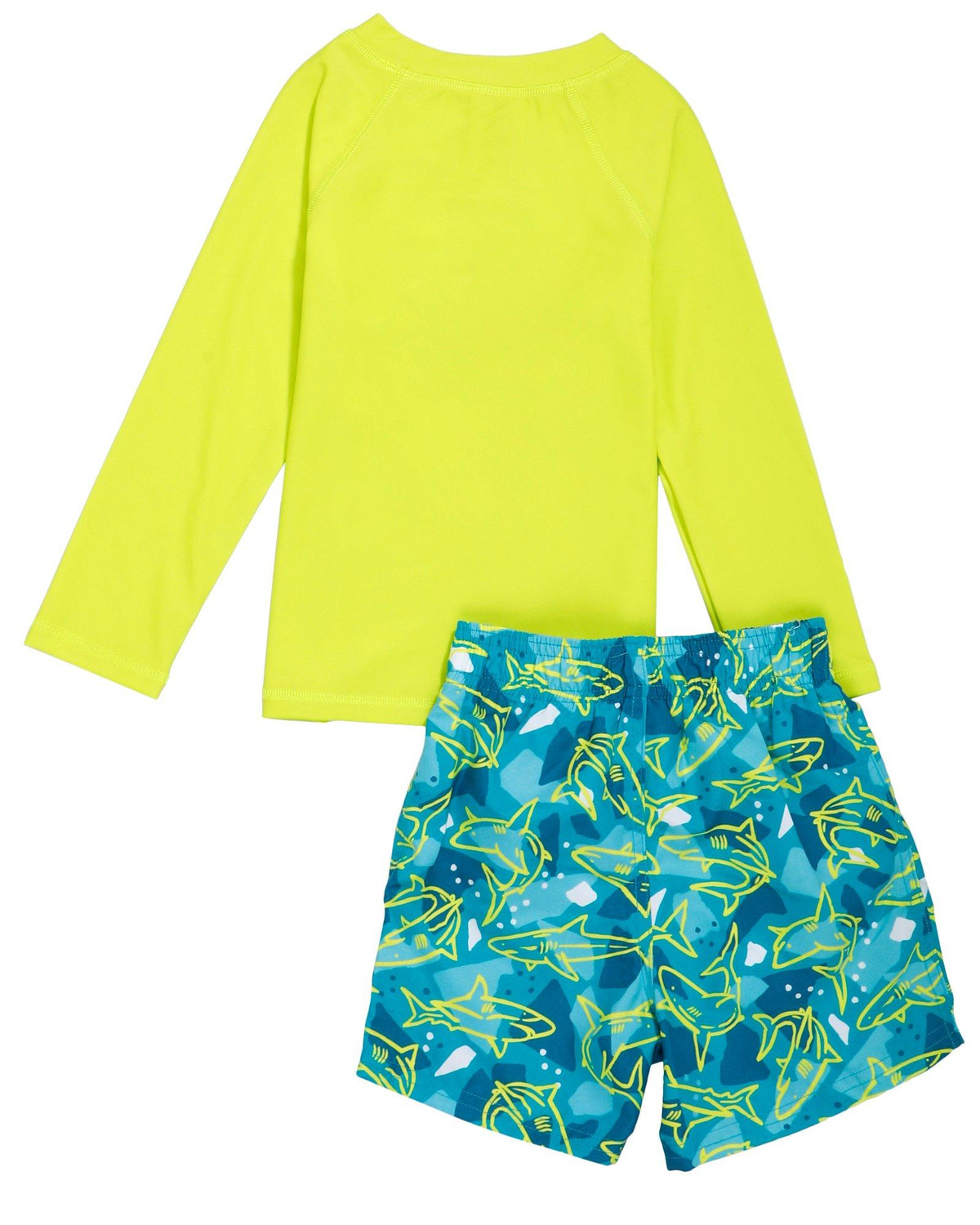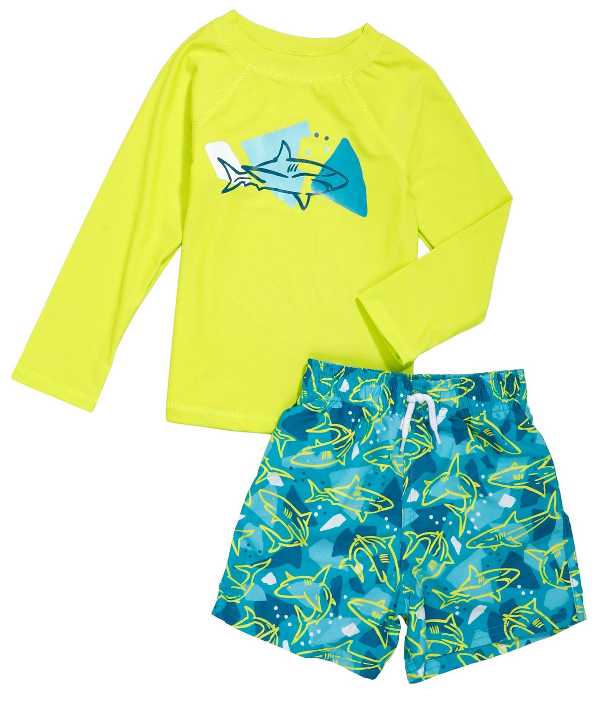 Introducing the Toddler Boys 2 Pc Swim Shorts Set, perfect for sunny days at the beach or pool. This set includes a long sleeve rash guard with a fun shark print, offering UPF 50+ protection to keep your little one safe from the sun. The matching shark print swim shorts complete the look, making it both stylish and practical for water adventures.