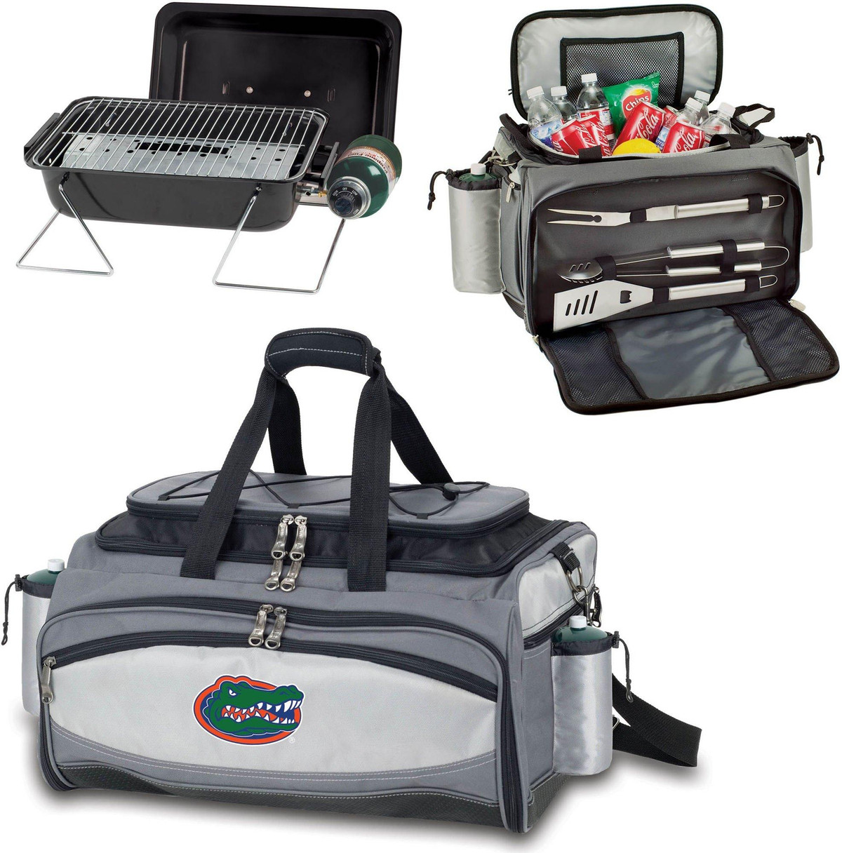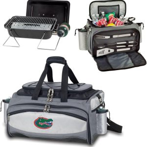 Tailgating set features cooler that measures 16” x 8” x 7” and holds 24 cans. Tote includes: portable LP (propane not included) grill with lid (16.7” x 10.8” x 5.1”), drawstring bag, spatula with bottle opener, grill scraper, and serrated edge, tongs, and BBQ fork.